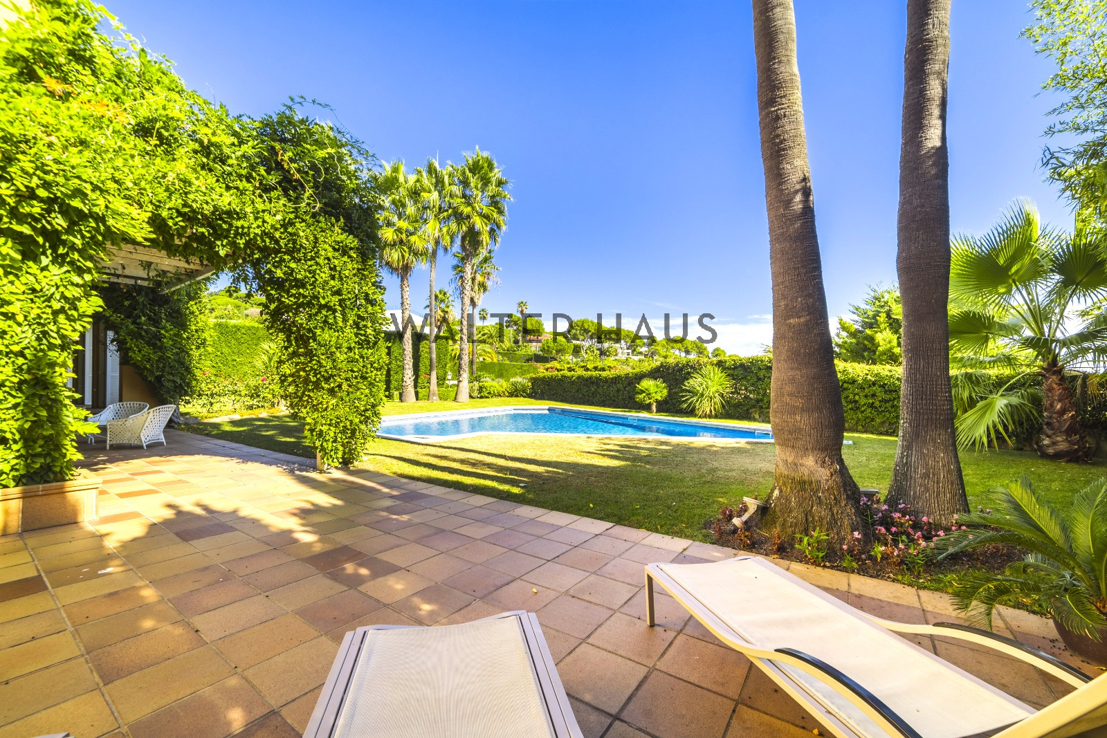 Rodeada de un jardín maduro con palmeras, césped natural y vegetación mediterránea, su arquitectura combina amplitud, luminosidad y una cuidada integración con el entorno natural, destacando por su privacidad y sus vistas al Mediterráneo.