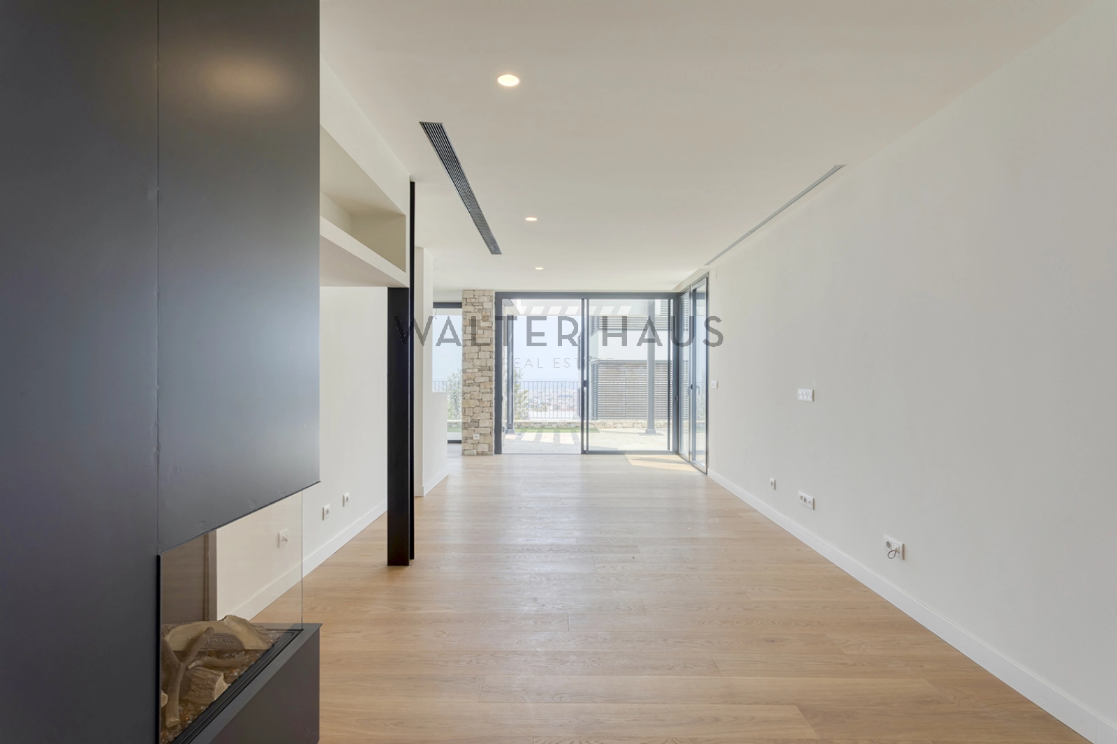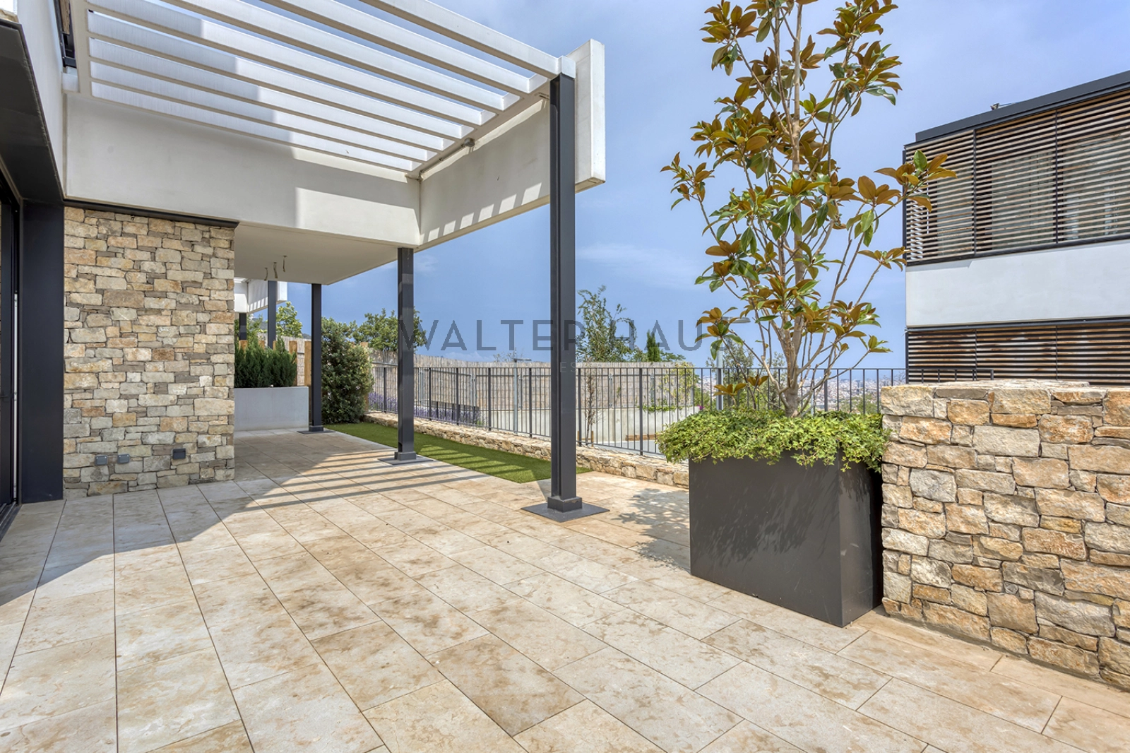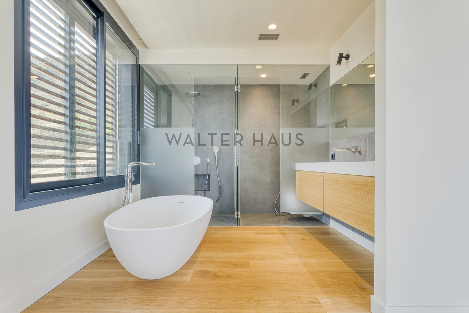Con su estructura de hormigón, encontramos una mezcla de piedra natural, grandes ventanales y contraventanas correderas de madera que nos permiten jugar con la luz. En el suelo tenemos un parquet natural de roble, con calefacción radiante. La casa también tiene aire acondicionado y carpintería de aluminio de máxima calidad.
