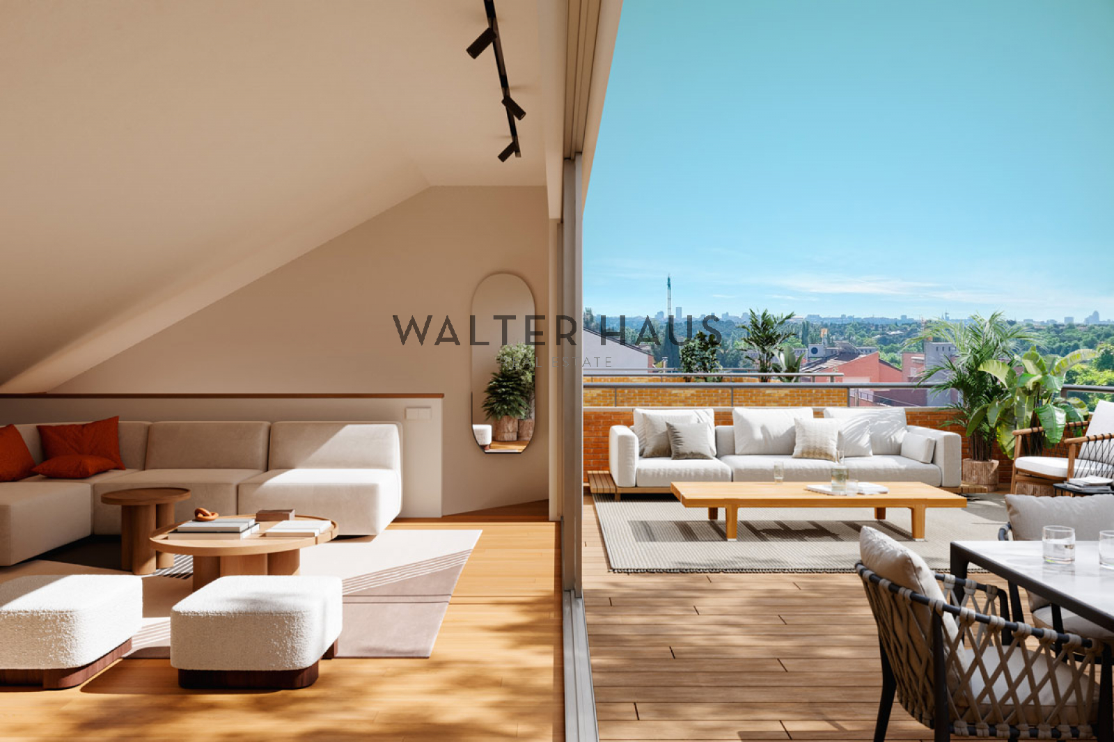 La propiedad se complementa con una funcional planta sótano, que cuenta con una práctica plaza de garaje, un cuarto de servicio con su baño y una zona de lavandería, optimizando las tareas del hogar. En la cuarta planta, actualmente un salón con terraza, se llevará a cabo una reforma para crear un dormitorio principal con acceso a una amplia terraza, brindando una suite privada y luminosa. La vivienda está equipada con sistemas de calefacción y aire acondicionado por aerotermia, lo que asegura un alto confort térmico y eficiencia energética.