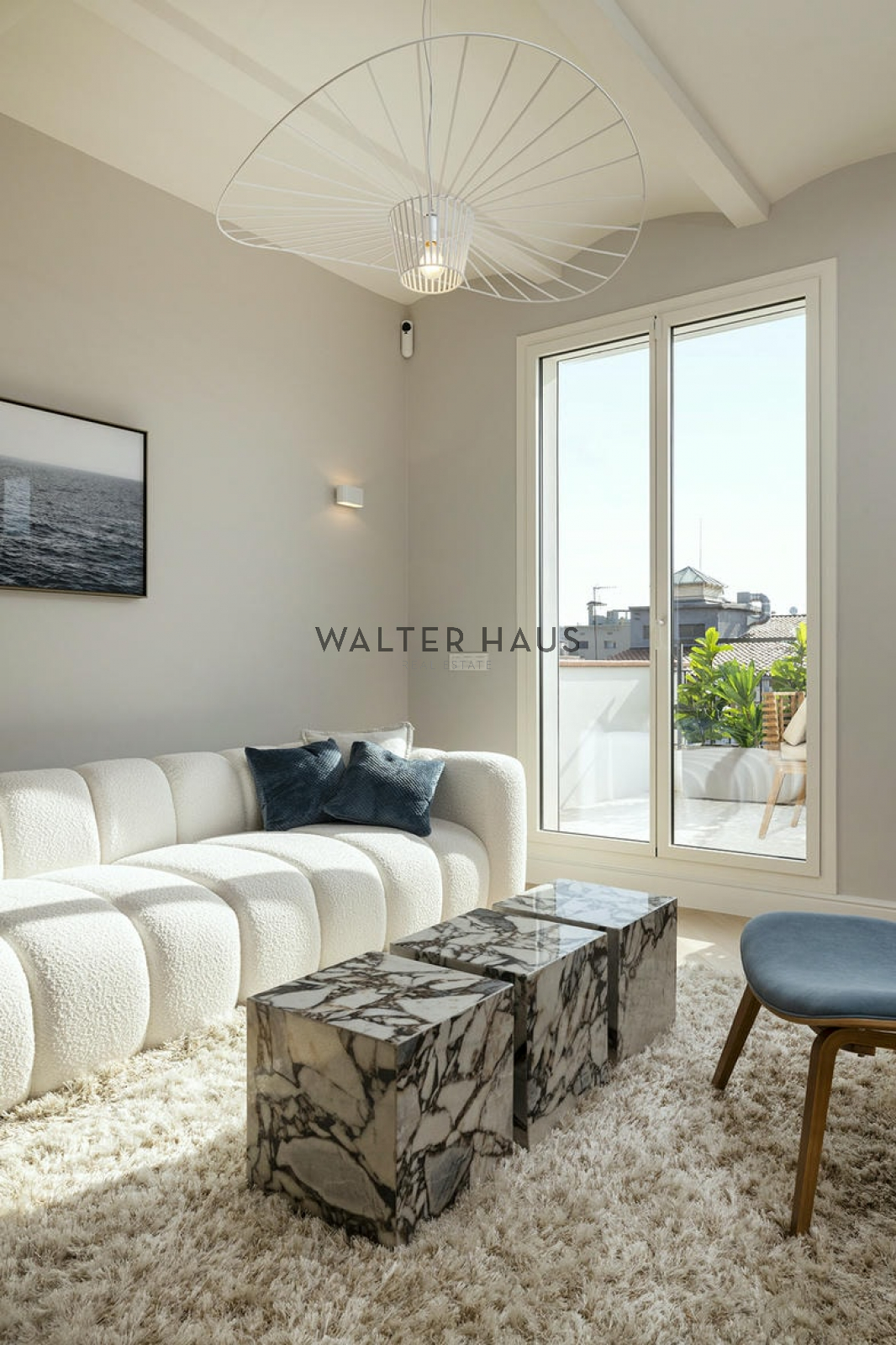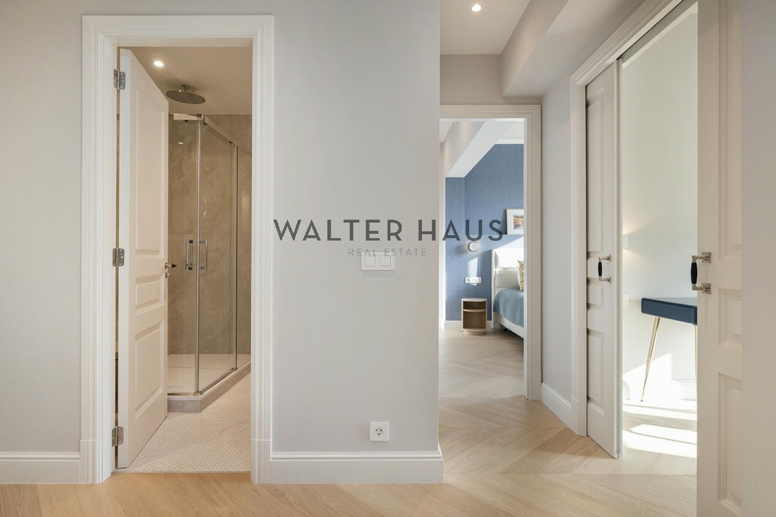 La distribución comienza con la zona de día, compuesta por un amplio y luminoso salón integrado con una cocina abierta totalmente equipada. Con acceso directo a la terraza que amplía la sensación de apertura, este espacio es perfecto para reuniones sociales y momentos de relax. Definida por una elegante escalera interior, encontramos la zona de noche, compuesta por dos dormitorios dobles que comparten un baño y una suite principal con vestidor y baño privado. Todos los dormitorios tienen acceso directo a un balcón de 5 m², que proporciona un toque adicional de frescura y luminosidad.