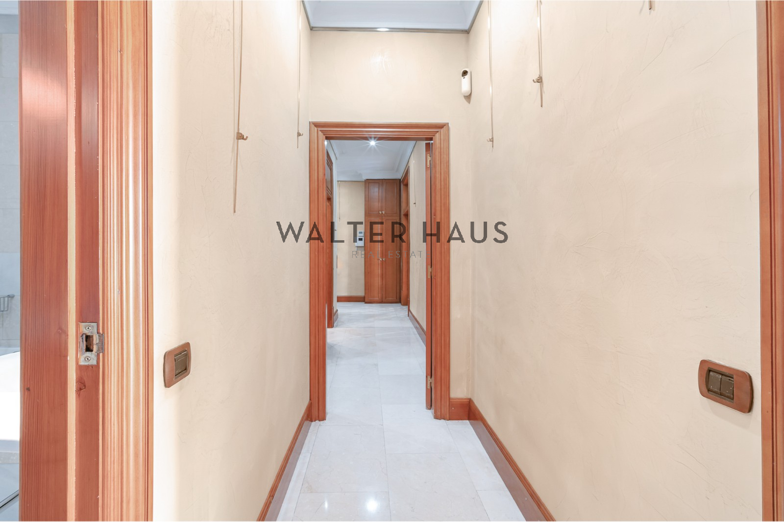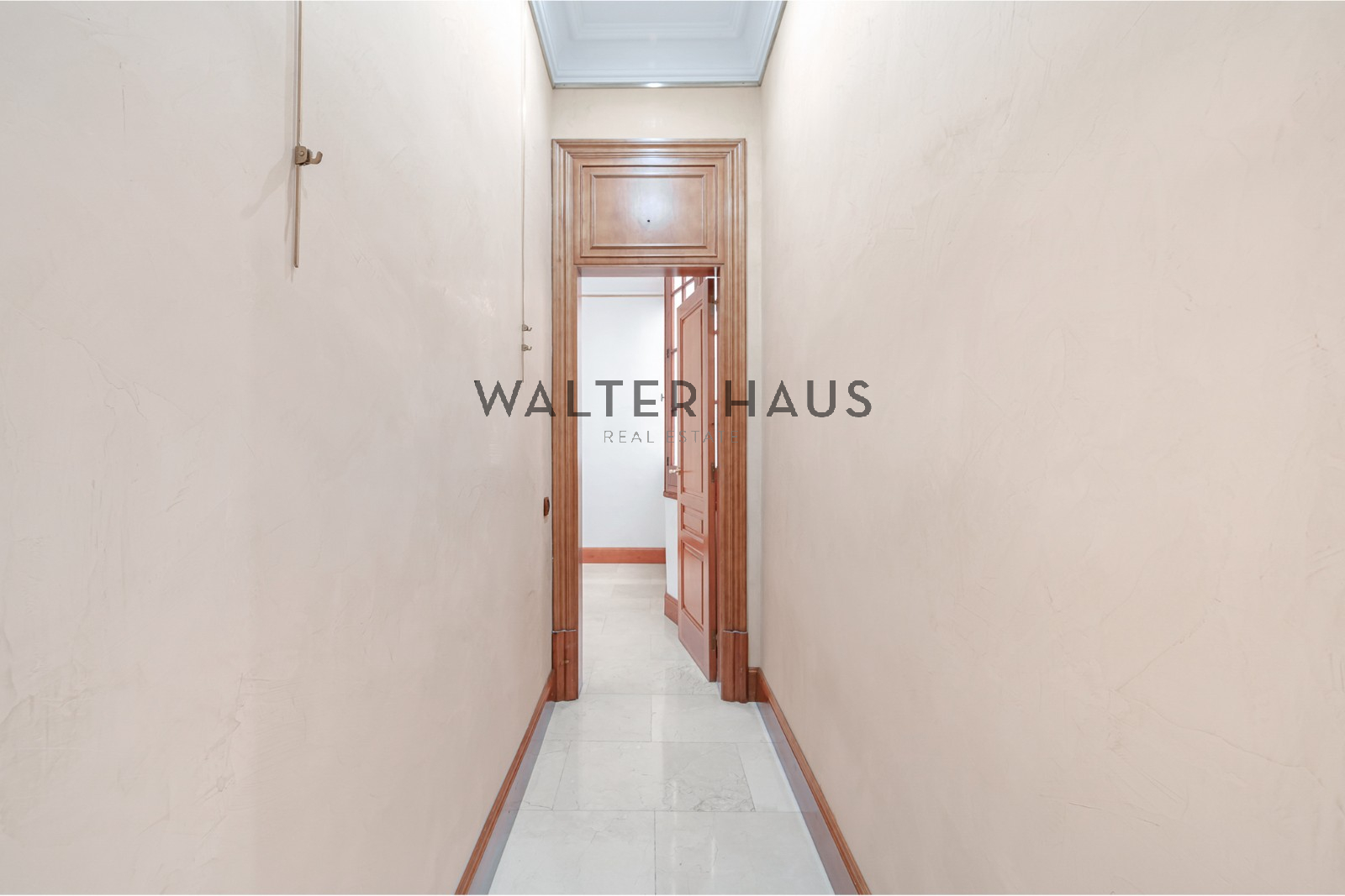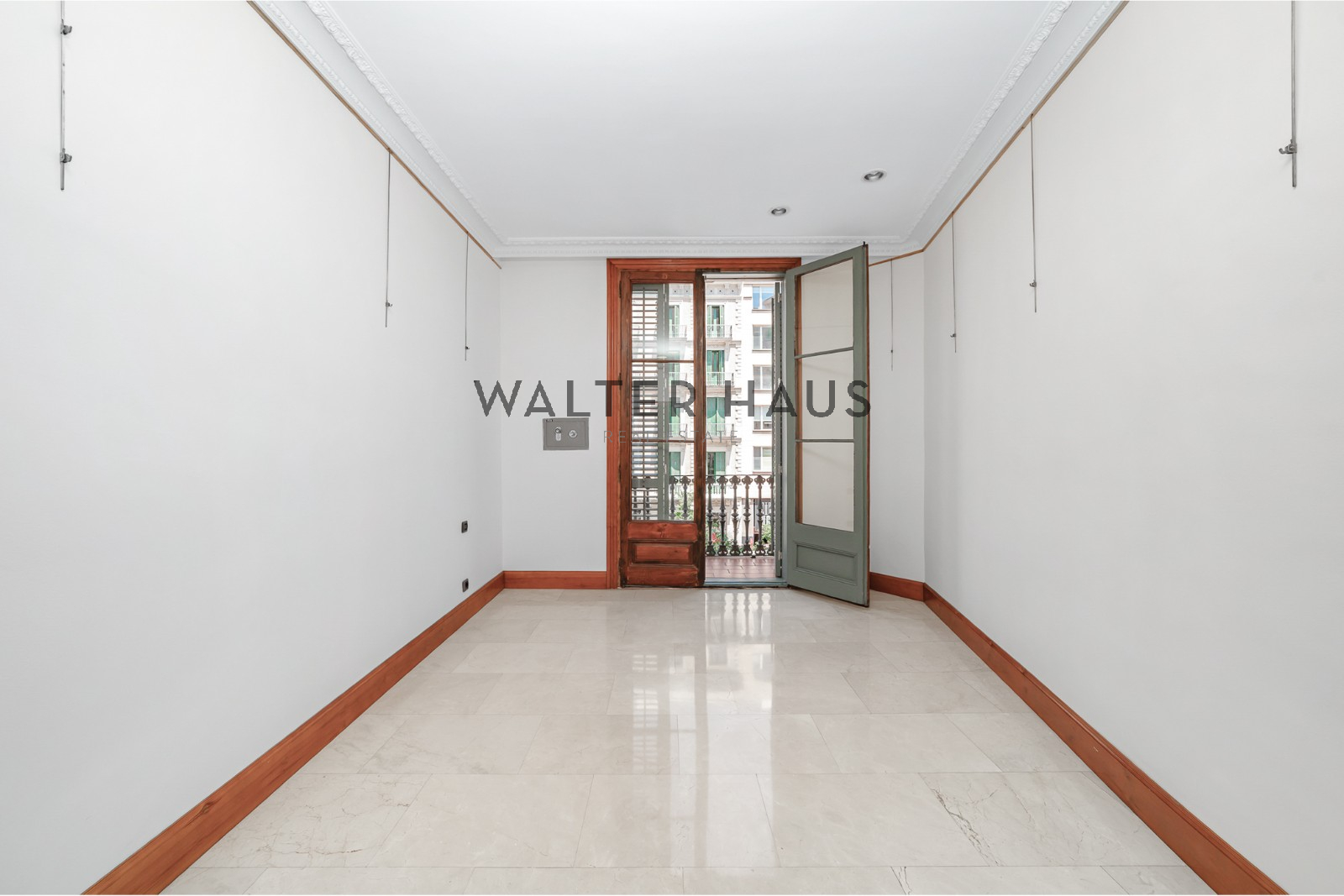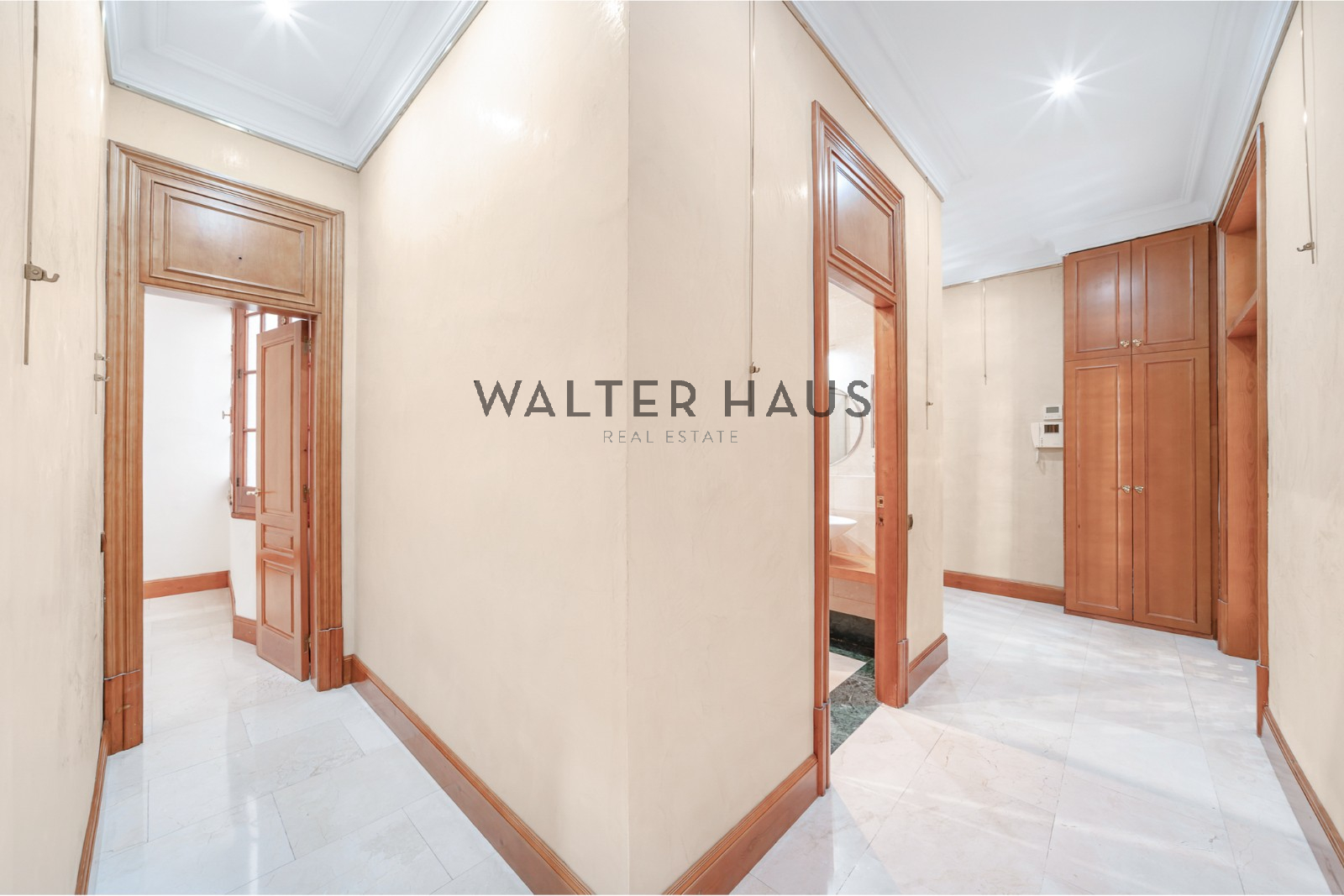 El piso cuenta con un amplio salón con salida a dos balcones exteriores que llenan el espacio de luz natural y ofrecen vistas despejadas a Rambla de Catalunya. La cocina independiente es amplia y funcional, y el comedor, insonorizado, es ideal tanto para celebraciones privadas como para teletrabajo. La zona de descanso se compone de tres dormitorios —dos dobles y uno individual— con armarios empotrados y acabados de alta calidad, además de un dormitorio adicional junto a la entrada actualmente acondicionado como vestidor. Dispone de dos baños completos, y los suelos de mármol travertino en tonos beige aportan coherencia y calidez a cada estancia.