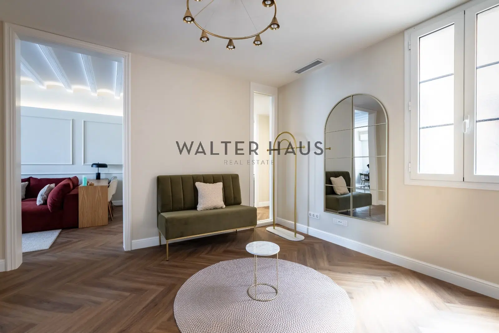 En una elegante finca regia de 1840, se encuentra esta luminosa vivienda de 137,8 m² construidos, cuidadosamente reformada para ofrecer confort y estilo. Ubicada en una segunda planta real, la propiedad destaca por su amplitud, techos altos con molduras originales y volta catalana, así como un salón-comedor con chimenea decorativa y salida a un agradable balcón exterior con vistas a palmeras.