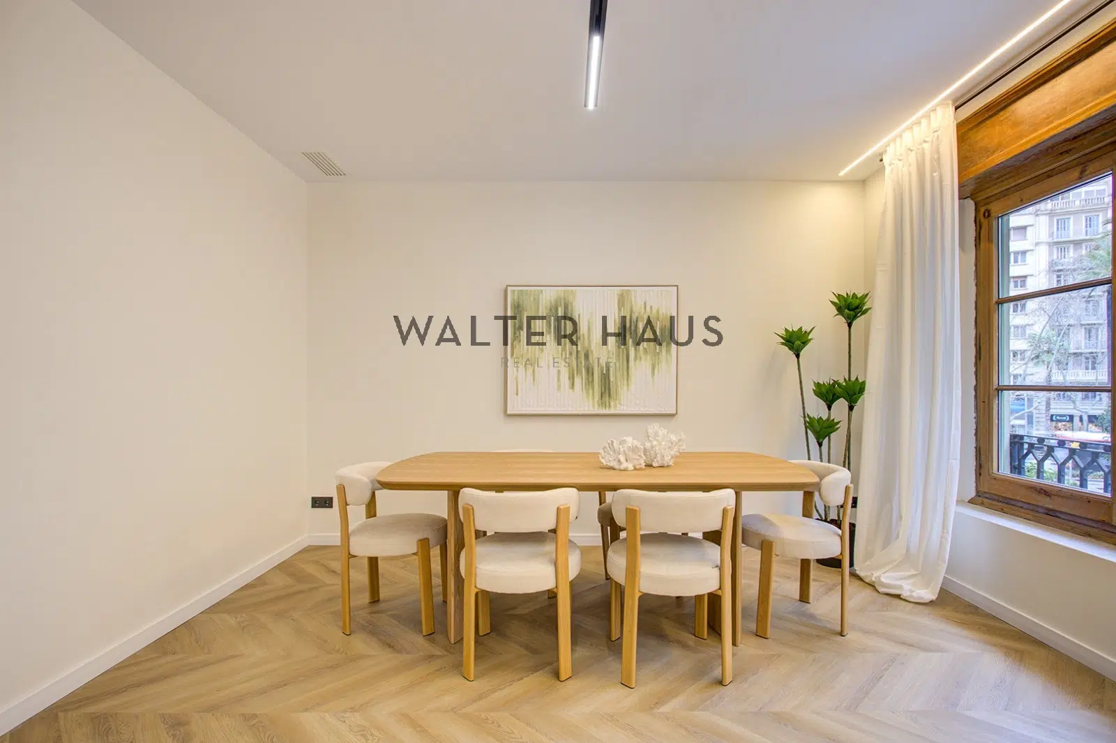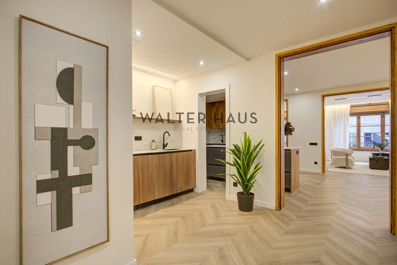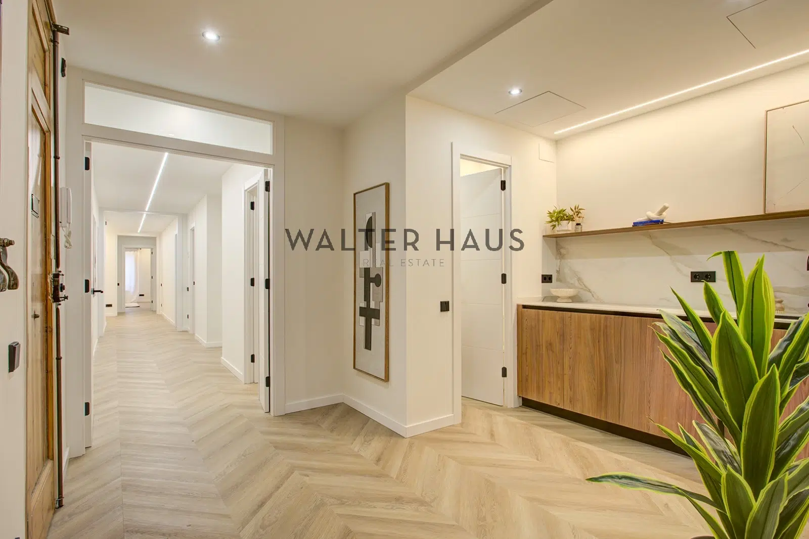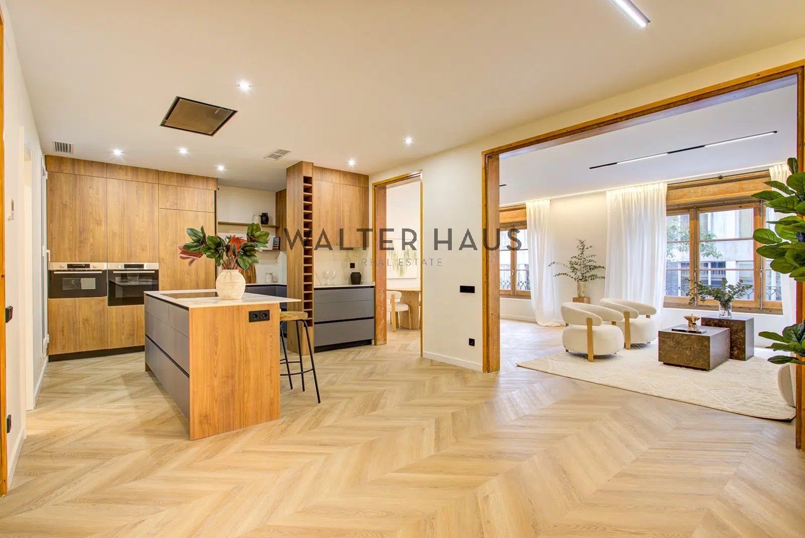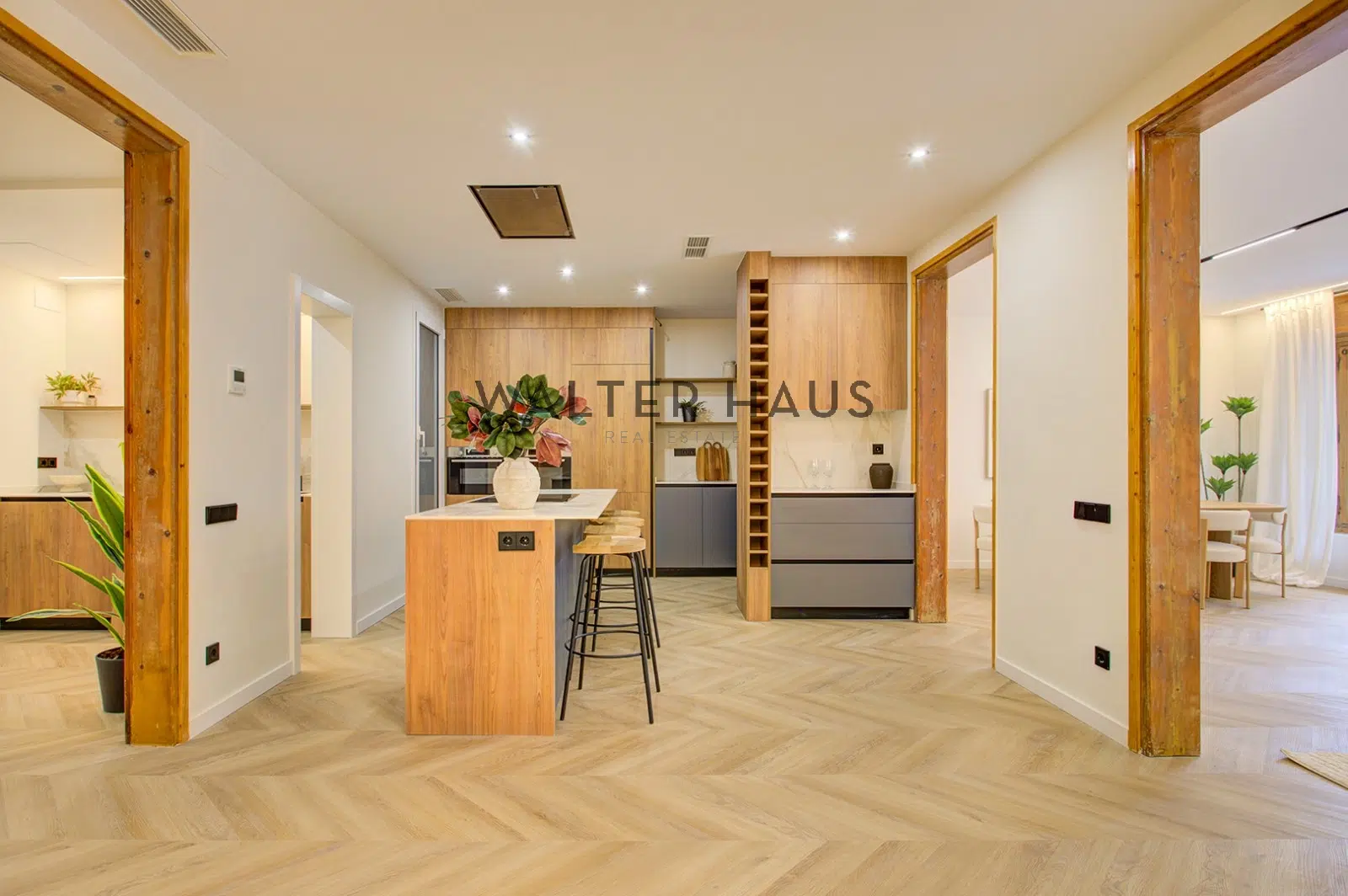 La zona de noche alberga cuatro amplias habitaciones dobles, incluyendo una elegante suite principal con vestidor y baño privado. El resto de dormitorios cuentan con generosas dimensiones y se complementan con dos baños completos adicionales, todos ellos con acabados de alta gama. La vivienda dispone además de un espacio polivalente ideal como despacho, home office o habitación de servicio, muy valorado tanto por familias como por compradores internacionales. Dos patios interiores aportan luz natural, ventilación cruzada y una agradable sensación de calma y privacidad en todas las estancias, creando un hogar equilibrado y silencioso en pleno centro urbano. La reforma se ha realizado con materiales premium y un cuidado diseño contemporáneo que respeta el carácter del Eixample, incorporando suelos de madera natural en espiga, carpintería de primera calidad, grifería de diseño y acabados exclusivos en cocina y baños.