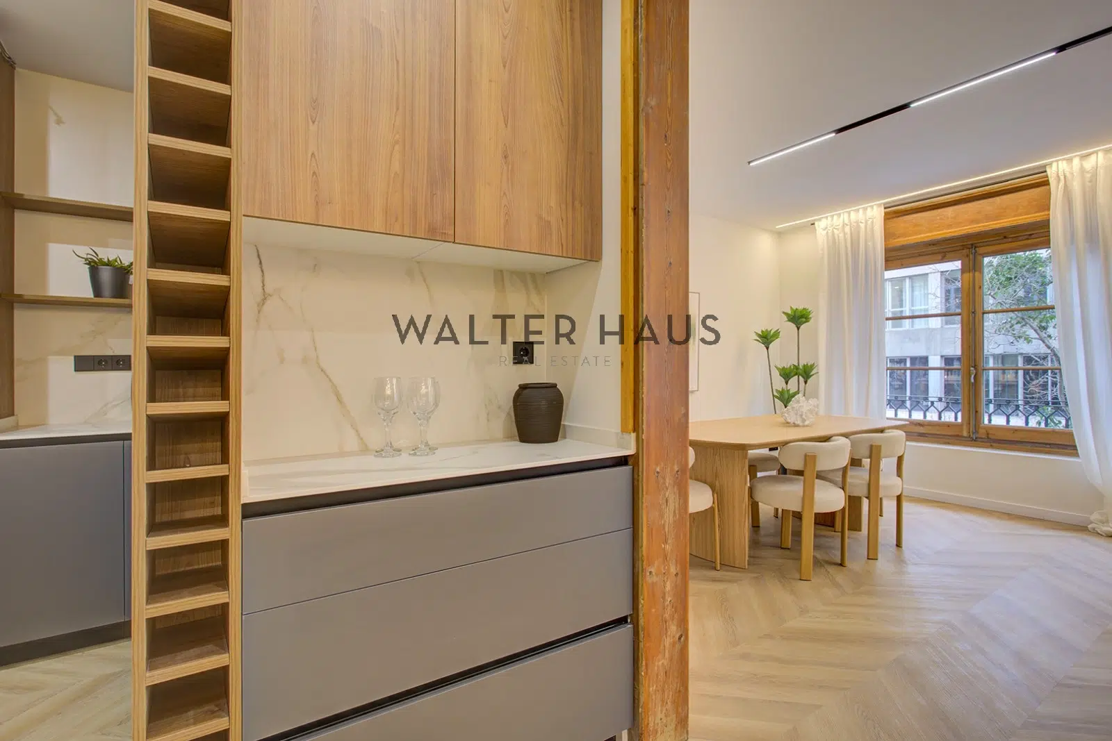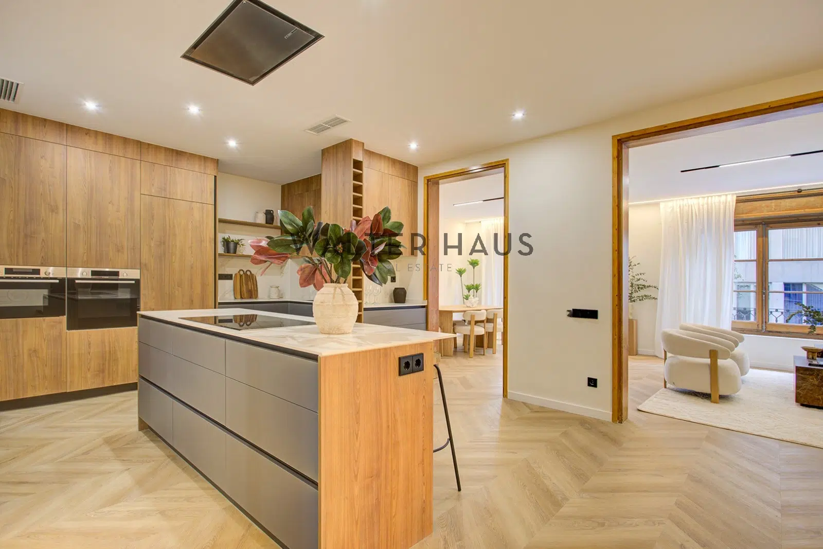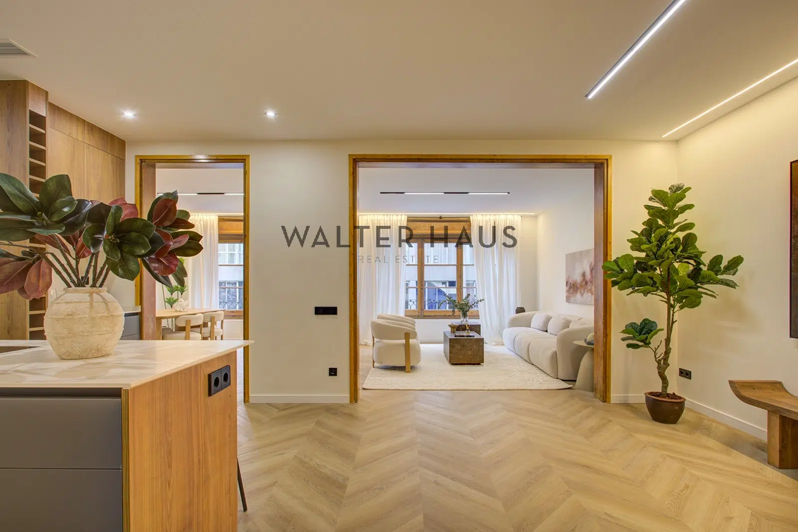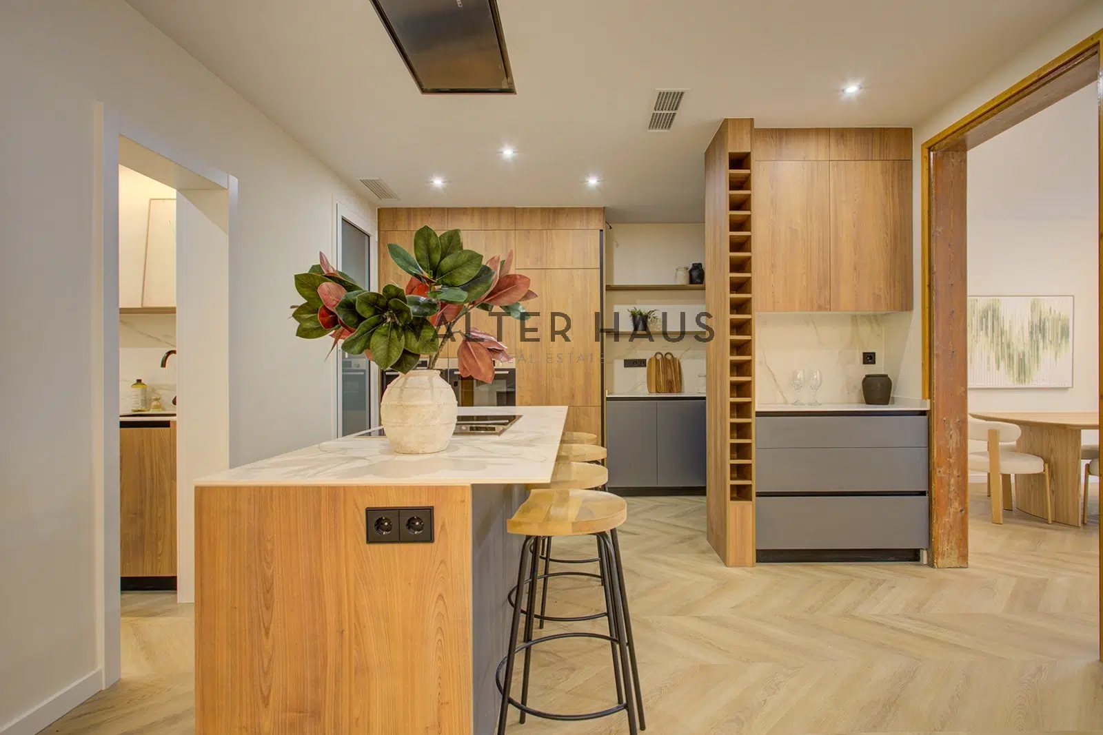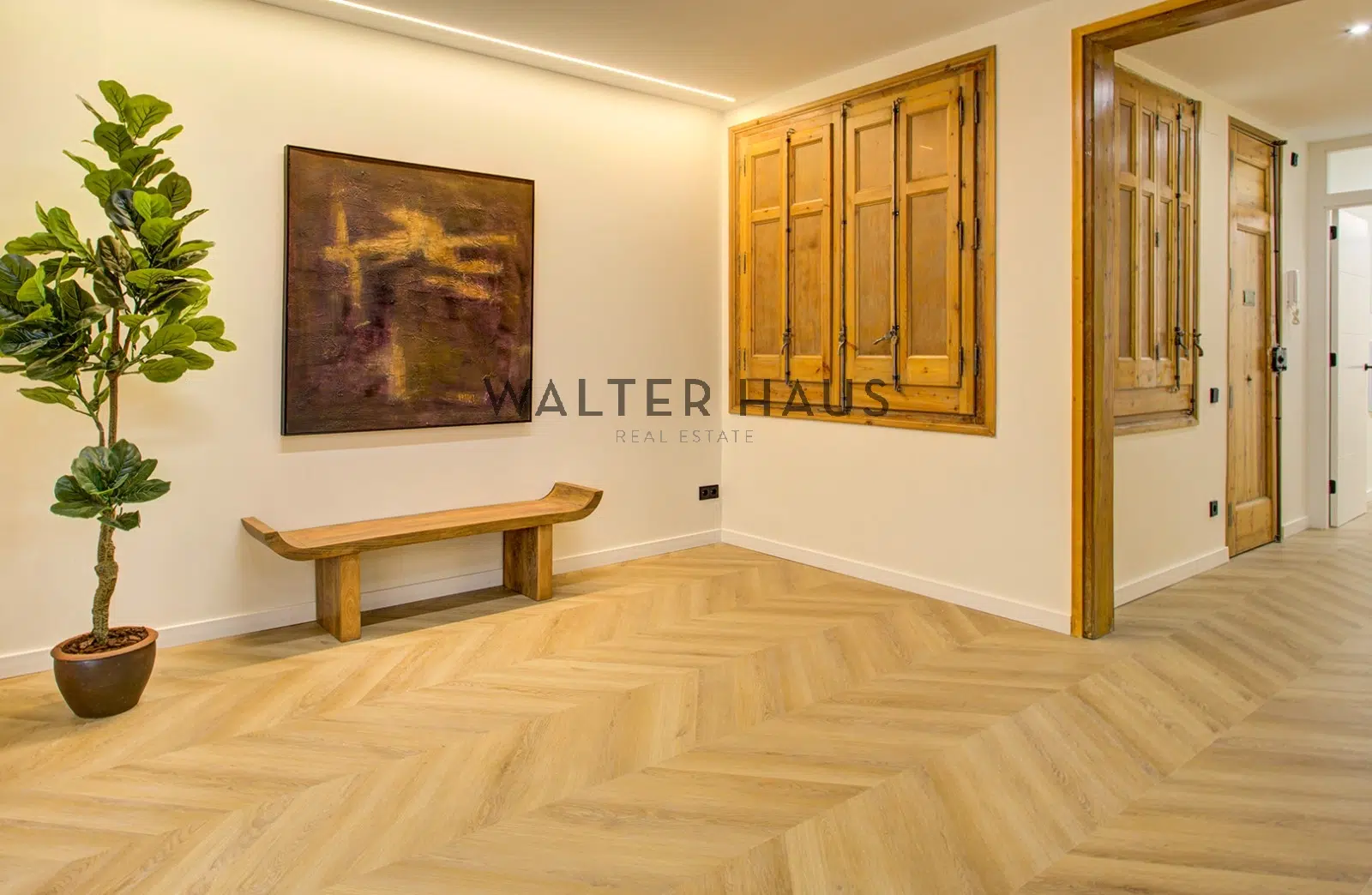 La zona de noche alberga cuatro amplias habitaciones dobles, incluyendo una elegante suite principal con vestidor y baño privado. El resto de dormitorios cuentan con generosas dimensiones y se complementan con dos baños completos adicionales, todos ellos con acabados de alta gama. La vivienda dispone además de un espacio polivalente ideal como despacho, home office o habitación de servicio, muy valorado tanto por familias como por compradores internacionales. Dos patios interiores aportan luz natural, ventilación cruzada y una agradable sensación de calma y privacidad en todas las estancias, creando un hogar equilibrado y silencioso en pleno centro urbano. La reforma se ha realizado con materiales premium y un cuidado diseño contemporáneo que respeta el carácter del Eixample, incorporando suelos de madera natural en espiga, carpintería de primera calidad, grifería de diseño y acabados exclusivos en cocina y baños.