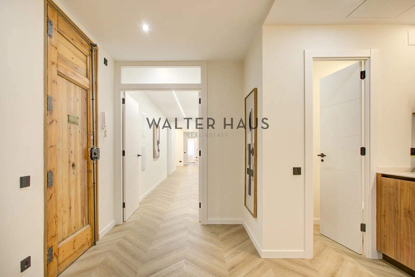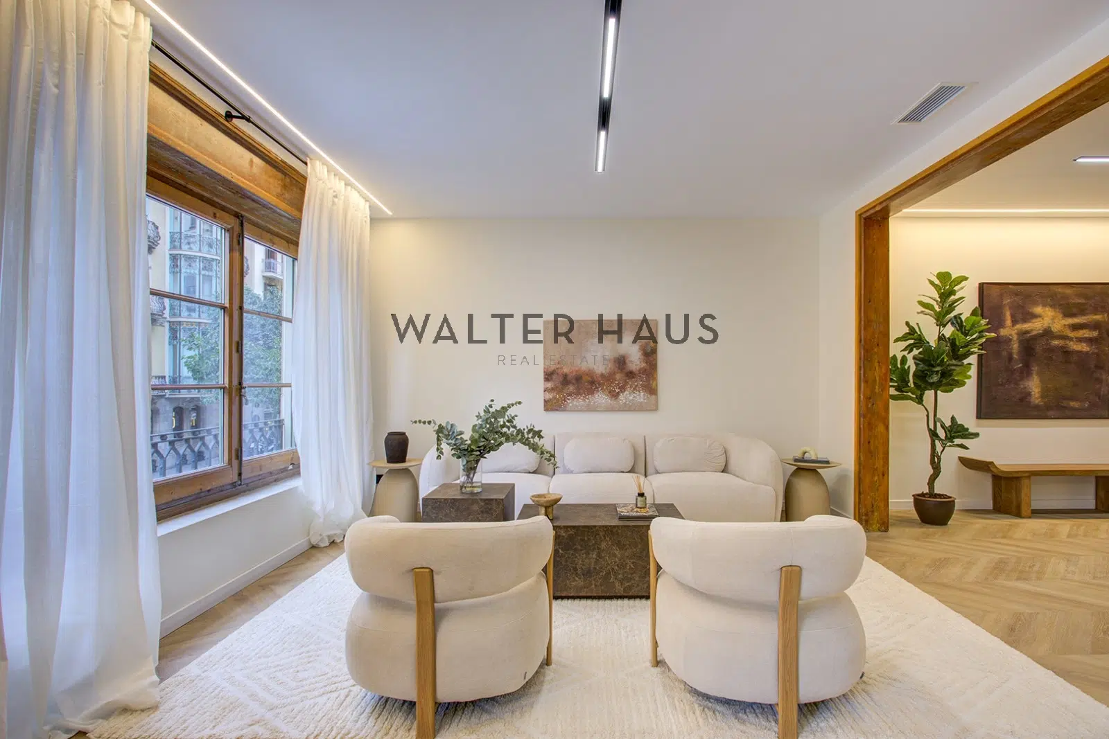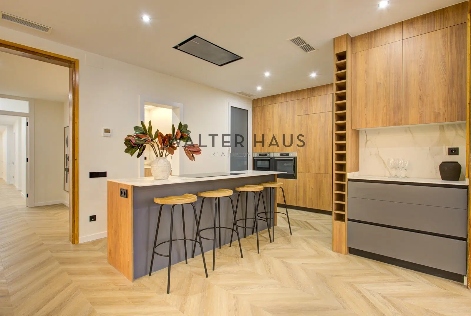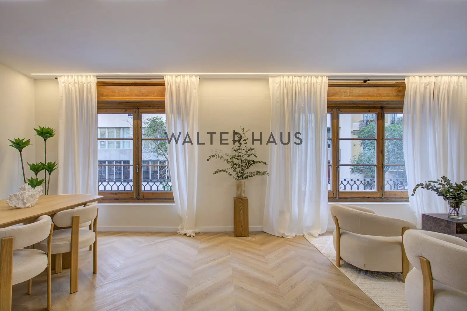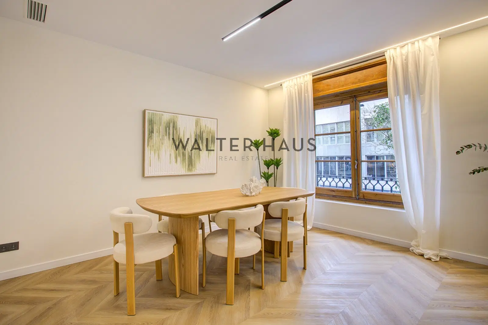 La zona de noche alberga cuatro amplias habitaciones dobles, incluyendo una elegante suite principal con vestidor y baño privado. El resto de dormitorios cuentan con generosas dimensiones y se complementan con dos baños completos adicionales, todos ellos con acabados de alta gama. La vivienda dispone además de un espacio polivalente ideal como despacho, home office o habitación de servicio, muy valorado tanto por familias como por compradores internacionales. Dos patios interiores aportan luz natural, ventilación cruzada y una agradable sensación de calma y privacidad en todas las estancias, creando un hogar equilibrado y silencioso en pleno centro urbano. La reforma se ha realizado con materiales premium y un cuidado diseño contemporáneo que respeta el carácter del Eixample, incorporando suelos de madera natural en espiga, carpintería de primera calidad, grifería de diseño y acabados exclusivos en cocina y baños.