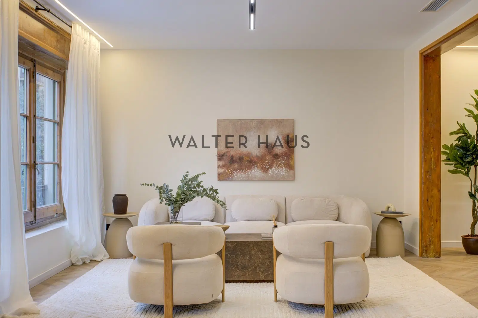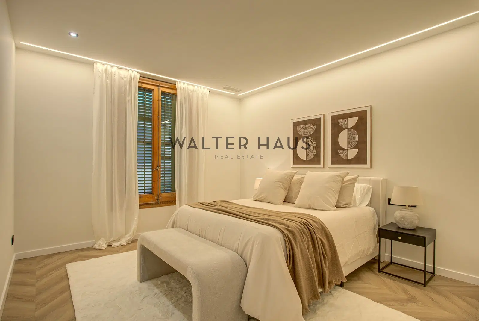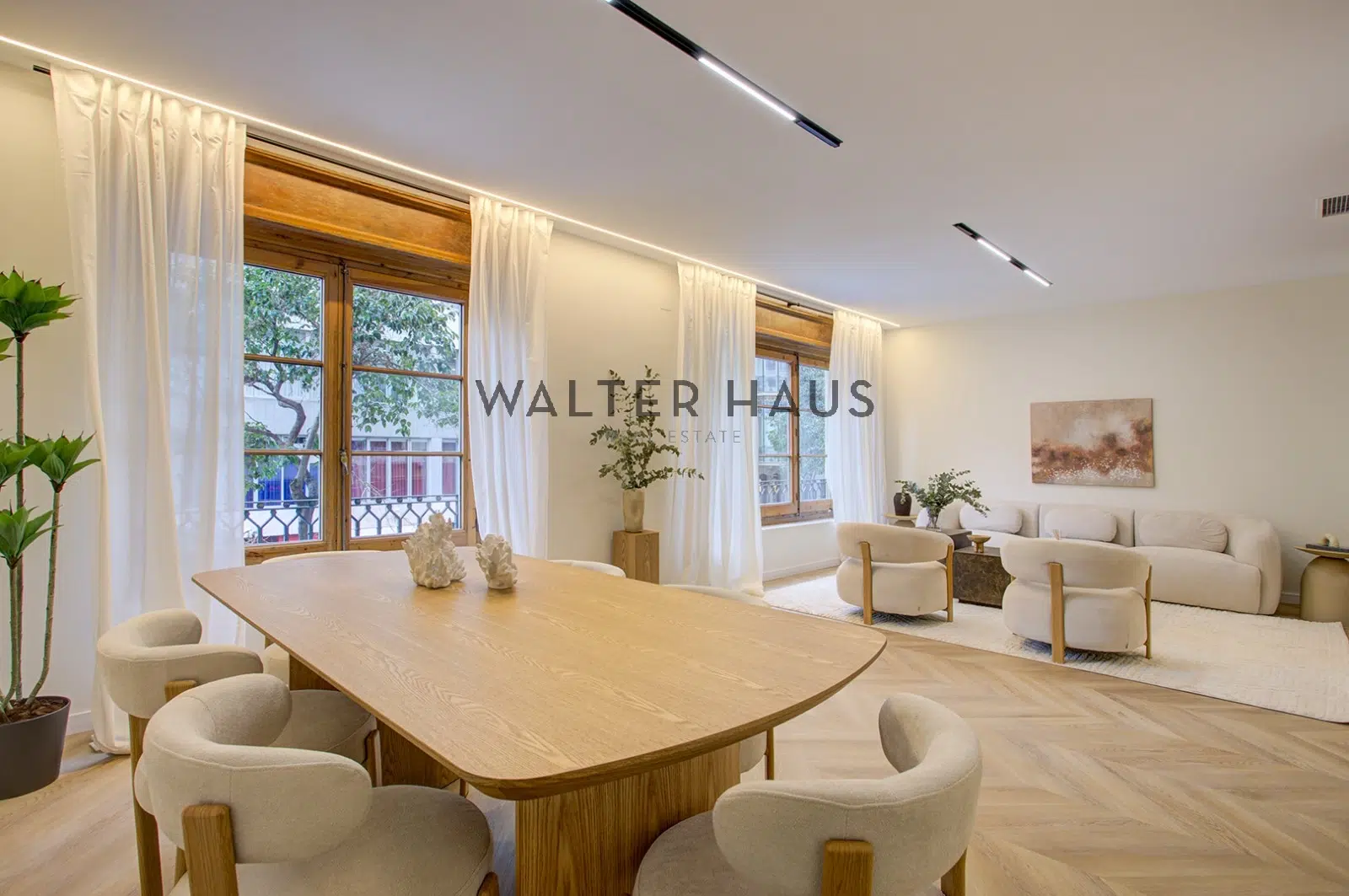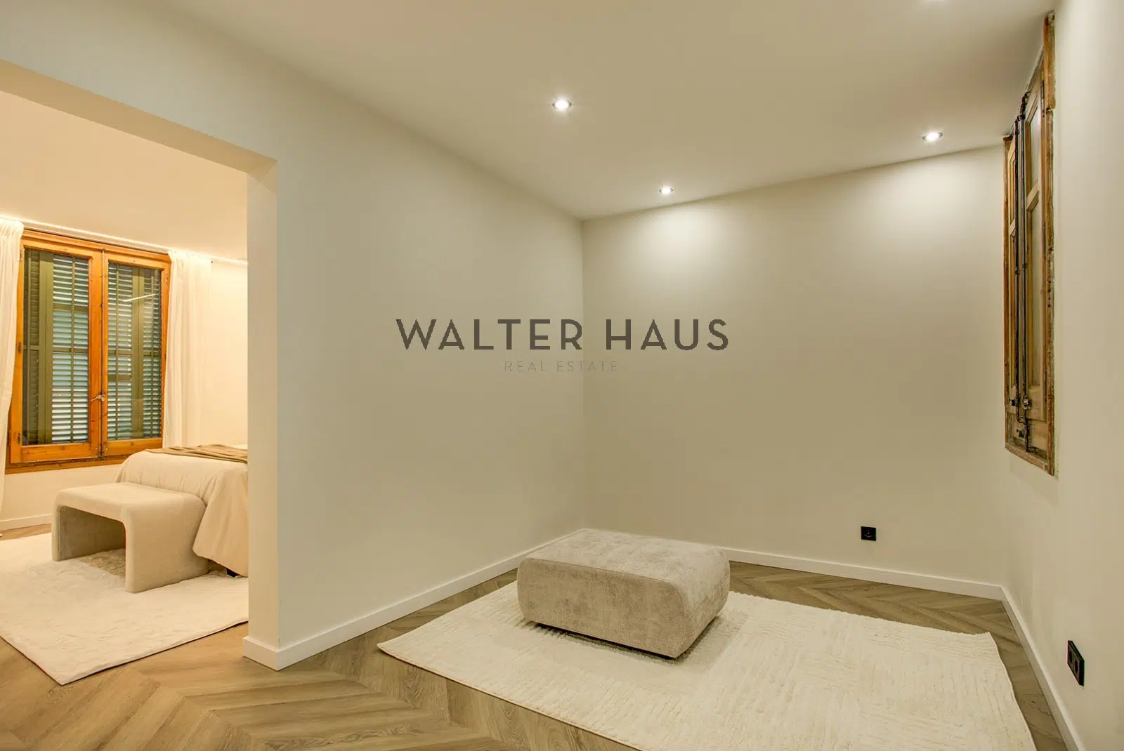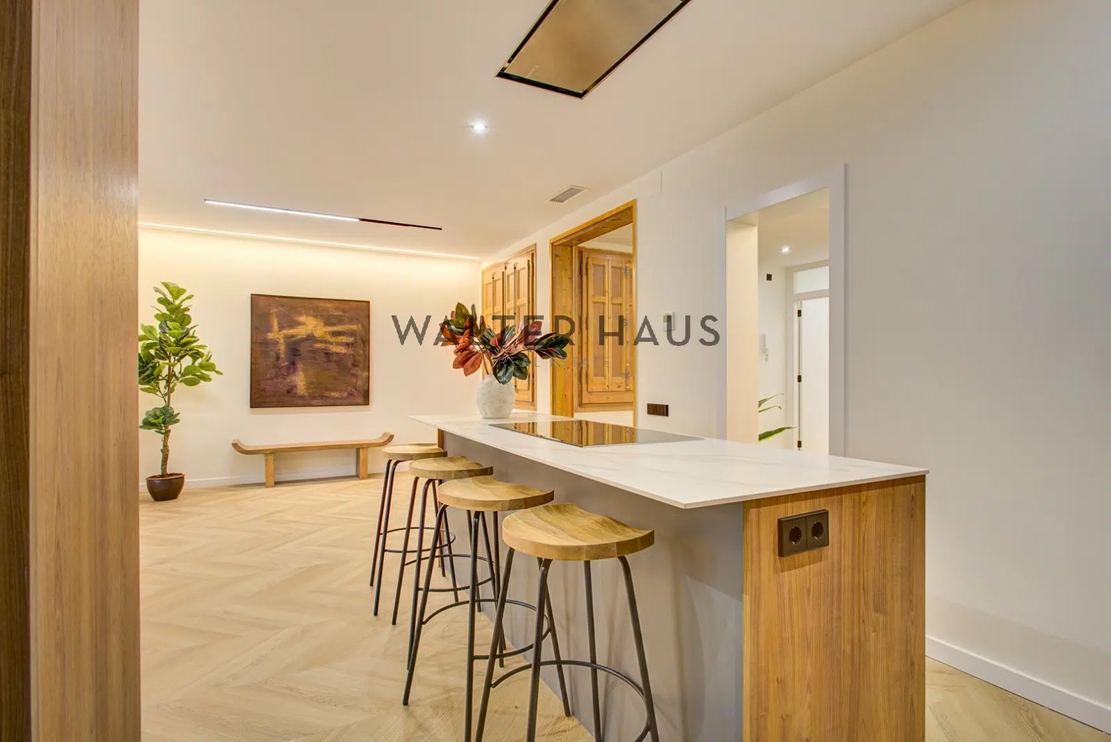 La zona de noche alberga cuatro amplias habitaciones dobles, incluyendo una elegante suite principal con vestidor y baño privado. El resto de dormitorios cuentan con generosas dimensiones y se complementan con dos baños completos adicionales, todos ellos con acabados de alta gama. La vivienda dispone además de un espacio polivalente ideal como despacho, home office o habitación de servicio, muy valorado tanto por familias como por compradores internacionales. Dos patios interiores aportan luz natural, ventilación cruzada y una agradable sensación de calma y privacidad en todas las estancias, creando un hogar equilibrado y silencioso en pleno centro urbano. La reforma se ha realizado con materiales premium y un cuidado diseño contemporáneo que respeta el carácter del Eixample, incorporando suelos de madera natural en espiga, carpintería de primera calidad, grifería de diseño y acabados exclusivos en cocina y baños.