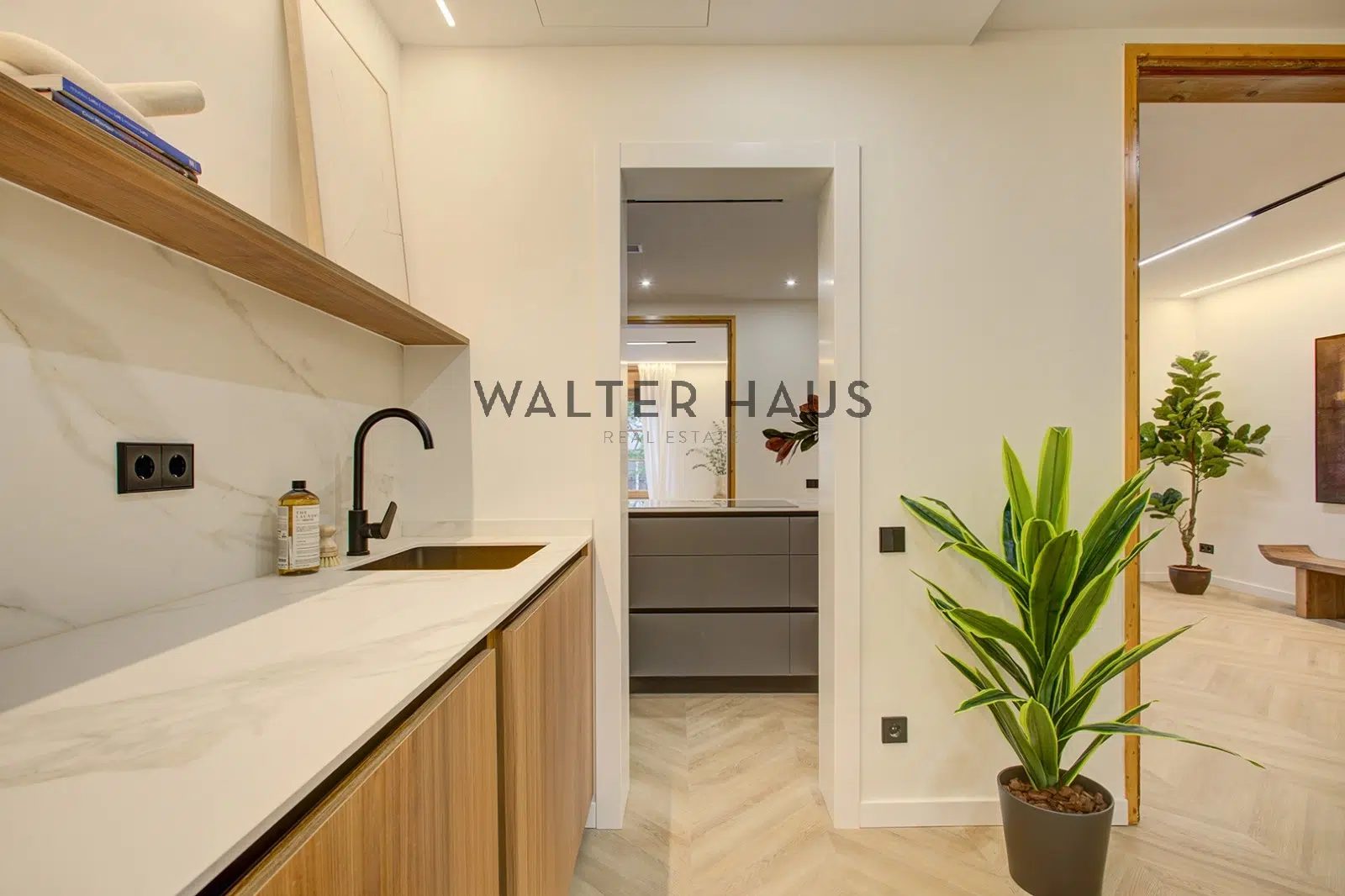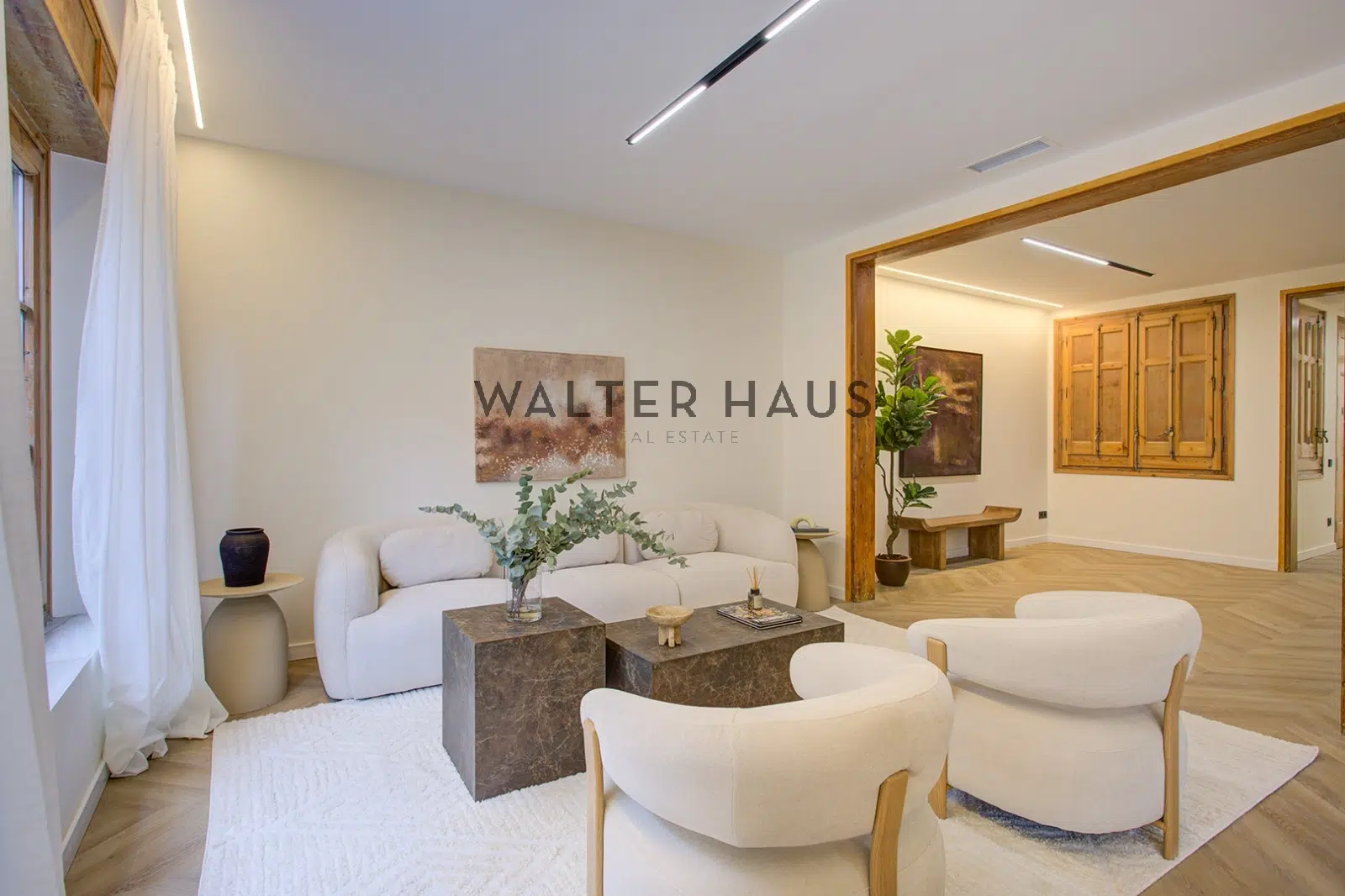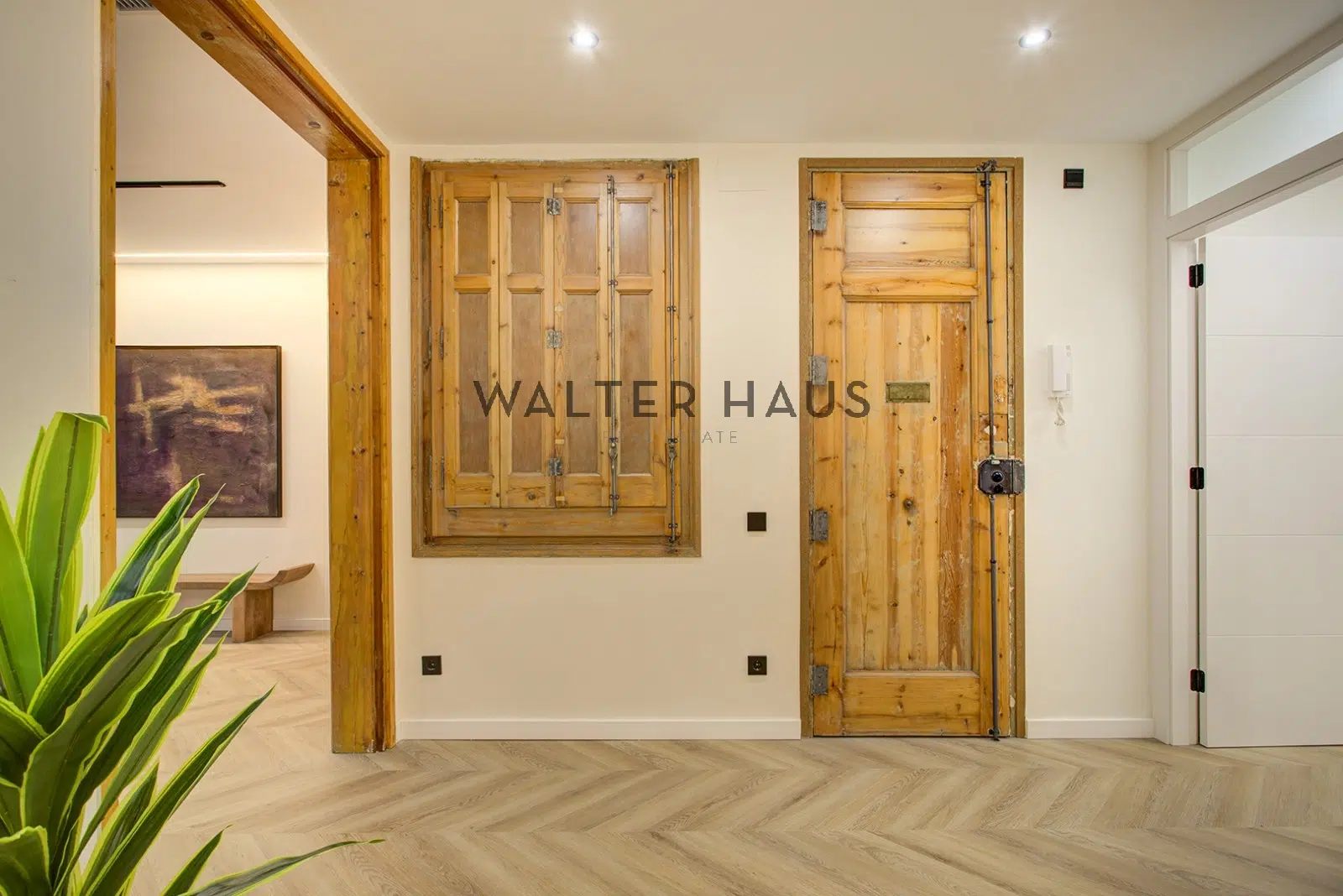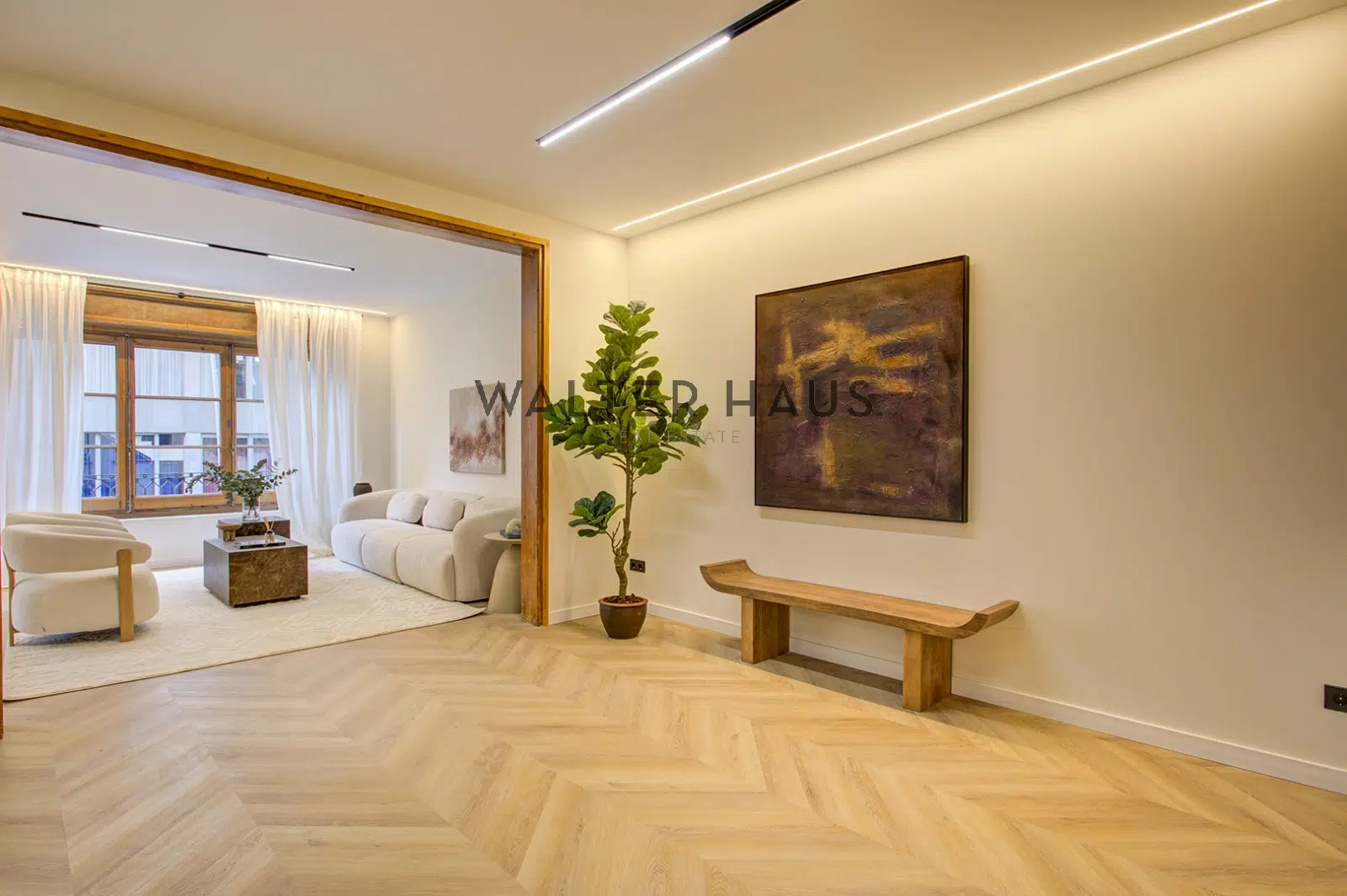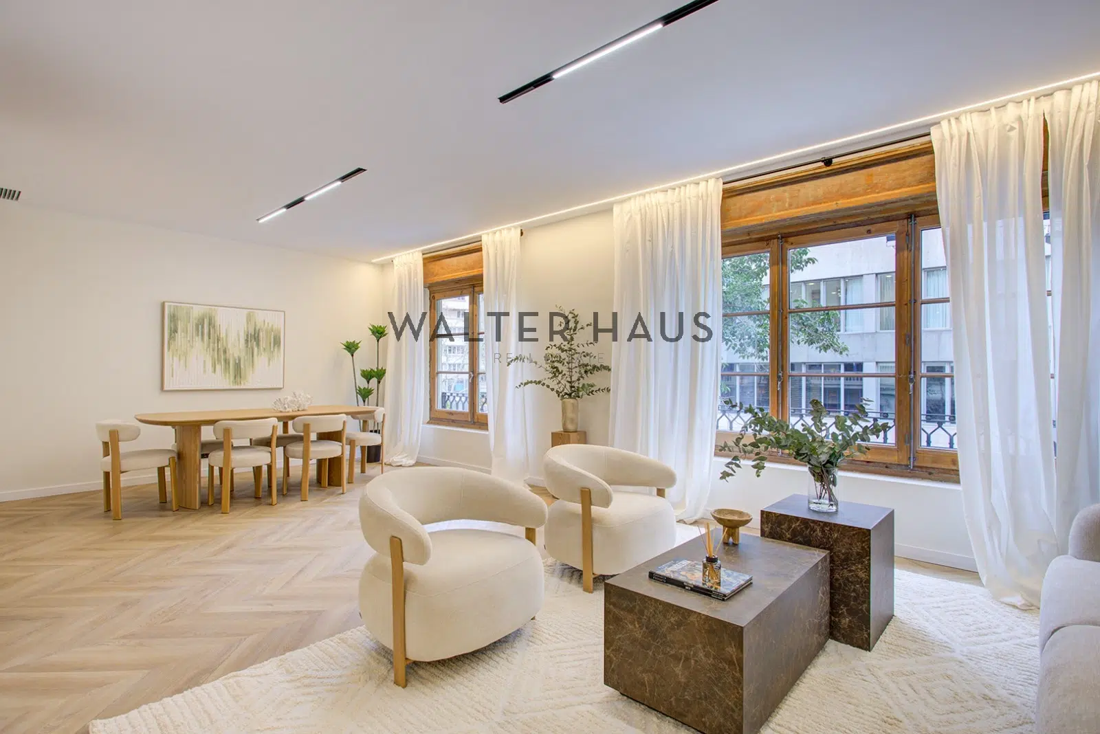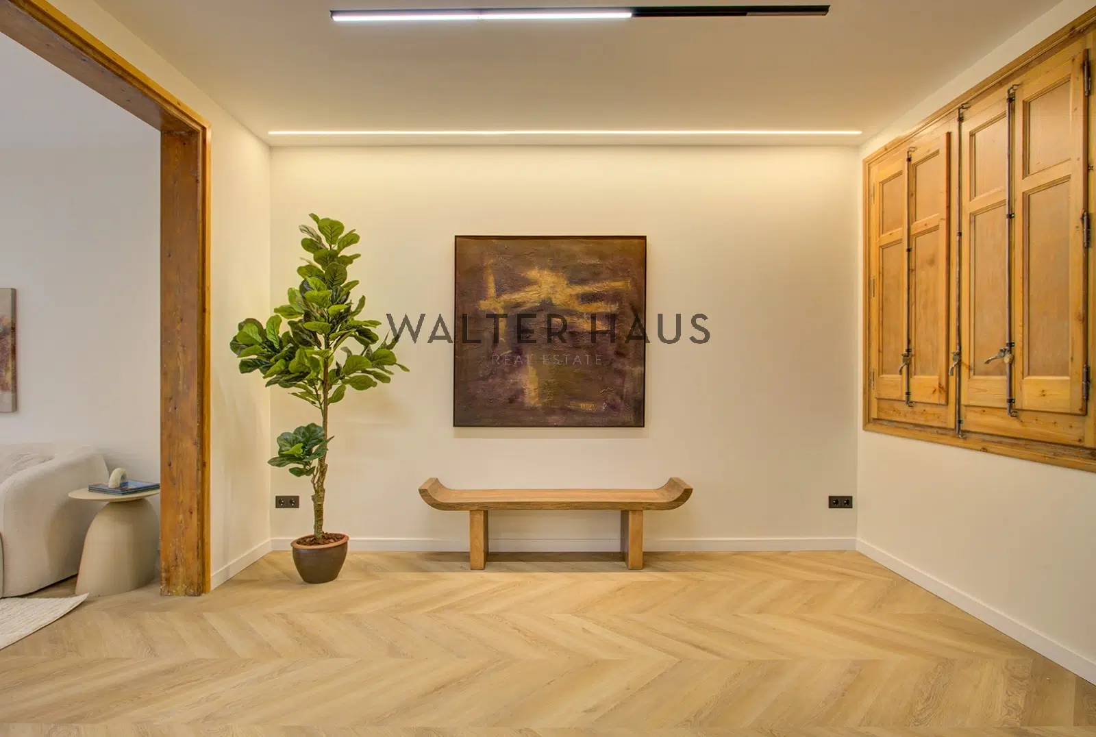 La zona de noche alberga cuatro amplias habitaciones dobles, incluyendo una elegante suite principal con vestidor y baño privado. El resto de dormitorios cuentan con generosas dimensiones y se complementan con dos baños completos adicionales, todos ellos con acabados de alta gama. La vivienda dispone además de un espacio polivalente ideal como despacho, home office o habitación de servicio, muy valorado tanto por familias como por compradores internacionales. Dos patios interiores aportan luz natural, ventilación cruzada y una agradable sensación de calma y privacidad en todas las estancias, creando un hogar equilibrado y silencioso en pleno centro urbano. La reforma se ha realizado con materiales premium y un cuidado diseño contemporáneo que respeta el carácter del Eixample, incorporando suelos de madera natural en espiga, carpintería de primera calidad, grifería de diseño y acabados exclusivos en cocina y baños.