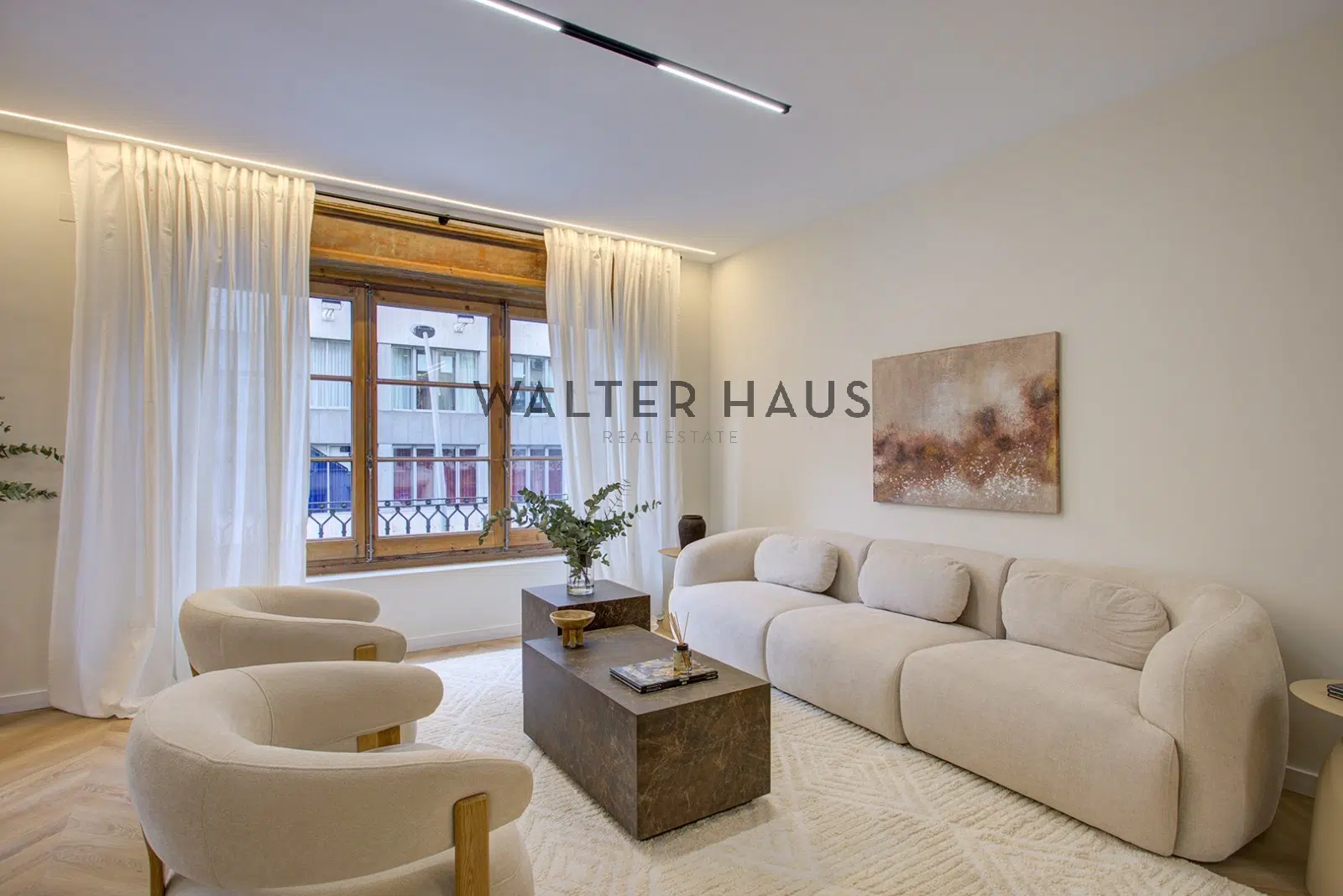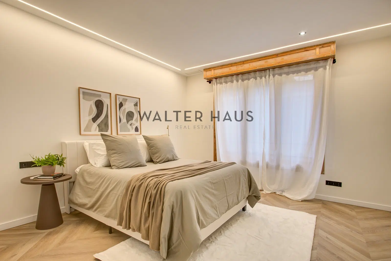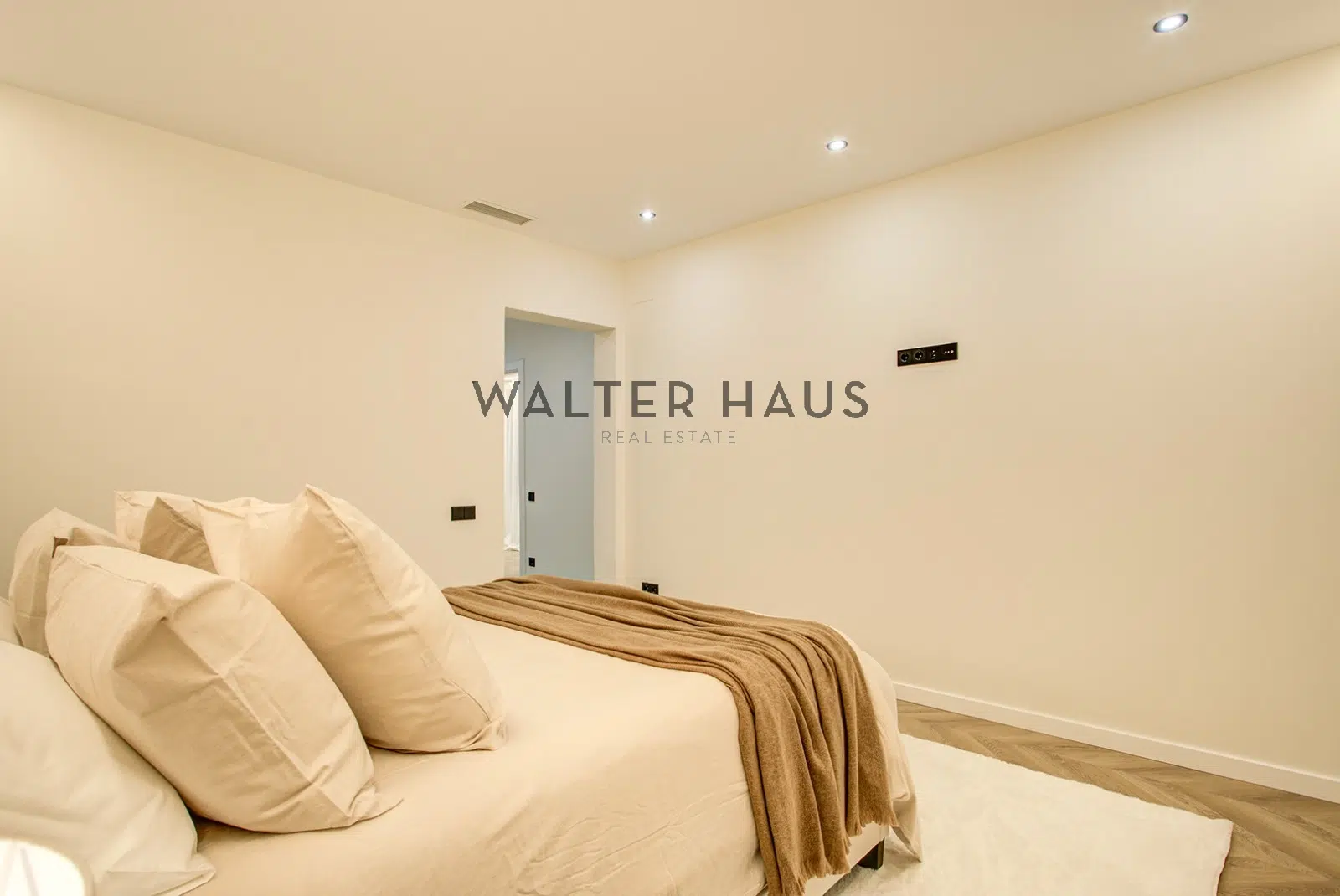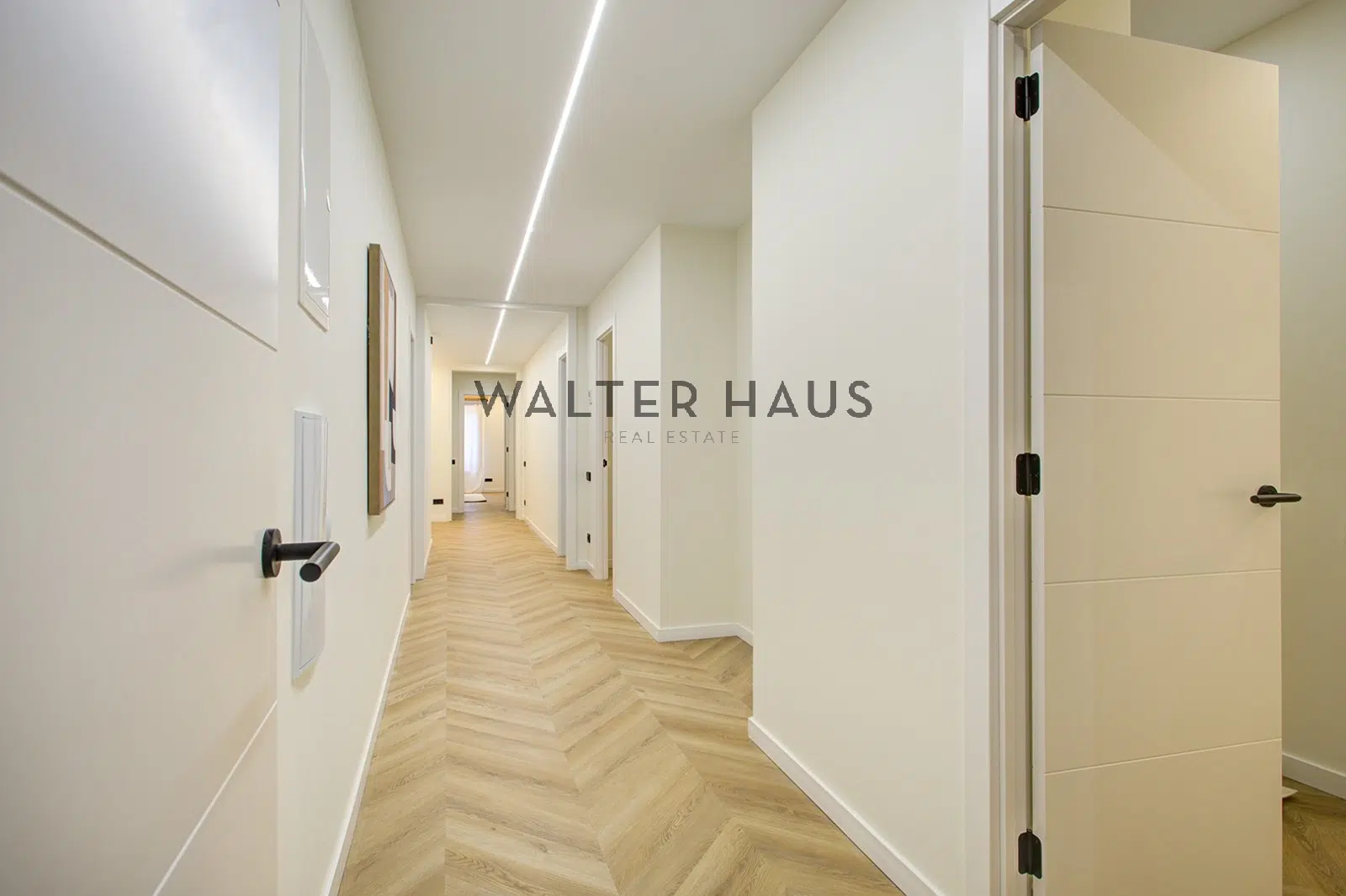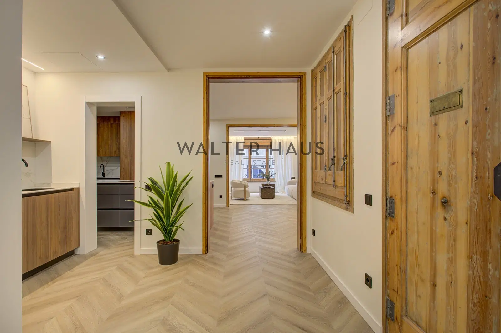 La zona de noche alberga cuatro amplias habitaciones dobles, incluyendo una elegante suite principal con vestidor y baño privado. El resto de dormitorios cuentan con generosas dimensiones y se complementan con dos baños completos adicionales, todos ellos con acabados de alta gama. La vivienda dispone además de un espacio polivalente ideal como despacho, home office o habitación de servicio, muy valorado tanto por familias como por compradores internacionales. Dos patios interiores aportan luz natural, ventilación cruzada y una agradable sensación de calma y privacidad en todas las estancias, creando un hogar equilibrado y silencioso en pleno centro urbano. La reforma se ha realizado con materiales premium y un cuidado diseño contemporáneo que respeta el carácter del Eixample, incorporando suelos de madera natural en espiga, carpintería de primera calidad, grifería de diseño y acabados exclusivos en cocina y baños.