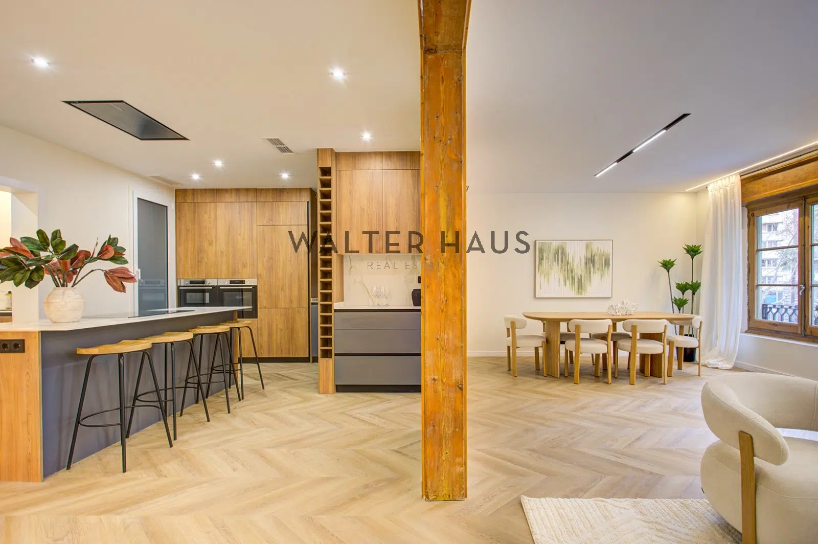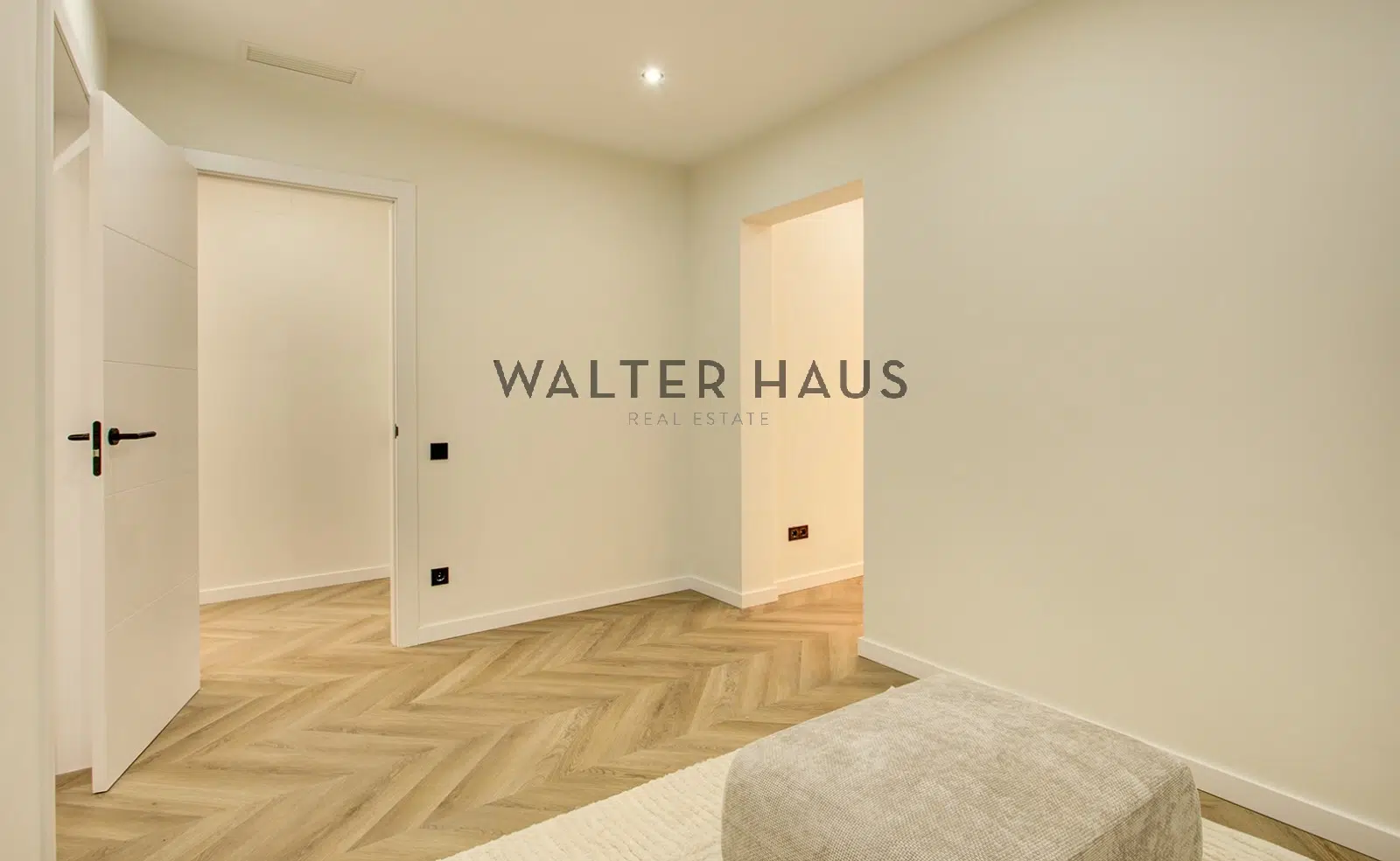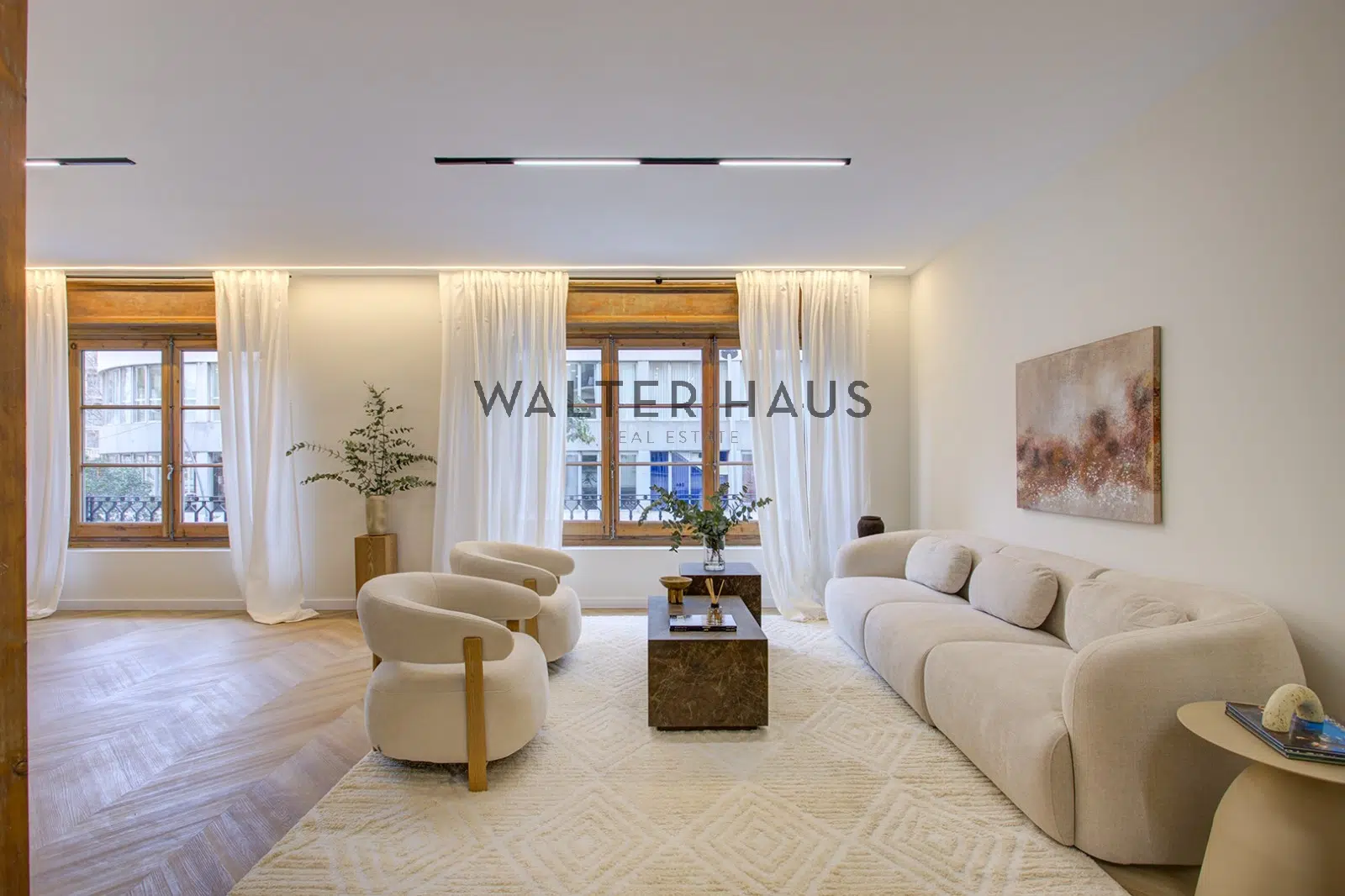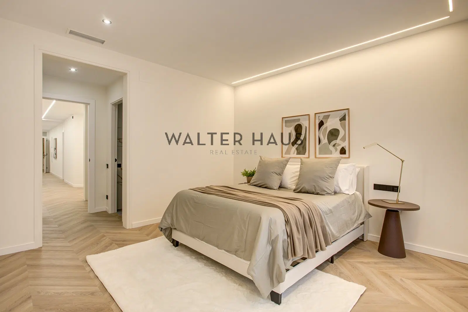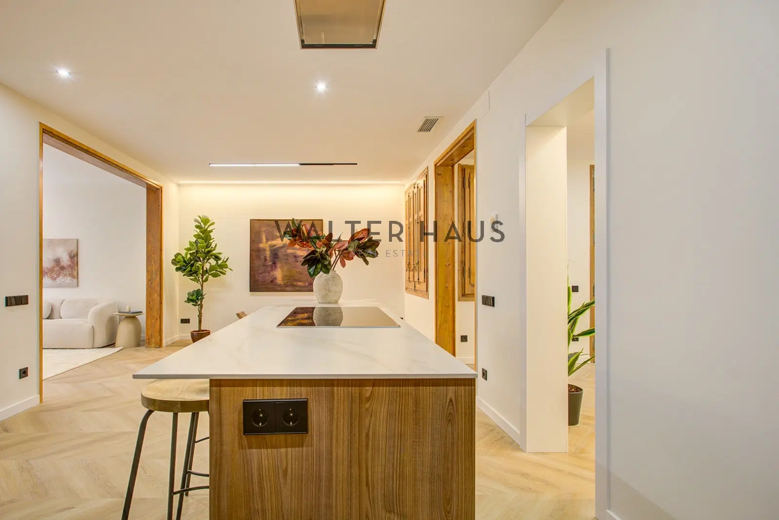 La zona de noche alberga cuatro amplias habitaciones dobles, incluyendo una elegante suite principal con vestidor y baño privado. El resto de dormitorios cuentan con generosas dimensiones y se complementan con dos baños completos adicionales, todos ellos con acabados de alta gama. La vivienda dispone además de un espacio polivalente ideal como despacho, home office o habitación de servicio, muy valorado tanto por familias como por compradores internacionales. Dos patios interiores aportan luz natural, ventilación cruzada y una agradable sensación de calma y privacidad en todas las estancias, creando un hogar equilibrado y silencioso en pleno centro urbano. La reforma se ha realizado con materiales premium y un cuidado diseño contemporáneo que respeta el carácter del Eixample, incorporando suelos de madera natural en espiga, carpintería de primera calidad, grifería de diseño y acabados exclusivos en cocina y baños.