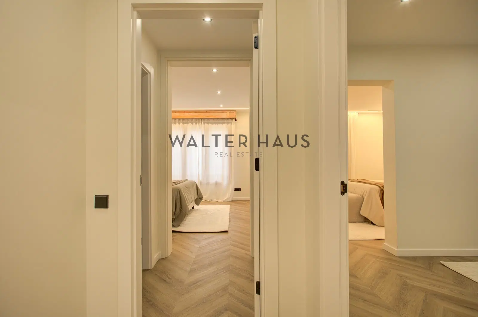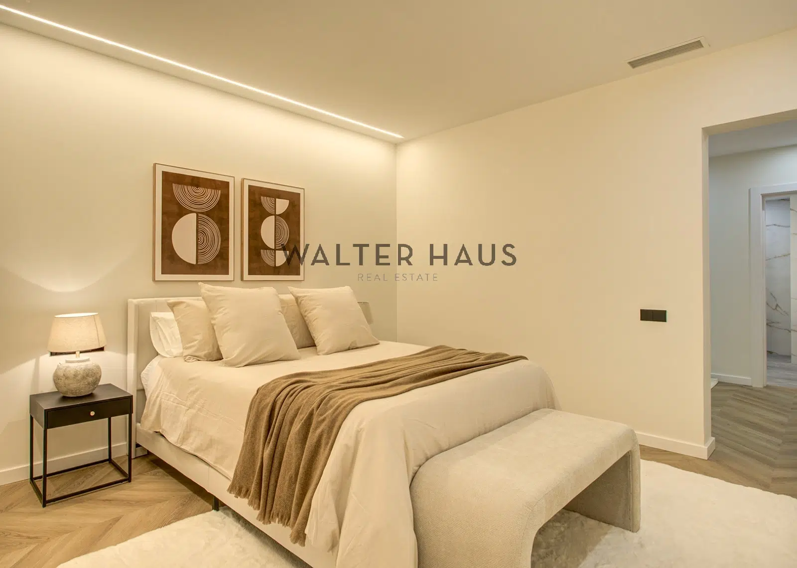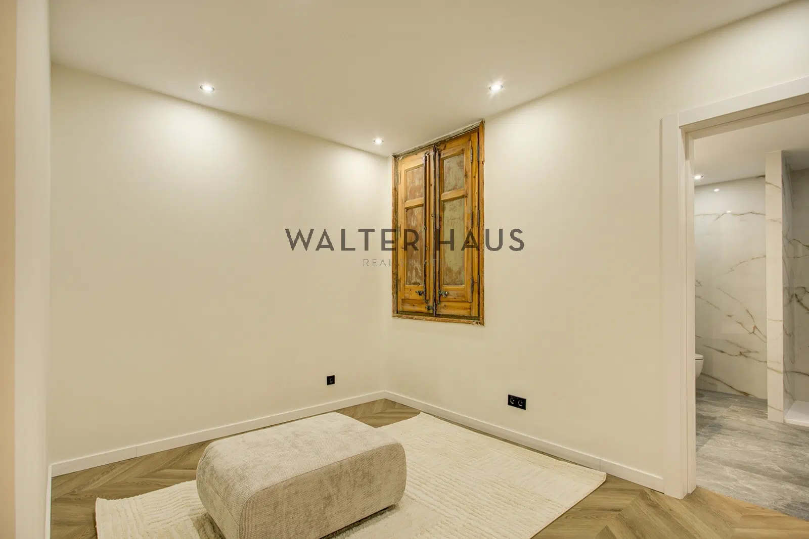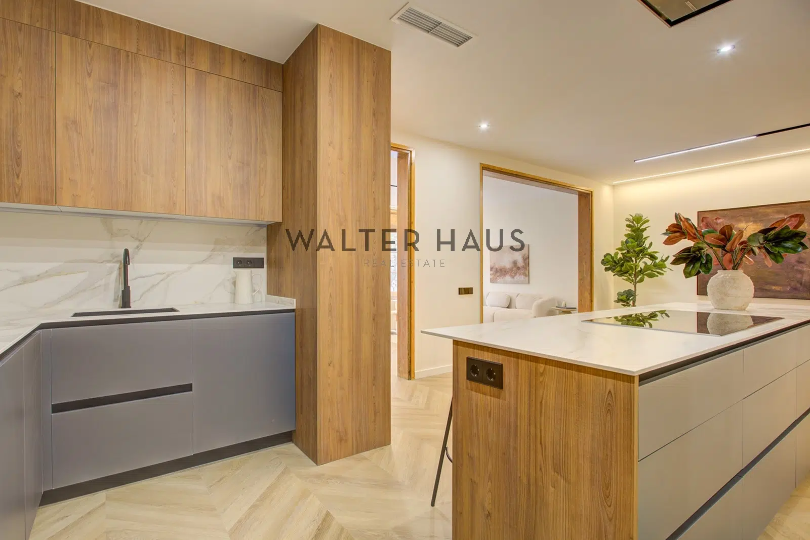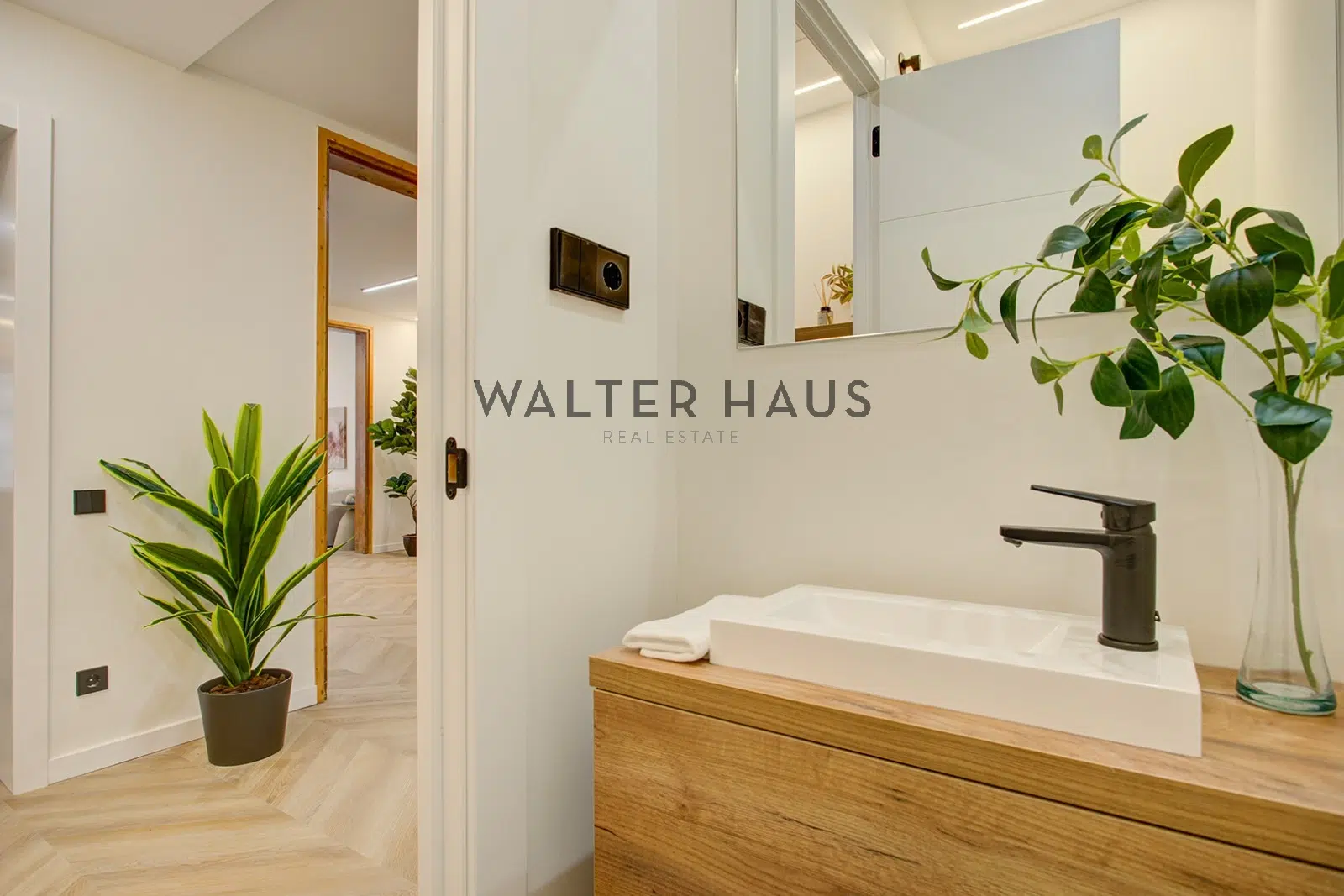 La zona de noche alberga cuatro amplias habitaciones dobles, incluyendo una elegante suite principal con vestidor y baño privado. El resto de dormitorios cuentan con generosas dimensiones y se complementan con dos baños completos adicionales, todos ellos con acabados de alta gama. La vivienda dispone además de un espacio polivalente ideal como despacho, home office o habitación de servicio, muy valorado tanto por familias como por compradores internacionales. Dos patios interiores aportan luz natural, ventilación cruzada y una agradable sensación de calma y privacidad en todas las estancias, creando un hogar equilibrado y silencioso en pleno centro urbano. La reforma se ha realizado con materiales premium y un cuidado diseño contemporáneo que respeta el carácter del Eixample, incorporando suelos de madera natural en espiga, carpintería de primera calidad, grifería de diseño y acabados exclusivos en cocina y baños.