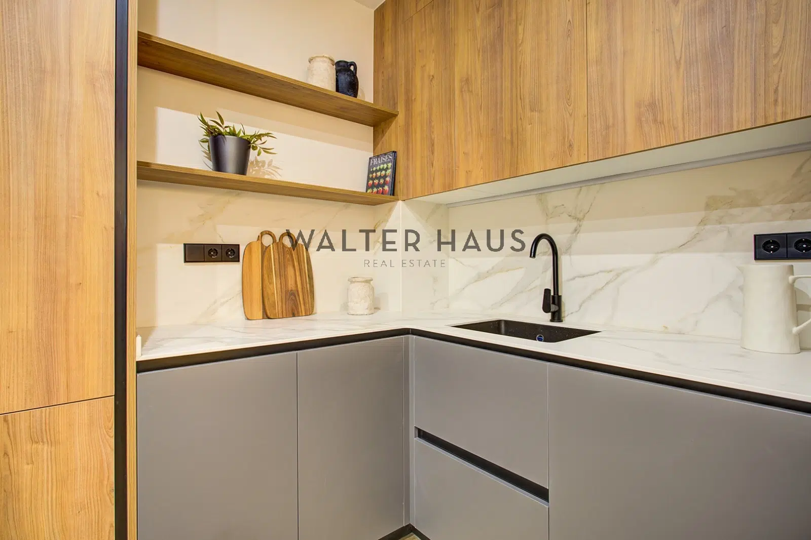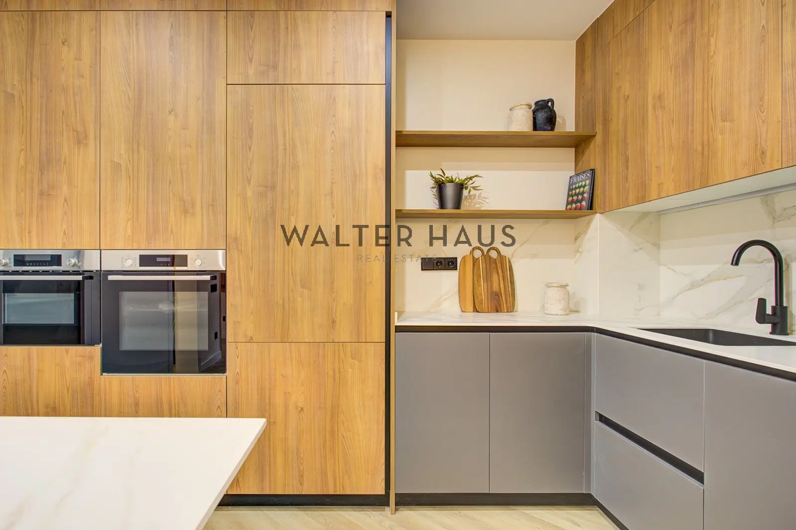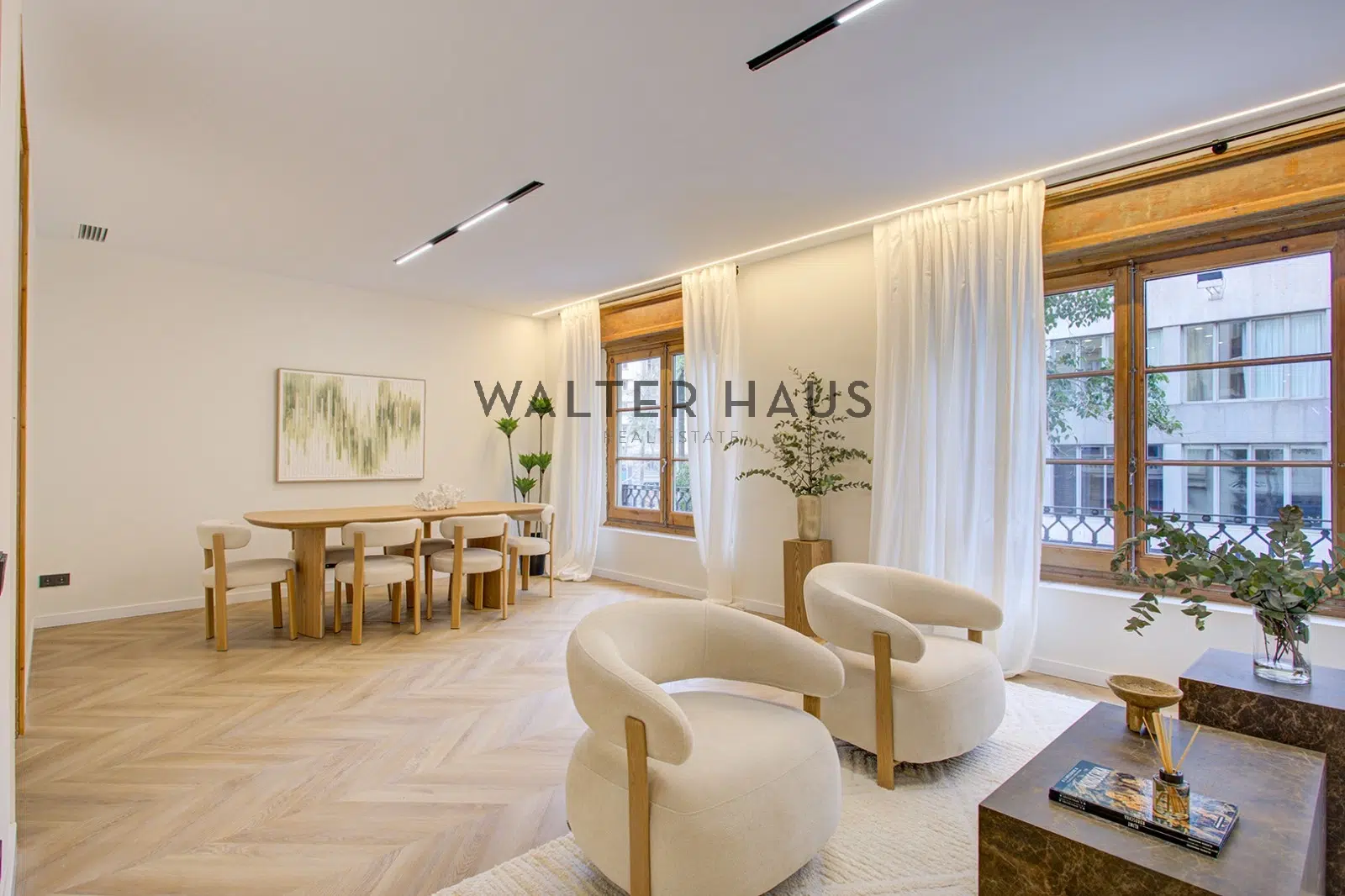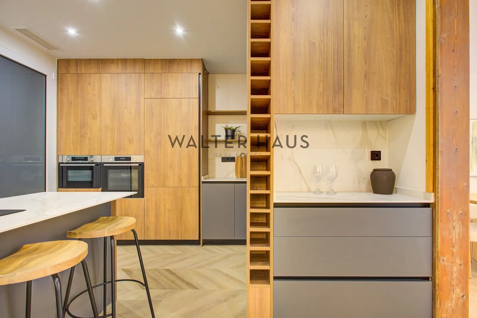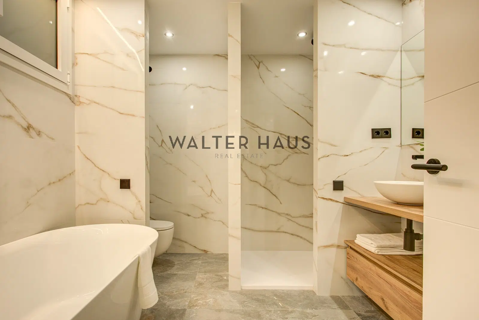 La zona de noche alberga cuatro amplias habitaciones dobles, incluyendo una elegante suite principal con vestidor y baño privado. El resto de dormitorios cuentan con generosas dimensiones y se complementan con dos baños completos adicionales, todos ellos con acabados de alta gama. La vivienda dispone además de un espacio polivalente ideal como despacho, home office o habitación de servicio, muy valorado tanto por familias como por compradores internacionales. Dos patios interiores aportan luz natural, ventilación cruzada y una agradable sensación de calma y privacidad en todas las estancias, creando un hogar equilibrado y silencioso en pleno centro urbano. La reforma se ha realizado con materiales premium y un cuidado diseño contemporáneo que respeta el carácter del Eixample, incorporando suelos de madera natural en espiga, carpintería de primera calidad, grifería de diseño y acabados exclusivos en cocina y baños.