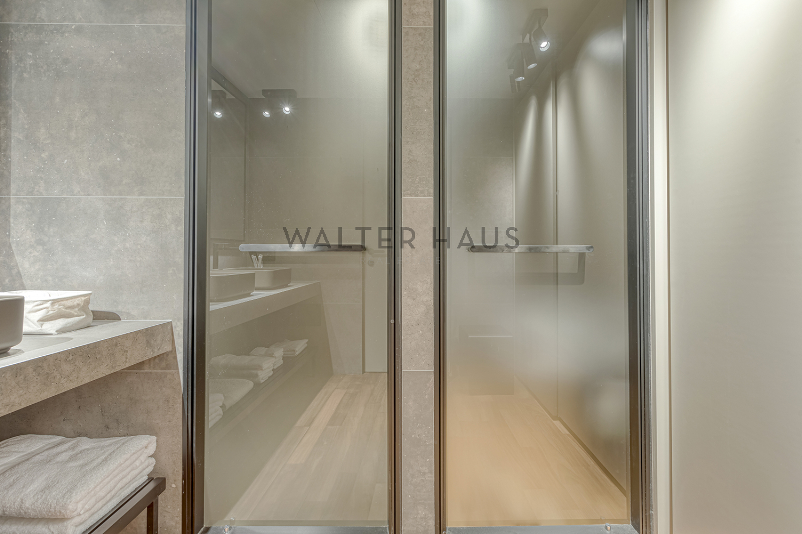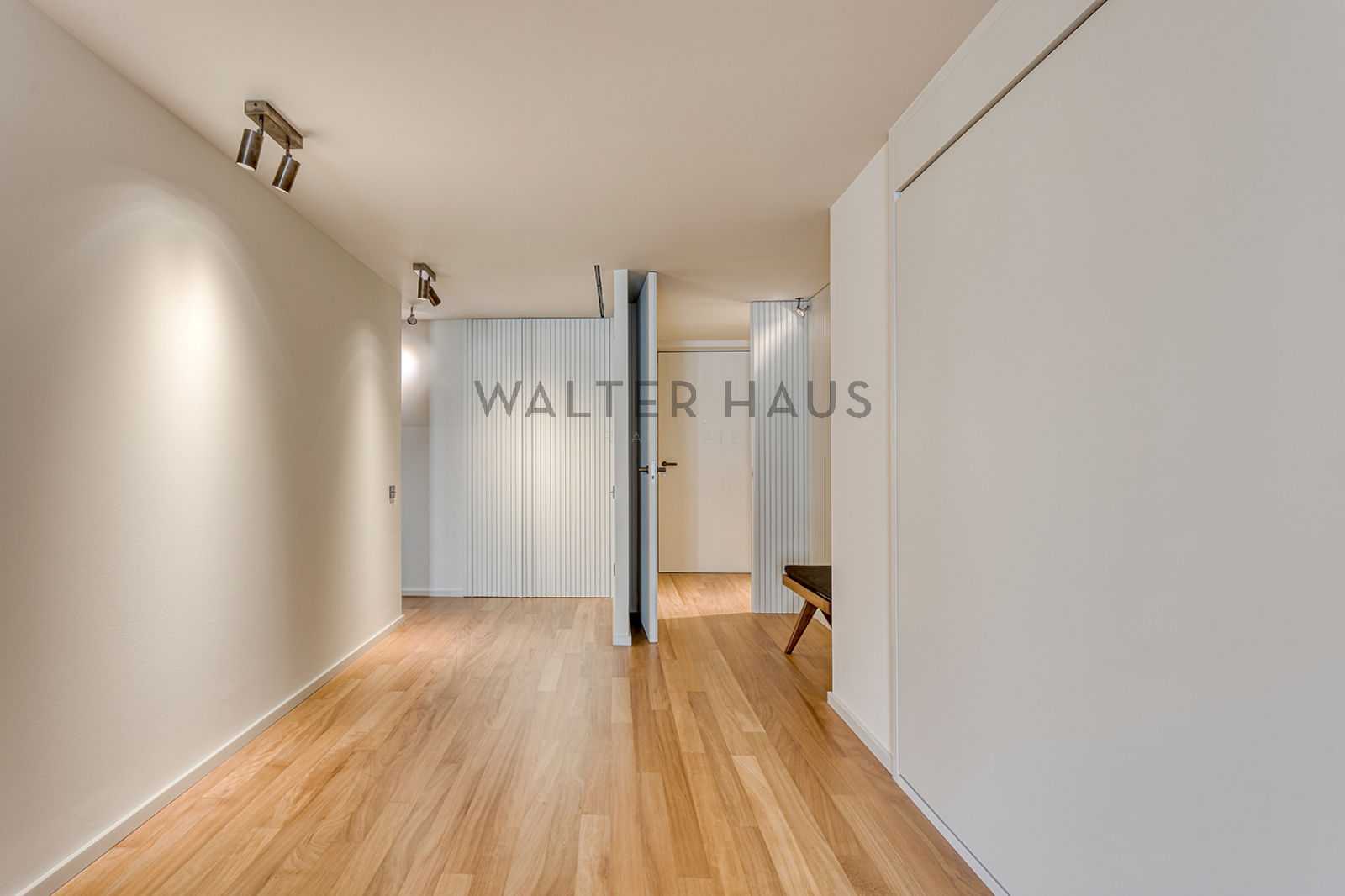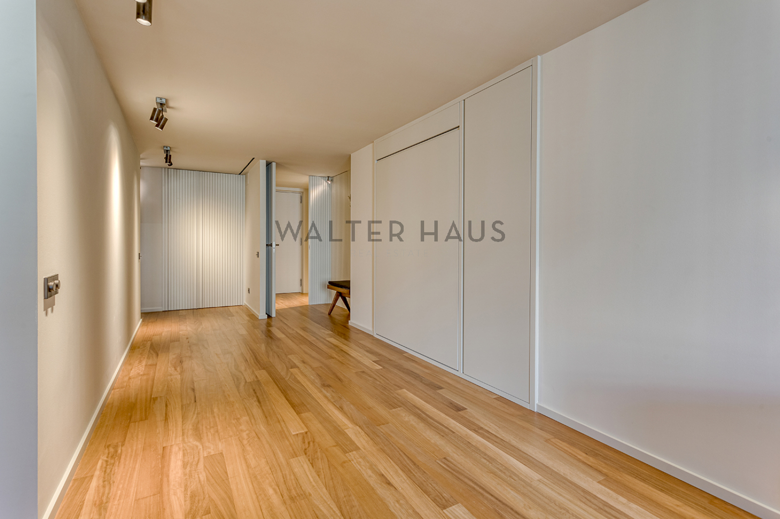 En la entrada, encontramos una doble puerta que separa espacios de vestíbulo y el resto de la vivienda. Todas las estancias disponen de suelo de roble, aire acondicionado y calefacción, carpintería de madera y doble acristalamiento. Los detalles de la propiedad vienen cuidadosamente diseñados a medida con materiales de alta calidad.