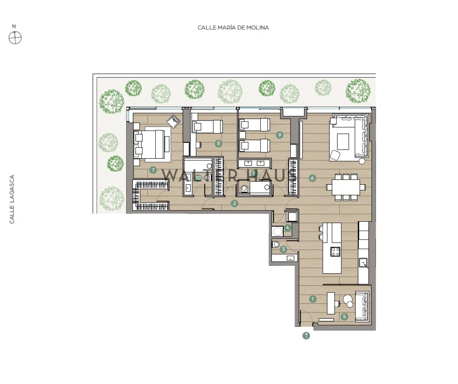 El interiorismo de estas propiedades destaca por un enfoque de alta gama donde la luz natural y la funcionalidad son las prioridades. La cocina, de estética minimalista, integra mobiliario de alta capacidad con encimeras Xtone de Porcelanosa y electrodomésticos Siemens de última generación, incluyendo vinoteca y zona de lavandería independiente. El confort técnico se eleva gracias a un sistema de domótica avanzada que gestiona la iluminación y la climatización mediante aerotermia individual. La combinación de suelo radiante y refrescante, junto con el sistema Airzone para el control independiente de la temperatura en cada estancia, asegura un ambiente óptimo durante todo el año con la máxima eficiencia energética. La ubicación de este edificio es inmejorable, situándose en la intersección de la calle Lagasca con María de Molina, en la zona más cosmopolita del Barrio de Salamanca.