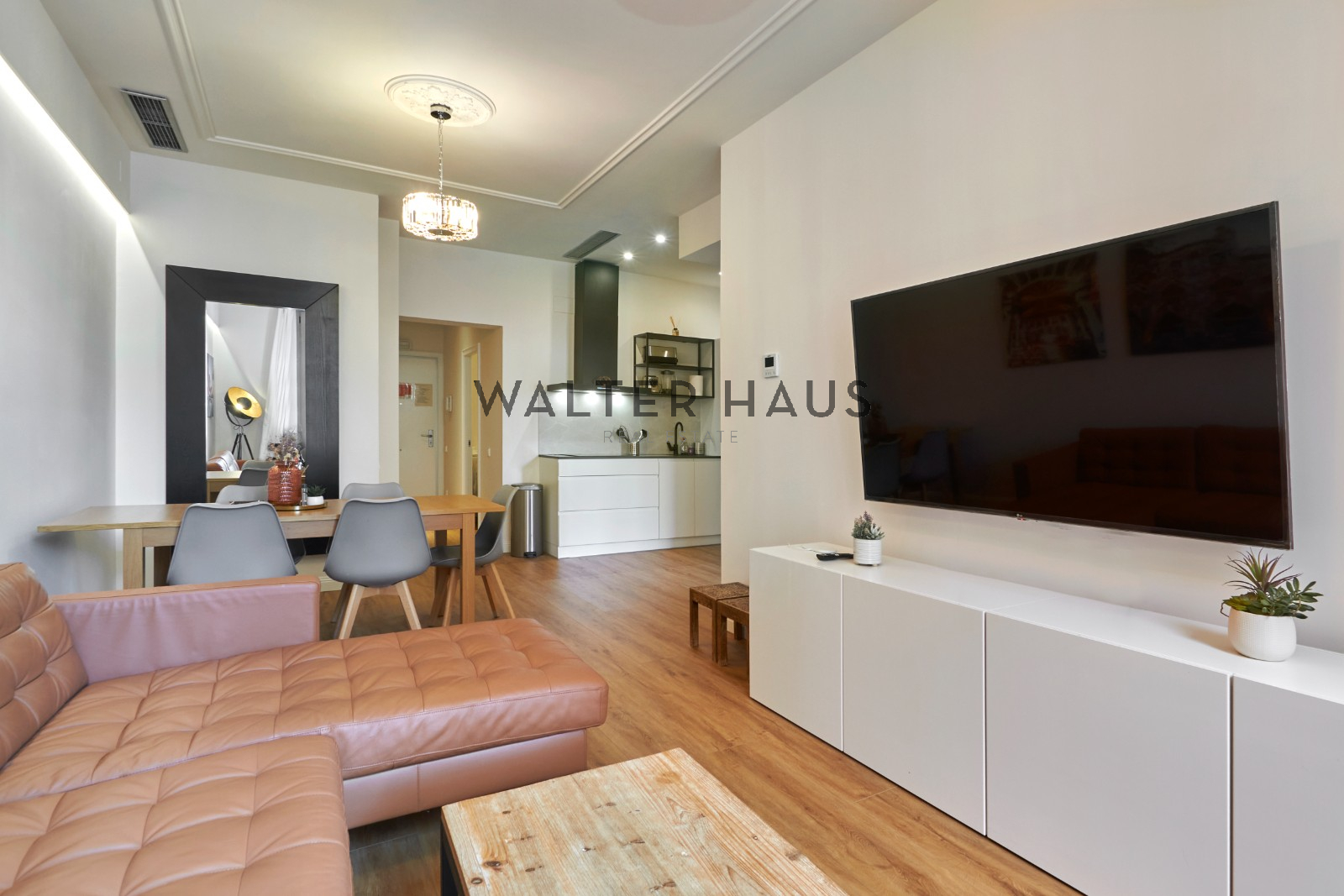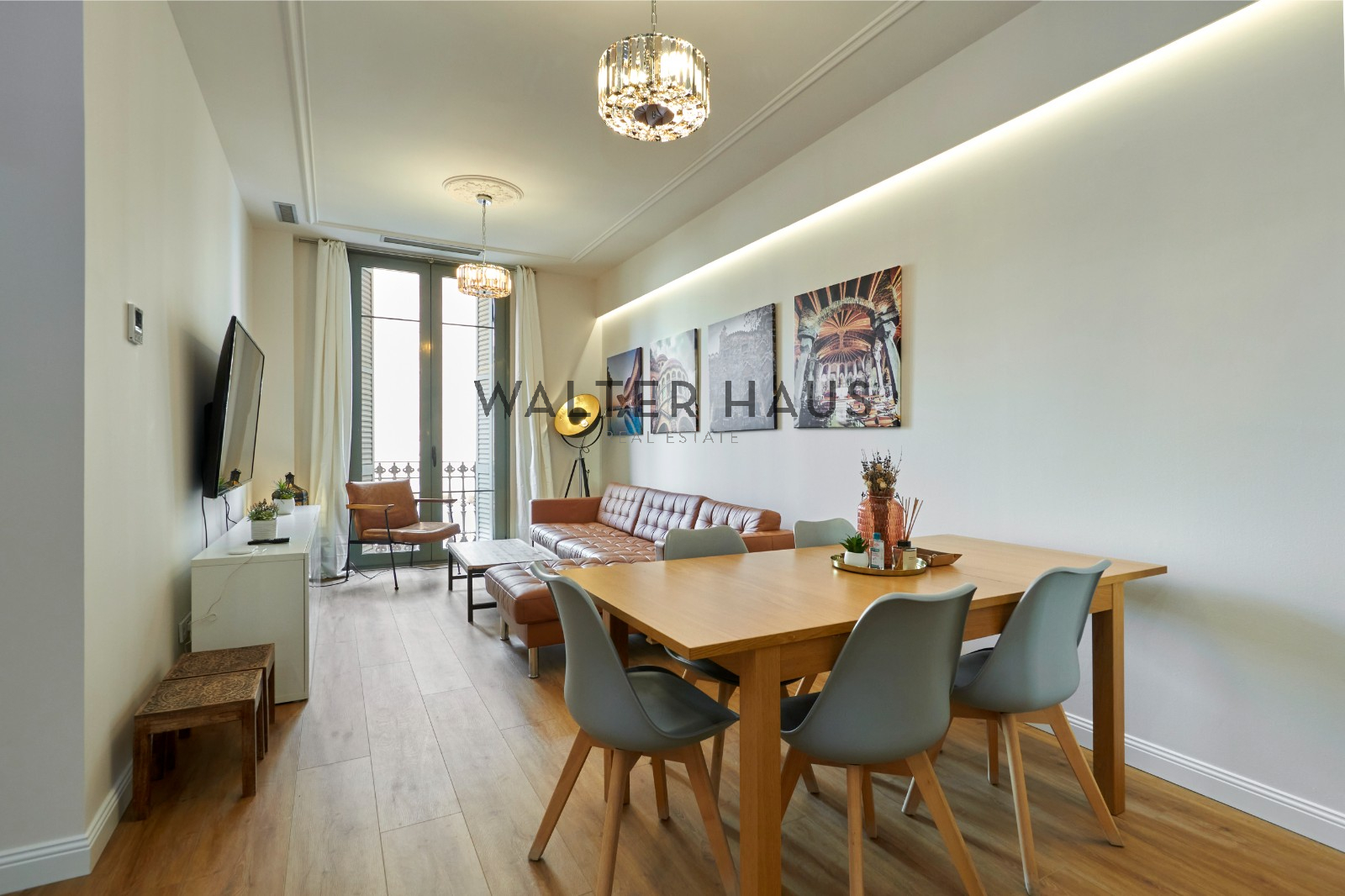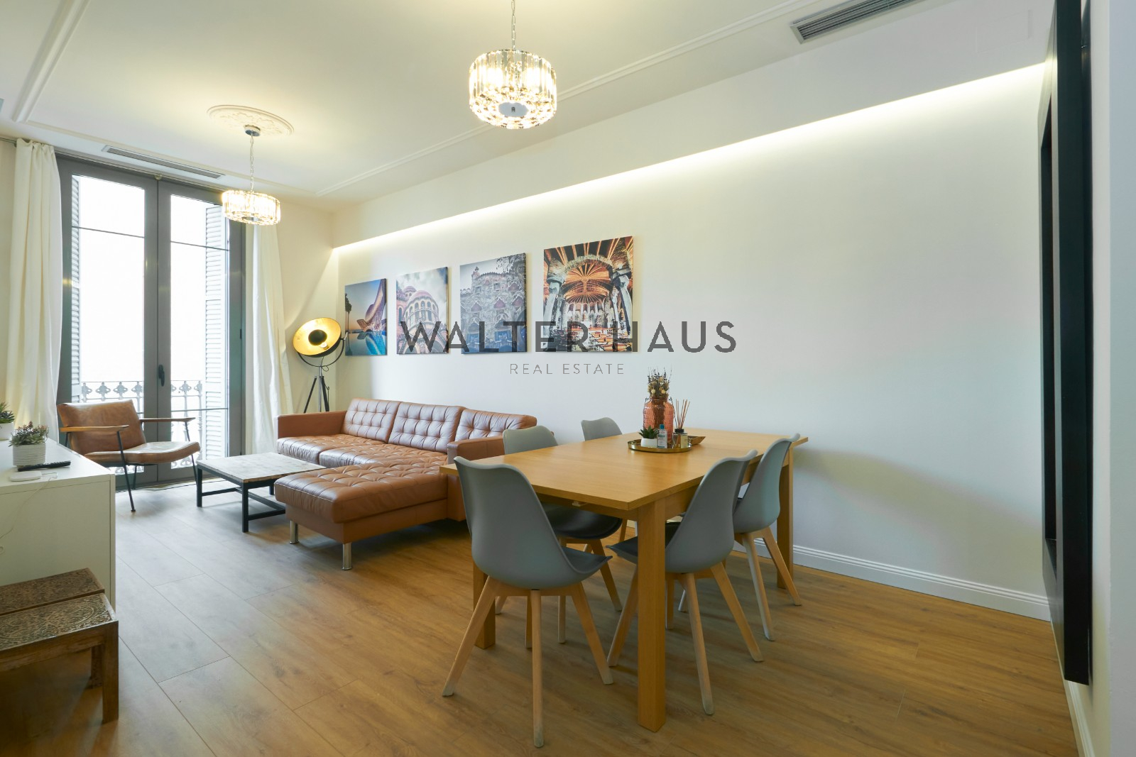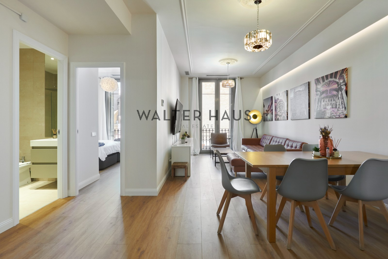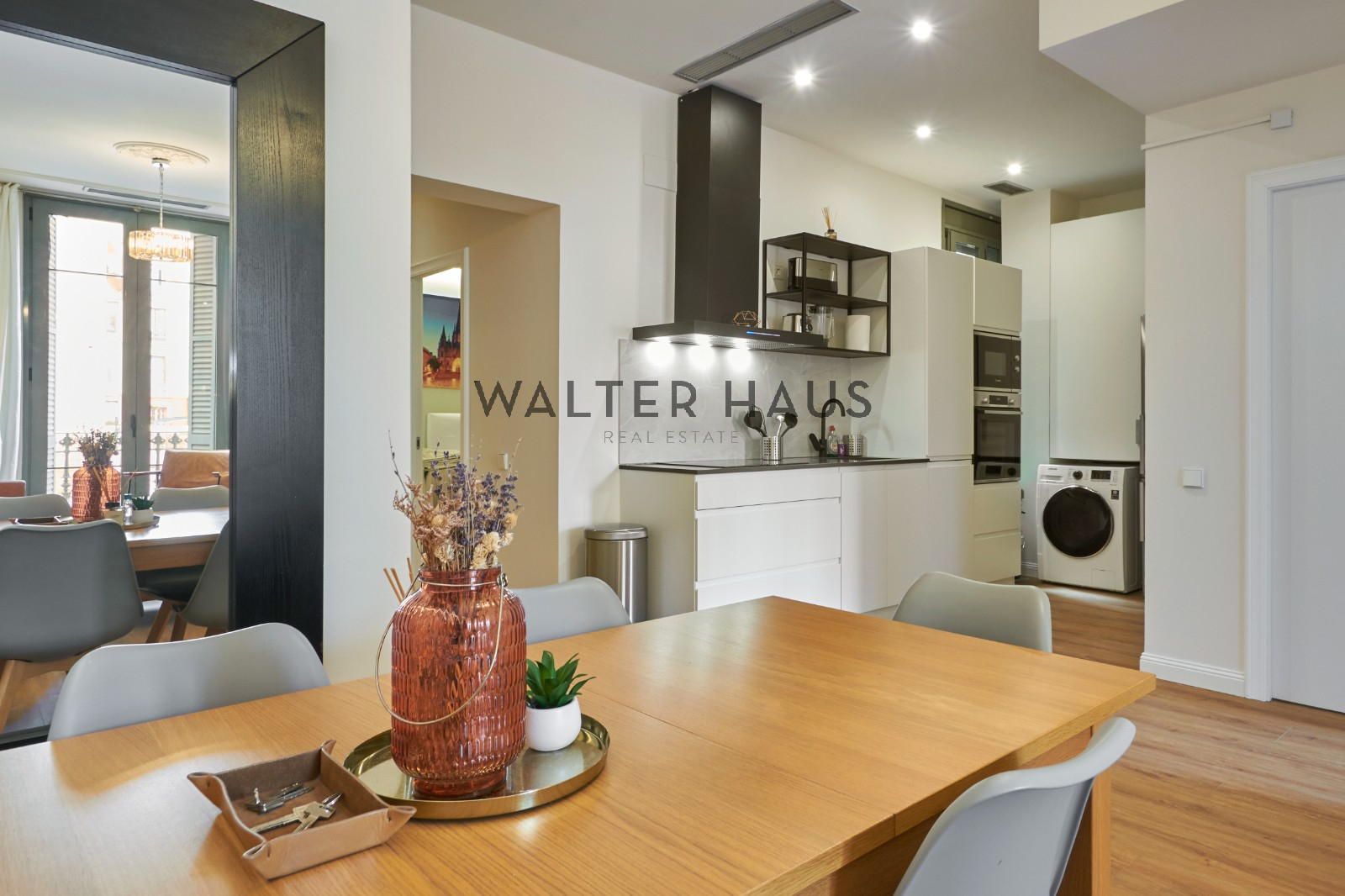 Bonito y soleado piso de 70m2, en bonita finca rehabilitada con ascensor con LICENCIA TURÍSTICA. El piso se distribuye en amplio salón-comedor con bonitas vistas a patio de manzana típico del Eixample, y con gran cocina incorporada y completamente equipada. 2 habitaciones dobles con armarios empotrados y un cuarto de baño completo con bañera. Bonitos suelos de parquet, aire acondicionado frío/calor por conductos, completamente exterior.