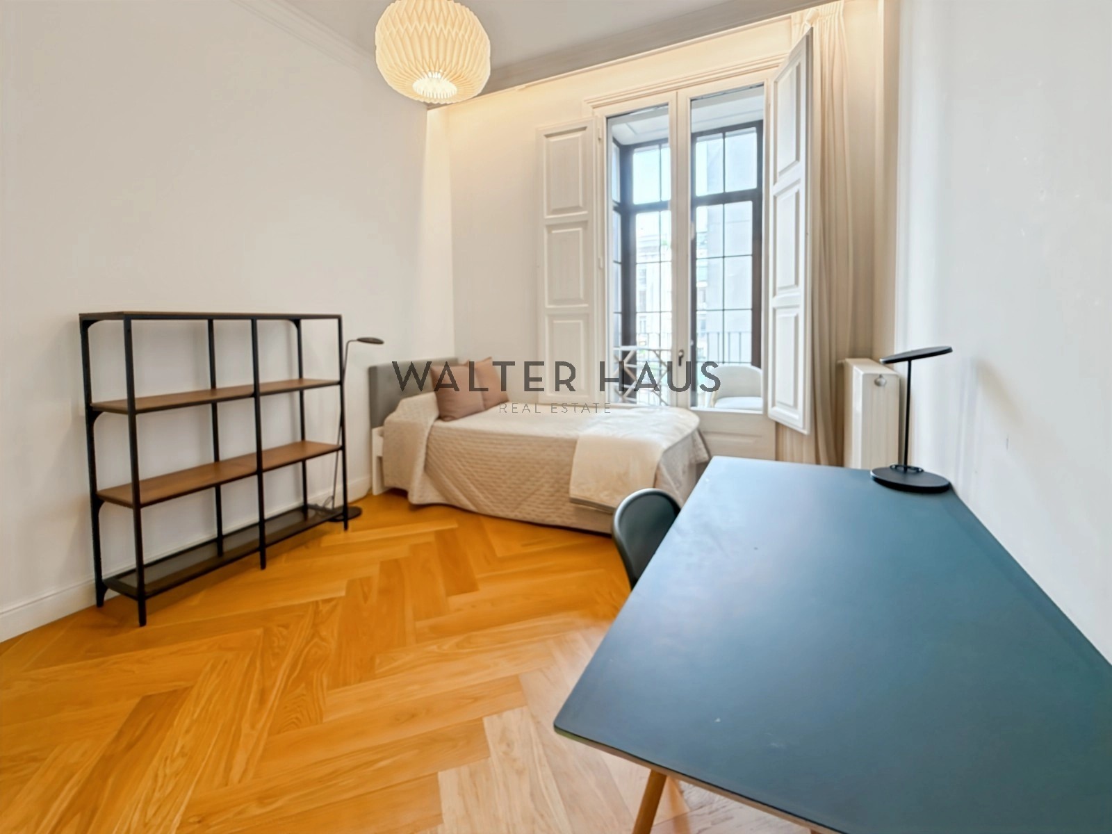 La zona de día incluye un amplio salón, una moderna cocina americana completamente equipada con electrodomésticos de alta gama y acabados en blanco, y una zona de comedor. Desde esta área se accede a dos acogedores balcones con vistas a la calle Girona. La zona de noche dispone de tres habitaciones dobles exteriores, una de ellas en suite con vestidor. Las otras dos habitaciones tienen acceso a una luminosa galería acristalada. Esta zona también incluye un baño completo adicional y un aseo.