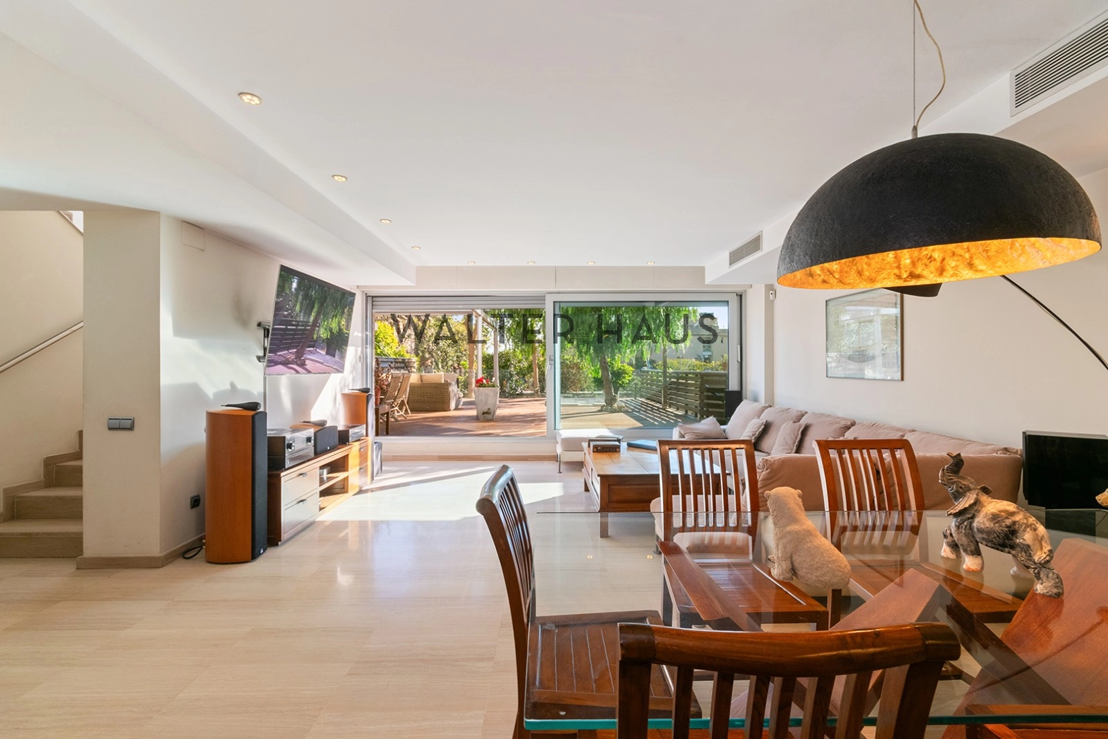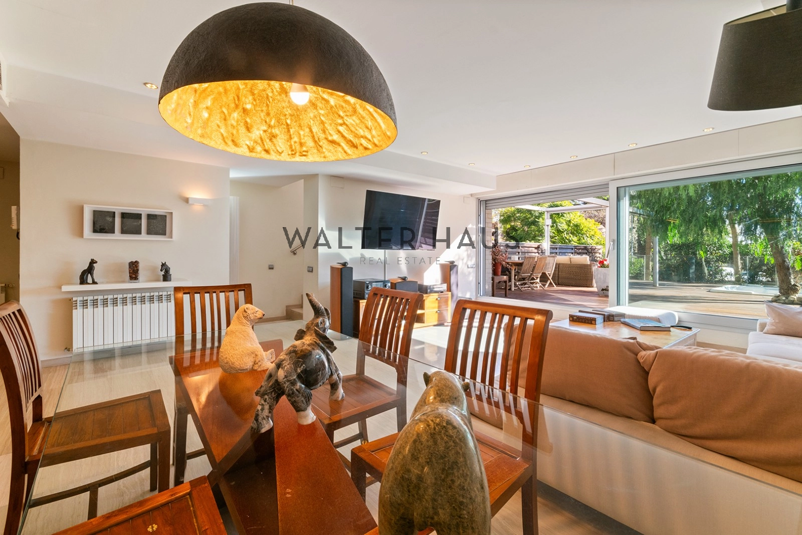 En su interior, la vivienda ofrece espacios cuidadosamente diseñados. La planta baja dispone de dos dormitorios dobles con armarios empotrados y dos baños. La planta superior incluye un dormitorio principal con baño en suite, vestidor y vistas al jardín, además de otro dormitorio doble ideal para oficina o descanso. La planta inferior presenta una elegante cocina con isla y comedor, conectados al salón y a una terraza exterior de 90 m². Además, el sótano ofrece 77 m² para almacenamiento y un amplio garaje de 113 m². Consta de ascensor.