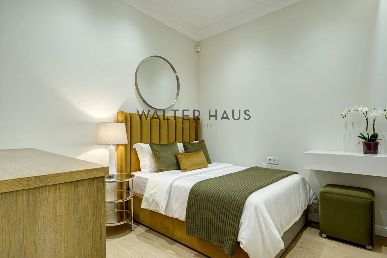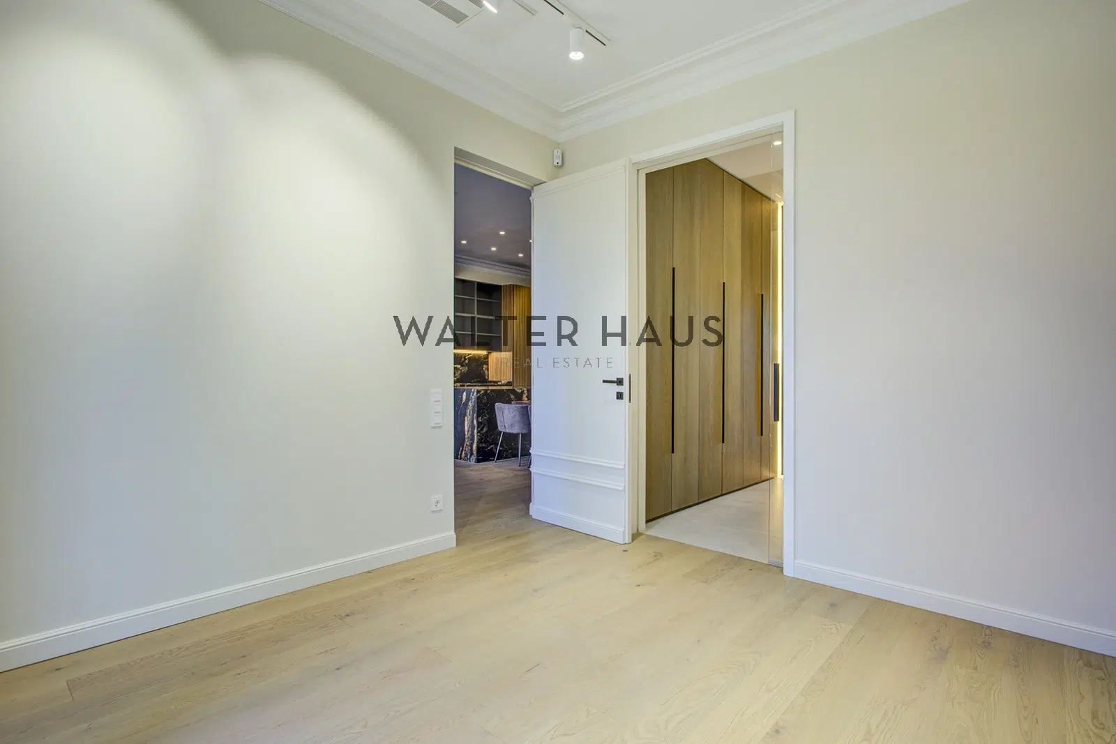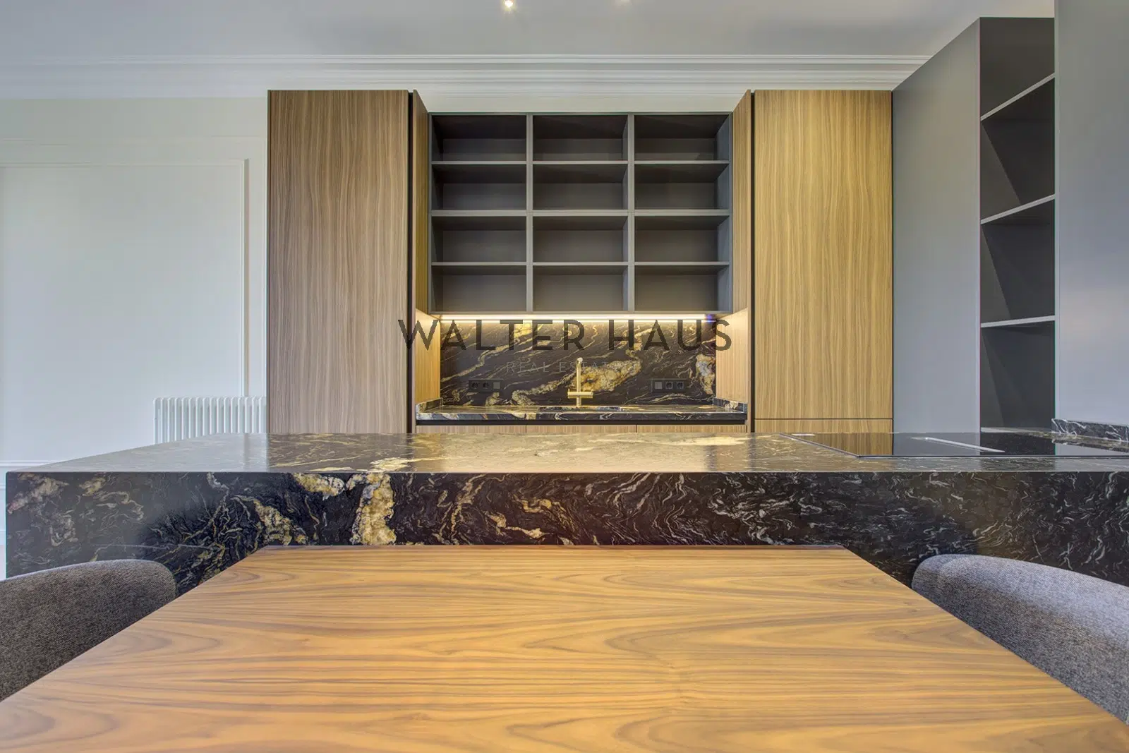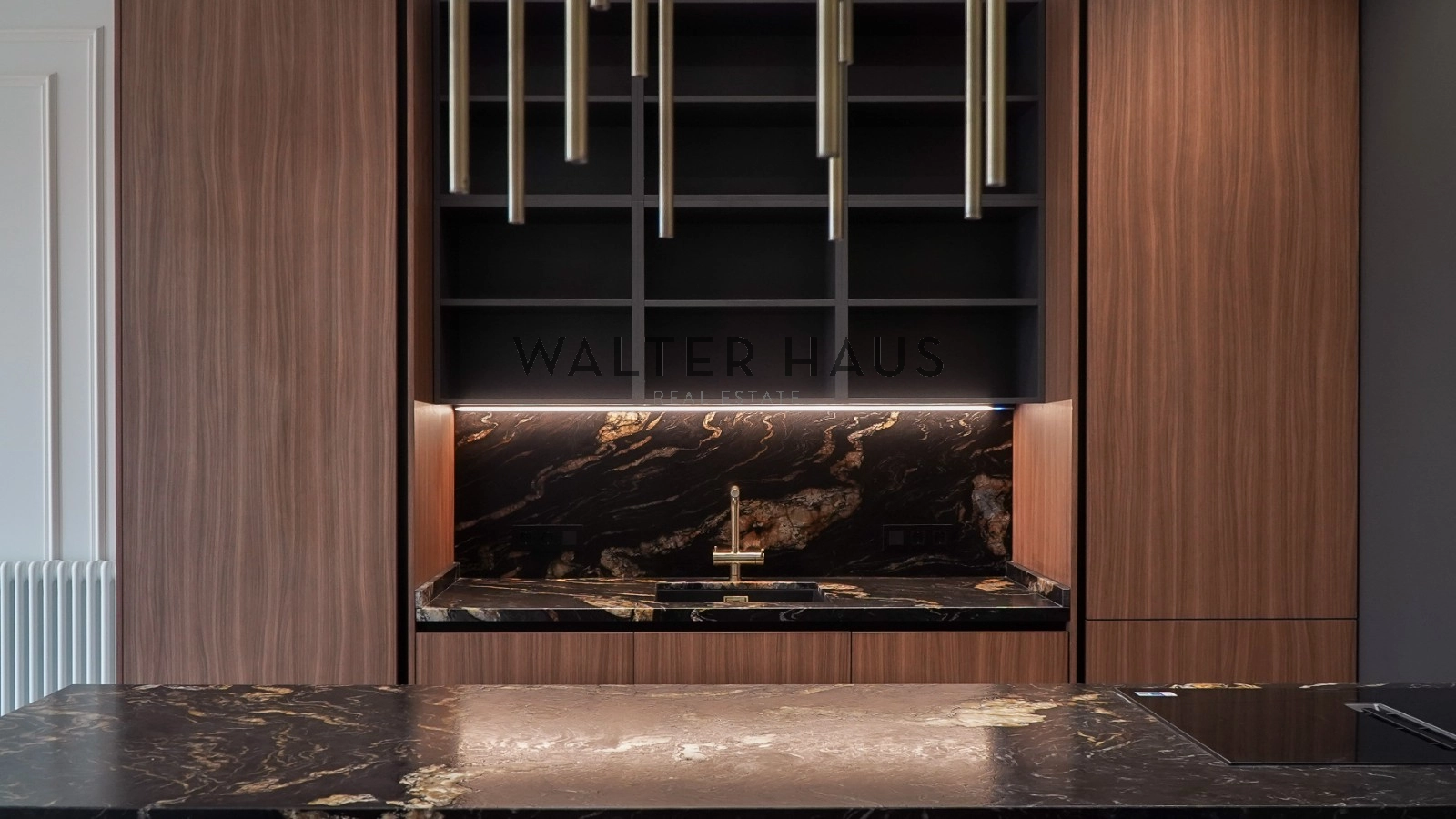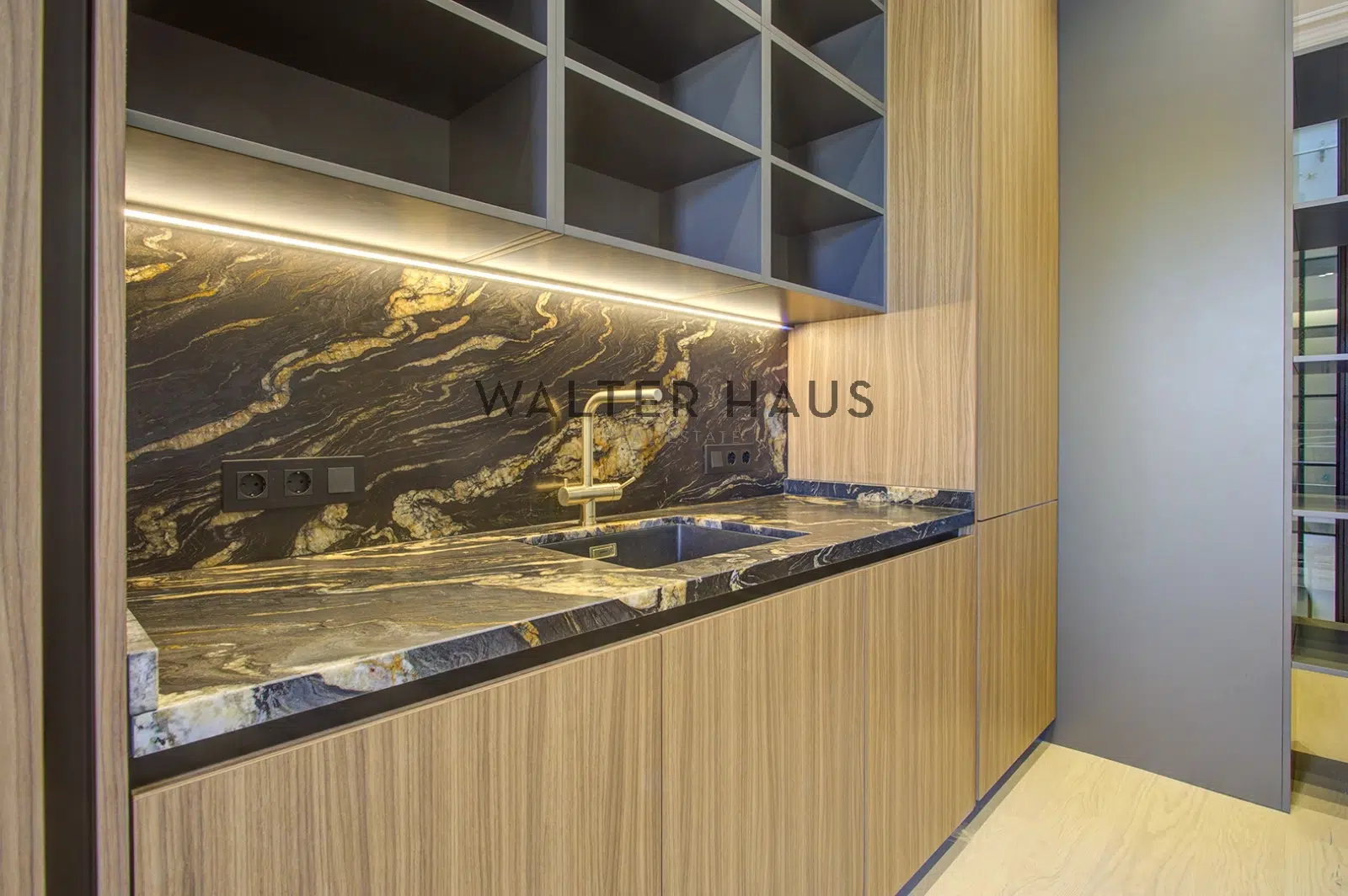 La zona de día integra una cocina italiana de diseño realizada a medida por ASTRA Cucine, uno de los fabricantes premium más reconocidos. El bloque de cocina, con una altura de 2,60 metros, incorpora encimera de cuarcita natural y electrodomésticos integrados Siemens Elite, ofreciendo eficiencia y estética contemporánea. La vivienda dispone de dos habitaciones dobles en suite, cada una con su propio baño. Los baños están equipados con sanitarios Geberit AquaClean con función de bidé, aportando un nivel de confort y tecnología avanzada. Además, el sistema de climatización Mitsubishi Electric de alta eficiencia garantiza bienestar durante todo el año.