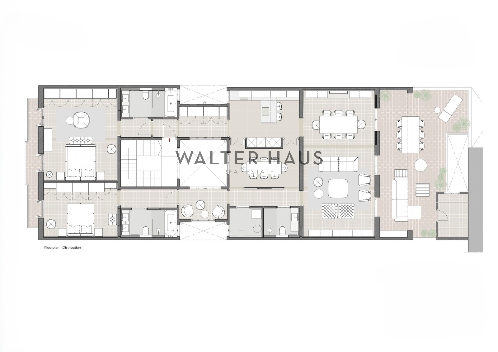 La distribución del piso es ideal, ya que separa perfectamente la zona de día y la zona de noche. Al entrar a la vivienda nos encontramos con un recibidor que nos dirige hacia la cocina en office, amplia y equipada con electrodomésticos Siemens, conectada con el amplio salón-comedor, desde donde podemos acceder a la gran terraza privada de 46 m² con la que cuenta el piso. Un espacio ideal para momentos de relajación y de convivencia. En la zona de noche la vivienda cuenta con tres habitaciones, una de ellas en interior que comparte baño con el de cortesía y dos habitaciones tipo suite, cada una de ellas con baño privado, armarios empotrados y acceso al balcón con vistas al exterior. Además, la propiedad cuenta con una zona extra que podría servir de estudio o zona de almacenaje, además de un recibidor que separa una de las habitaciones principales con el resto de las estancias. Todos los baños son completos y cuentan con sanitarios de Jacob Delafon, lavabos Roca y toalleros calentadores. El piso cuenta con una zona de agua en el interior.