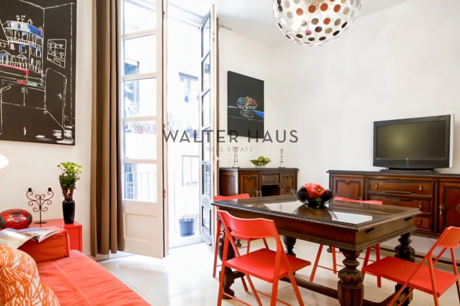 Salón amplio con con TV y comedor y salida a un balcón que comunica salón y habitación principal.