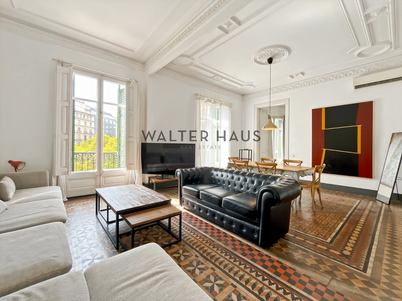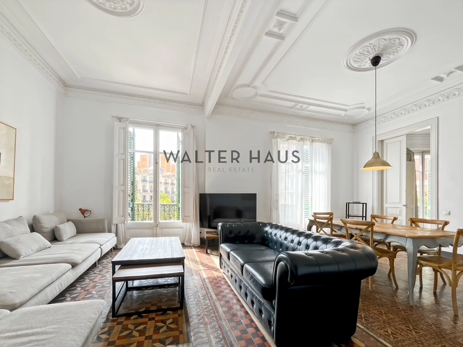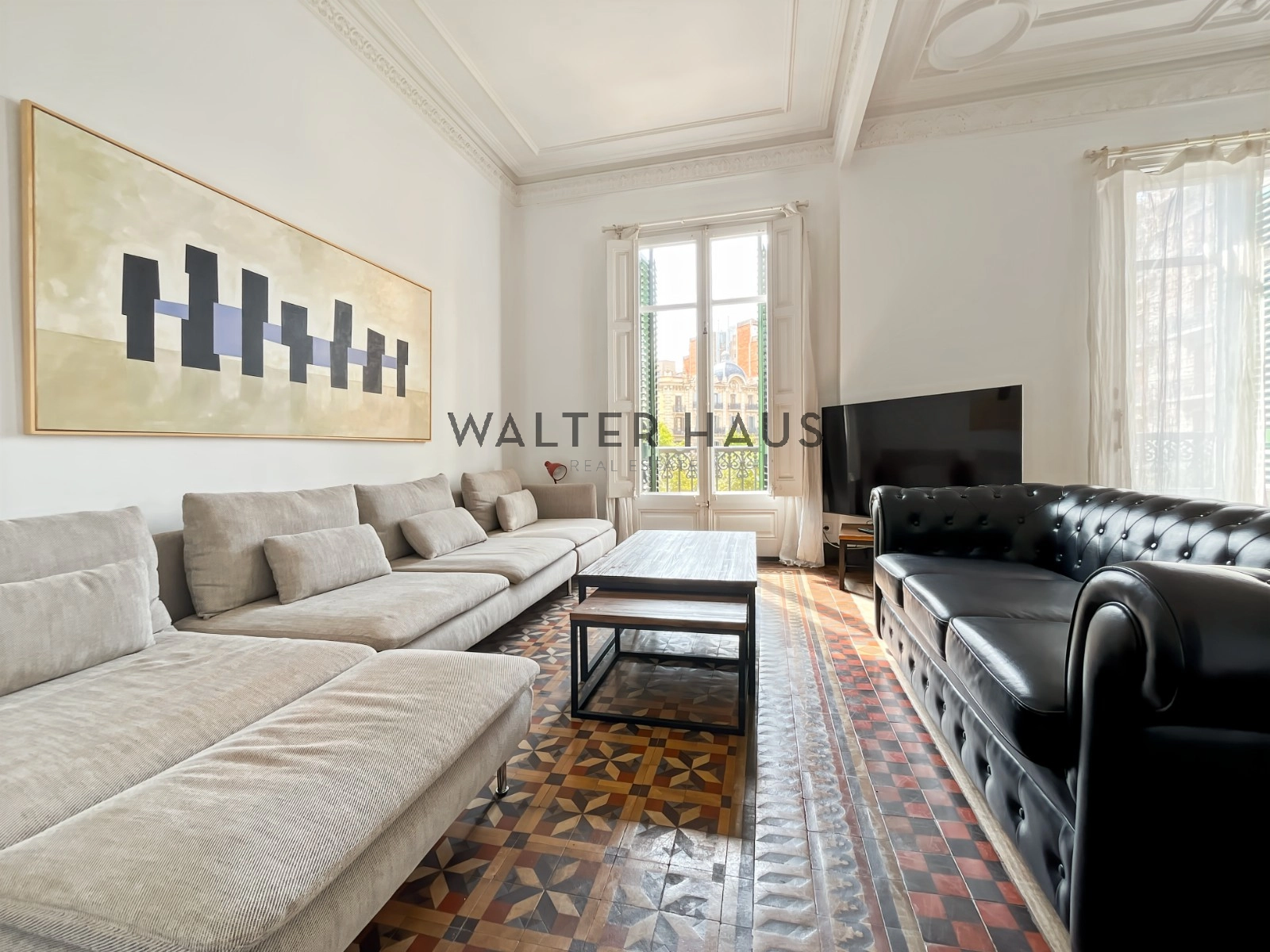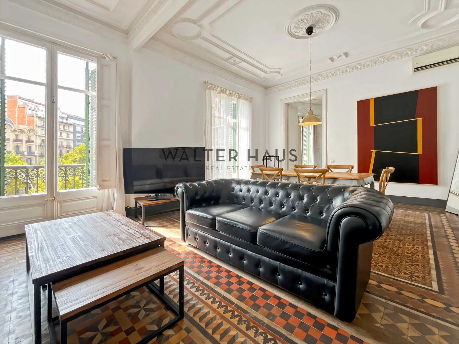 ALQUILER DE TEMPORADA. Fantástico piso de 115 m2 ubicado en la segunda planta de una finca regia con ascensor en el corazón del Quadrat d’Or de Barcelona, junto a la Plaza Tetuán, el Paseo de Sant Joan y el tradicional Paseo de Gràcia.