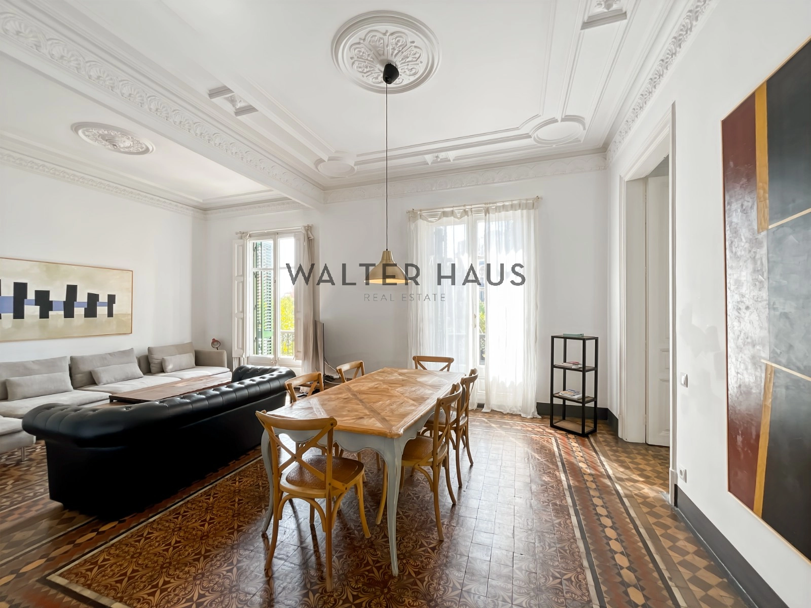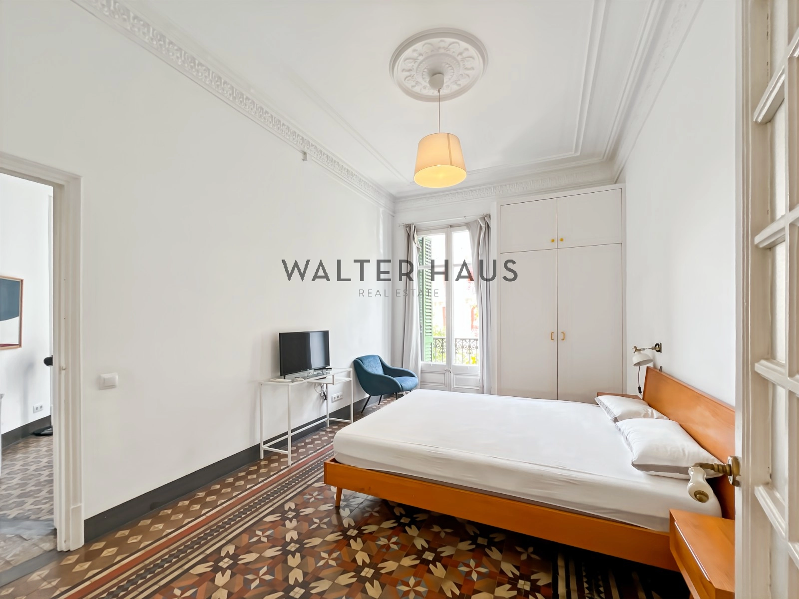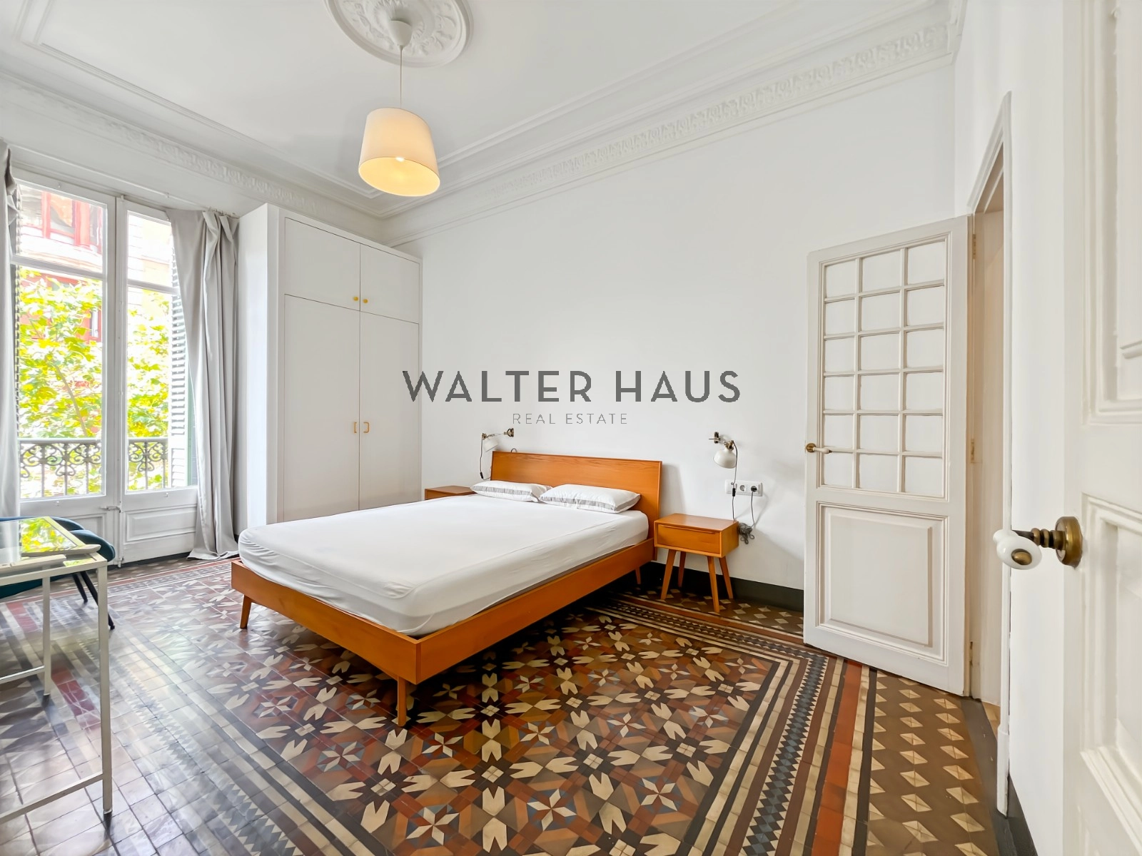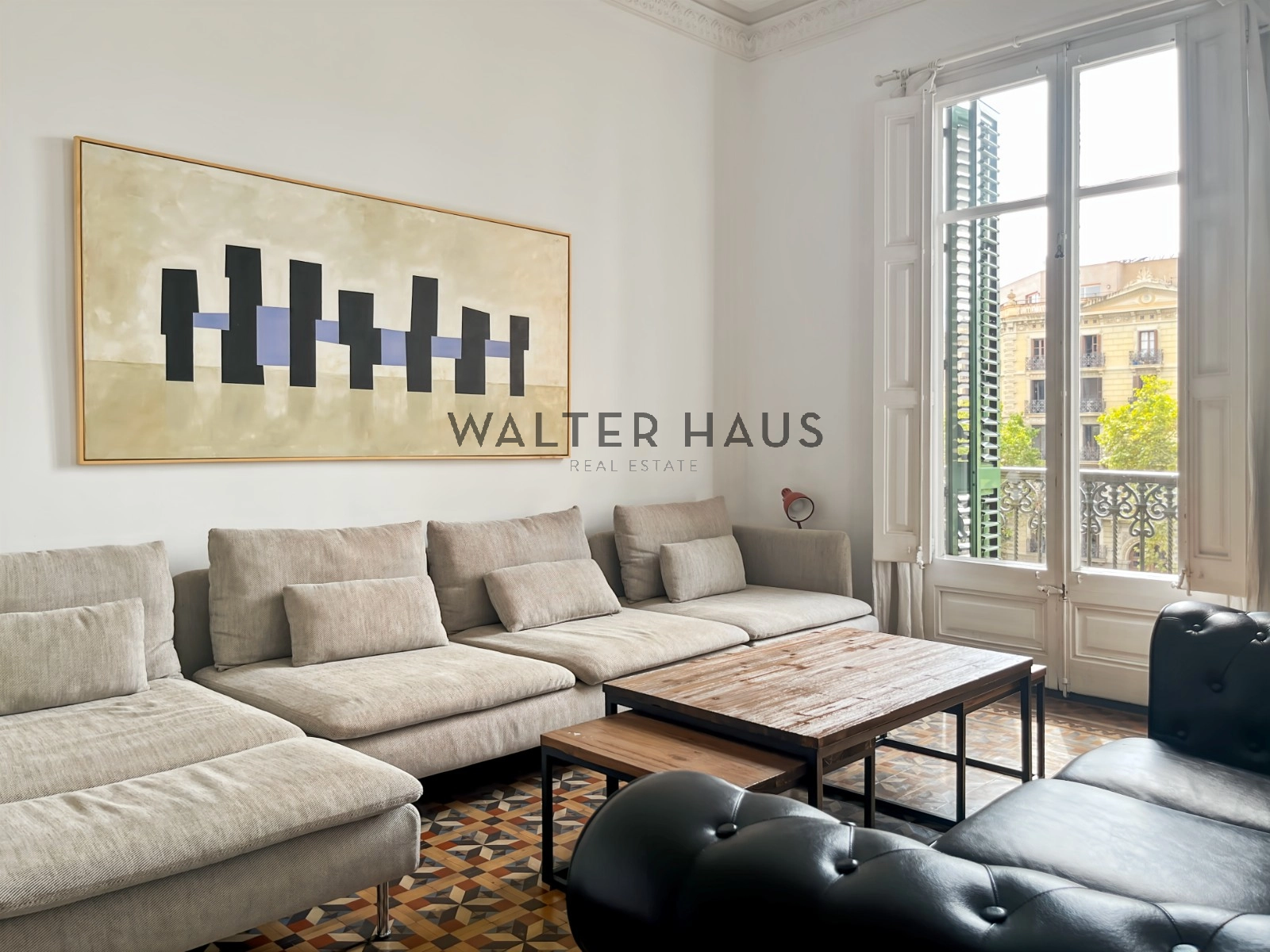 ALQUILER DE TEMPORADA. Fantástico piso de 115 m2 ubicado en la segunda planta de una finca regia con ascensor en el corazón del Quadrat d’Or de Barcelona, junto a la Plaza Tetuán, el Paseo de Sant Joan y el tradicional Paseo de Gràcia.