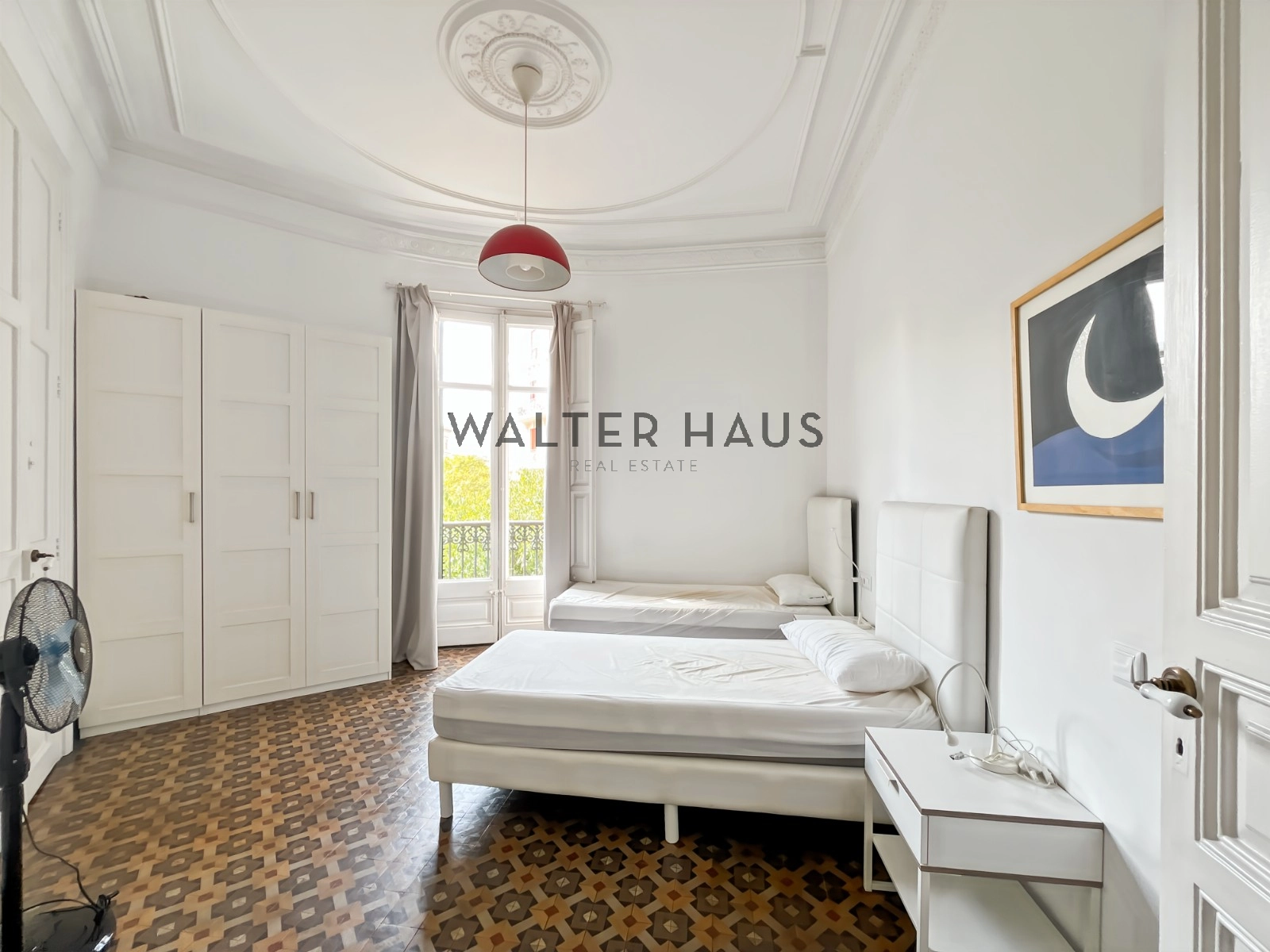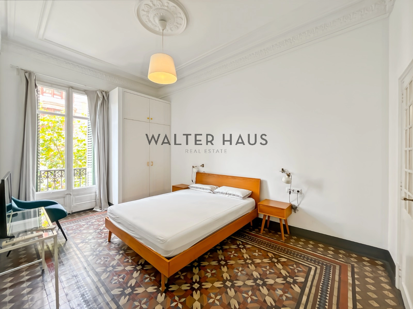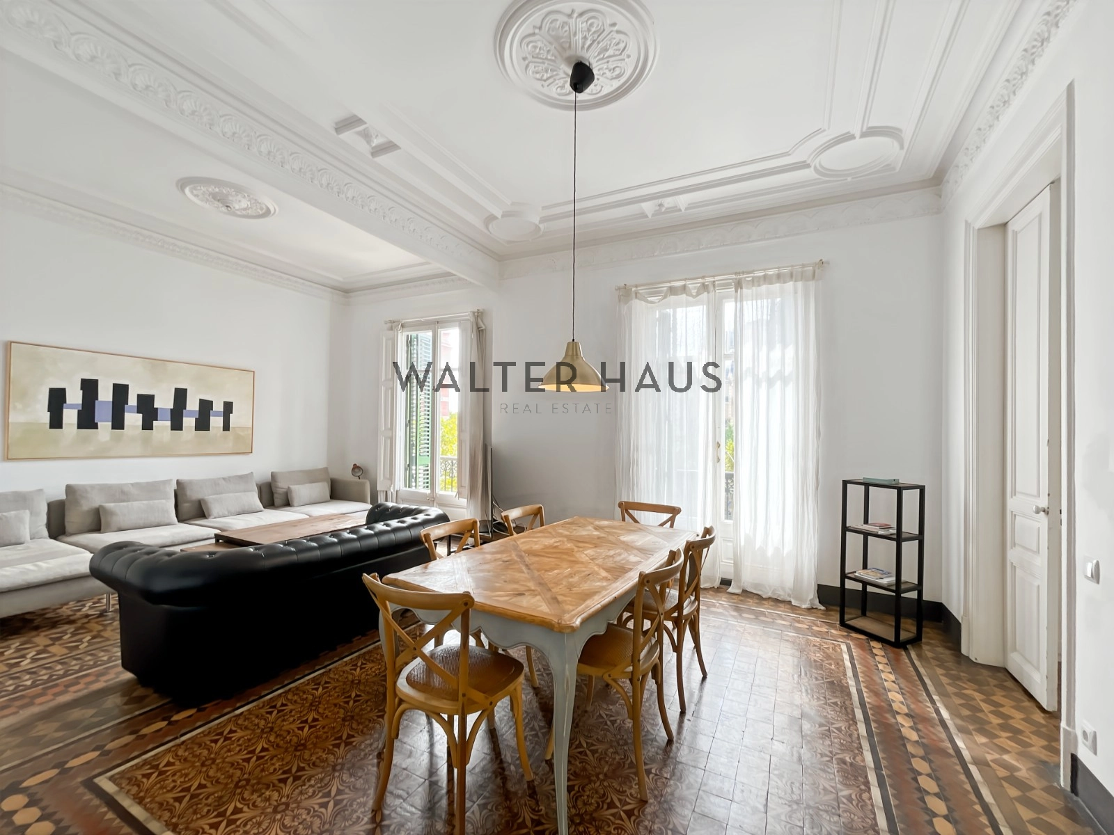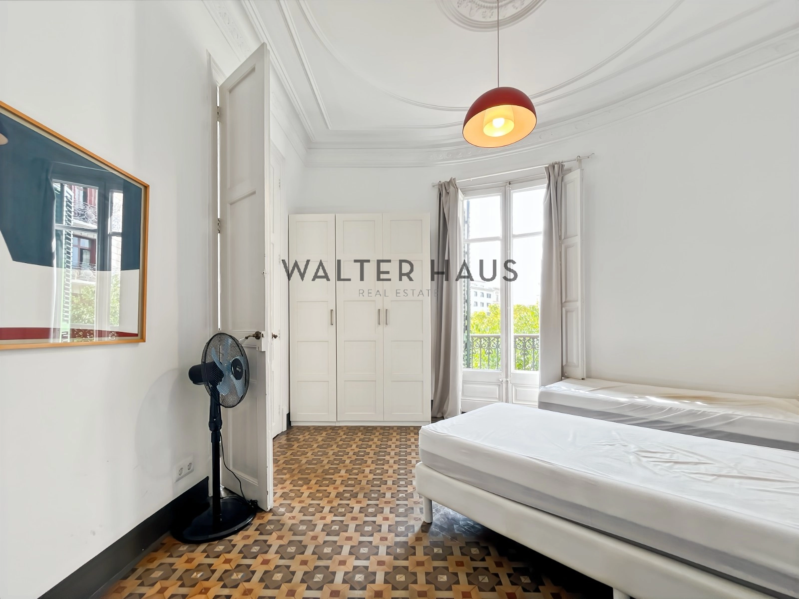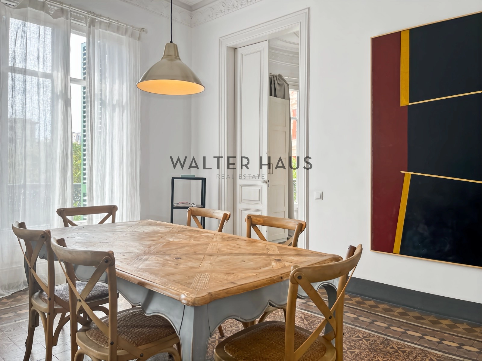 ALQUILER DE TEMPORADA. Fantástico piso de 115 m2 ubicado en la segunda planta de una finca regia con ascensor en el corazón del Quadrat d’Or de Barcelona, junto a la Plaza Tetuán, el Paseo de Sant Joan y el tradicional Paseo de Gràcia.