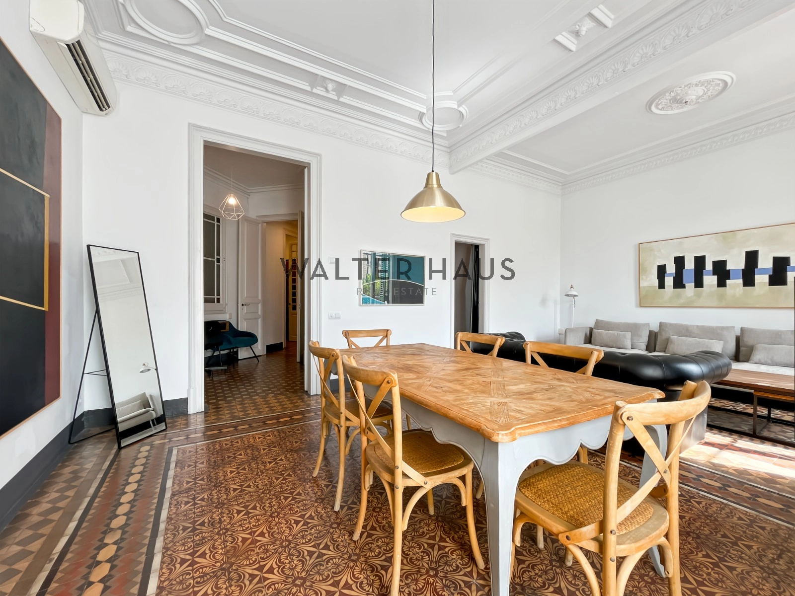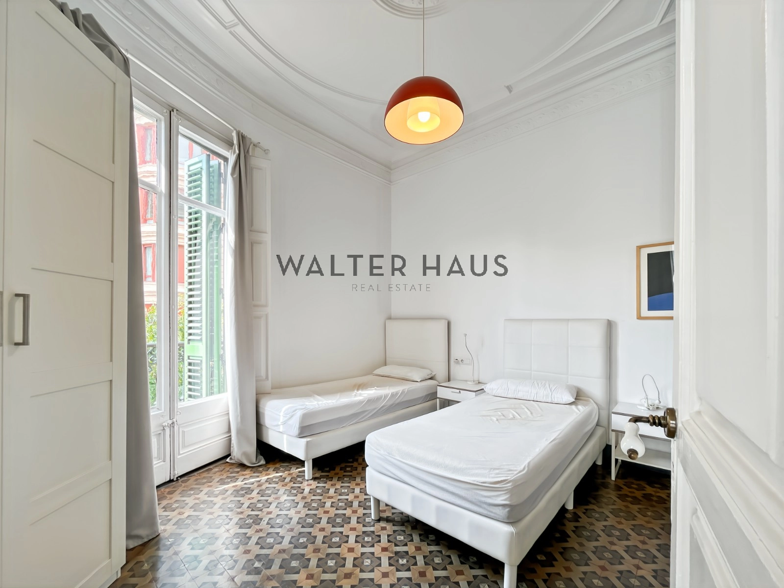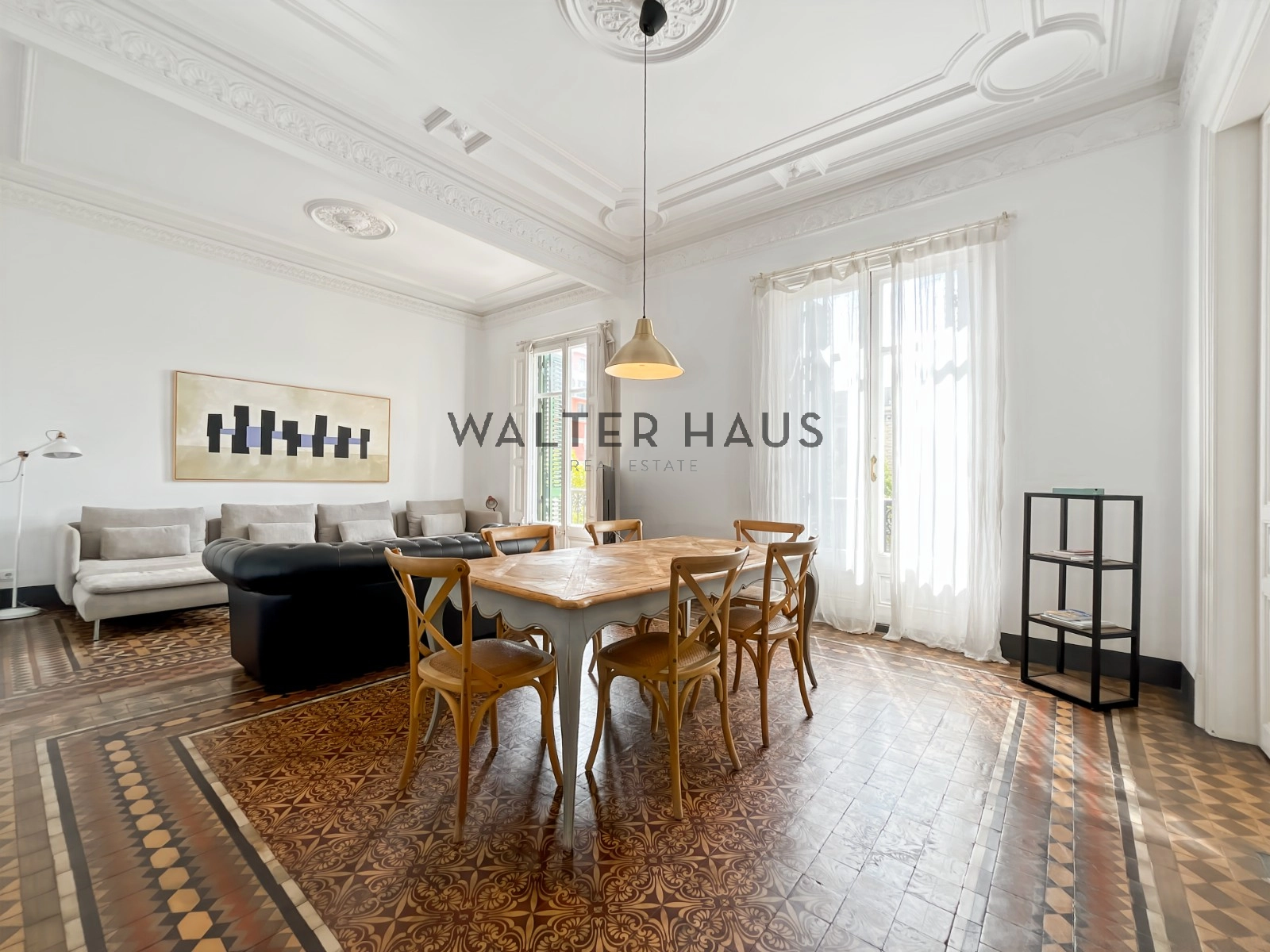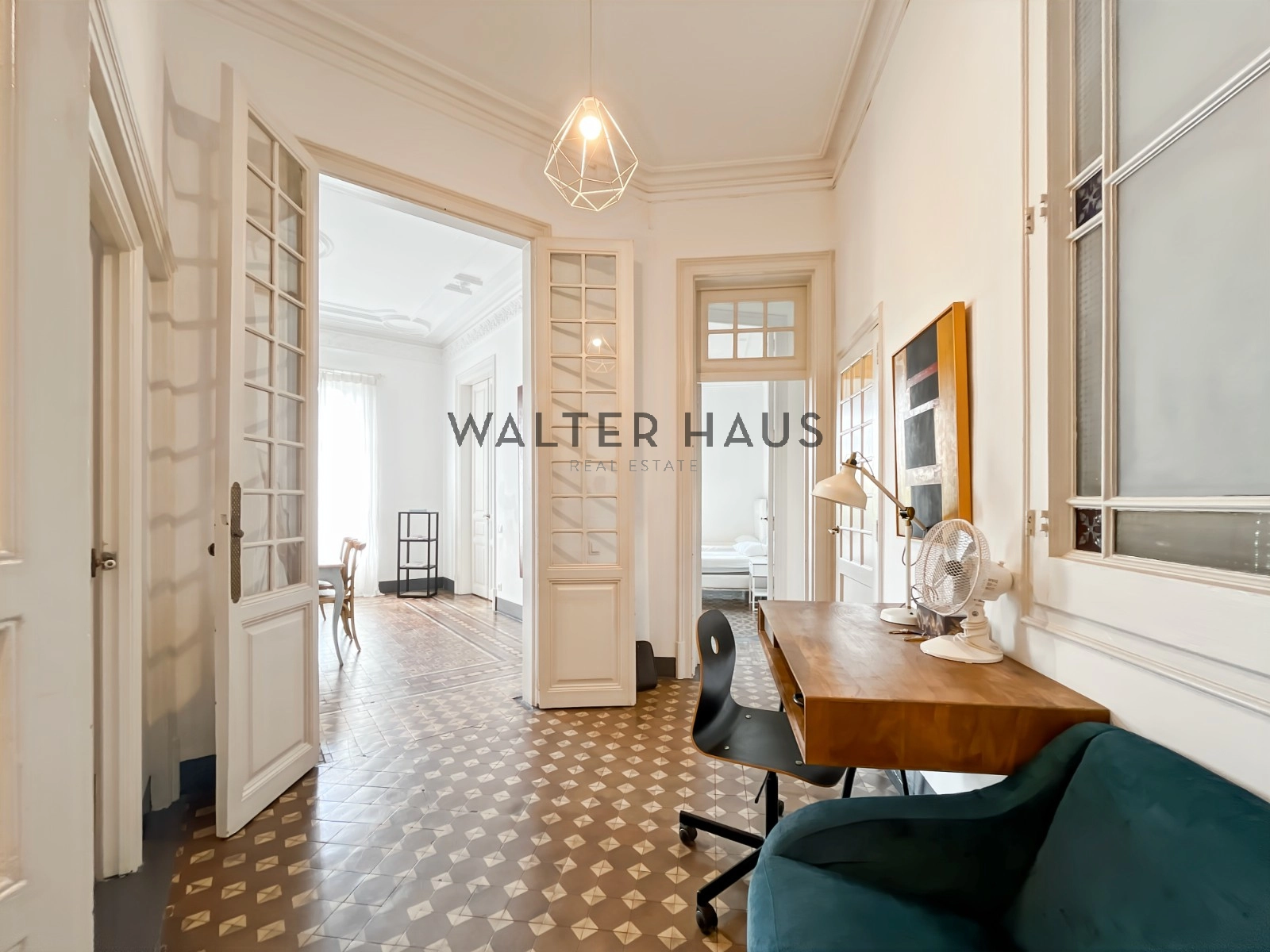 ALQUILER DE TEMPORADA. Fantástico piso de 115 m2 ubicado en la segunda planta de una finca regia con ascensor en el corazón del Quadrat d’Or de Barcelona, junto a la Plaza Tetuán, el Paseo de Sant Joan y el tradicional Paseo de Gràcia.
