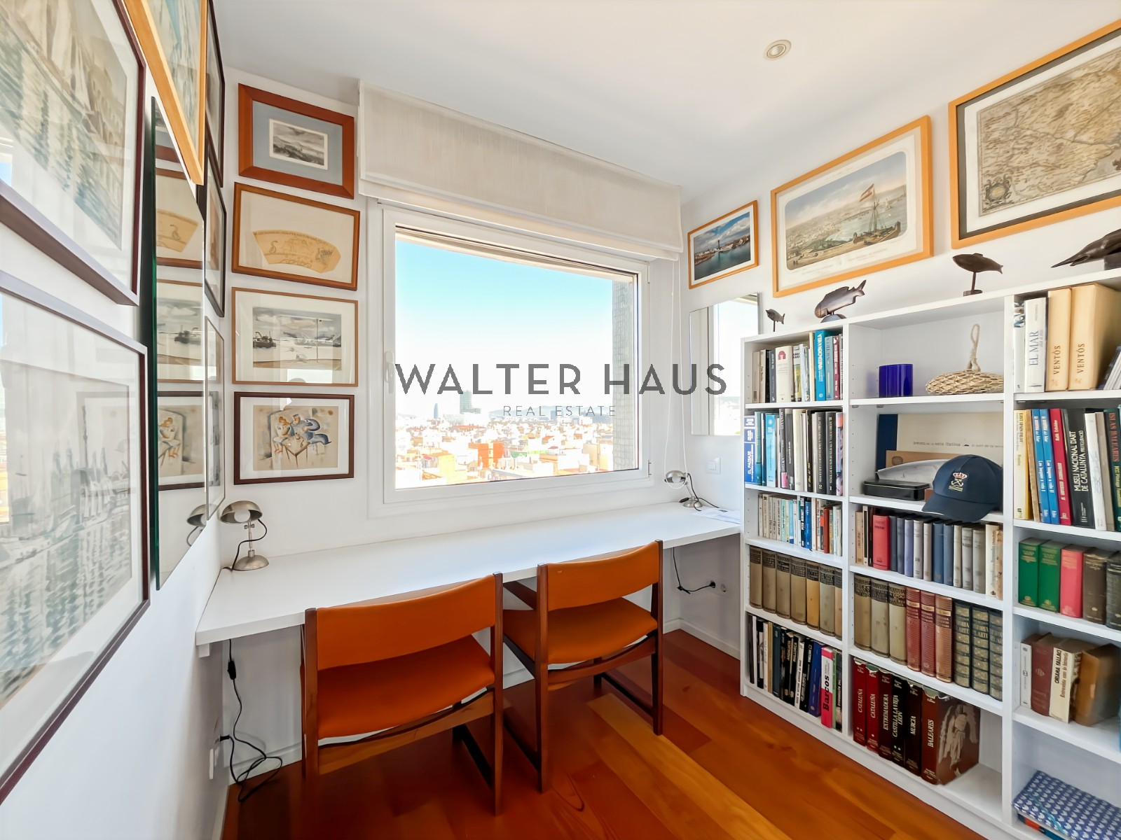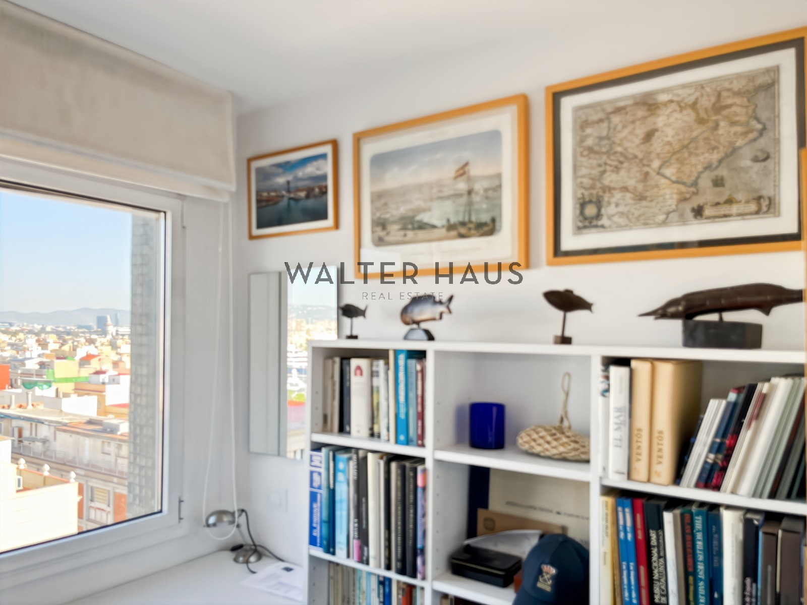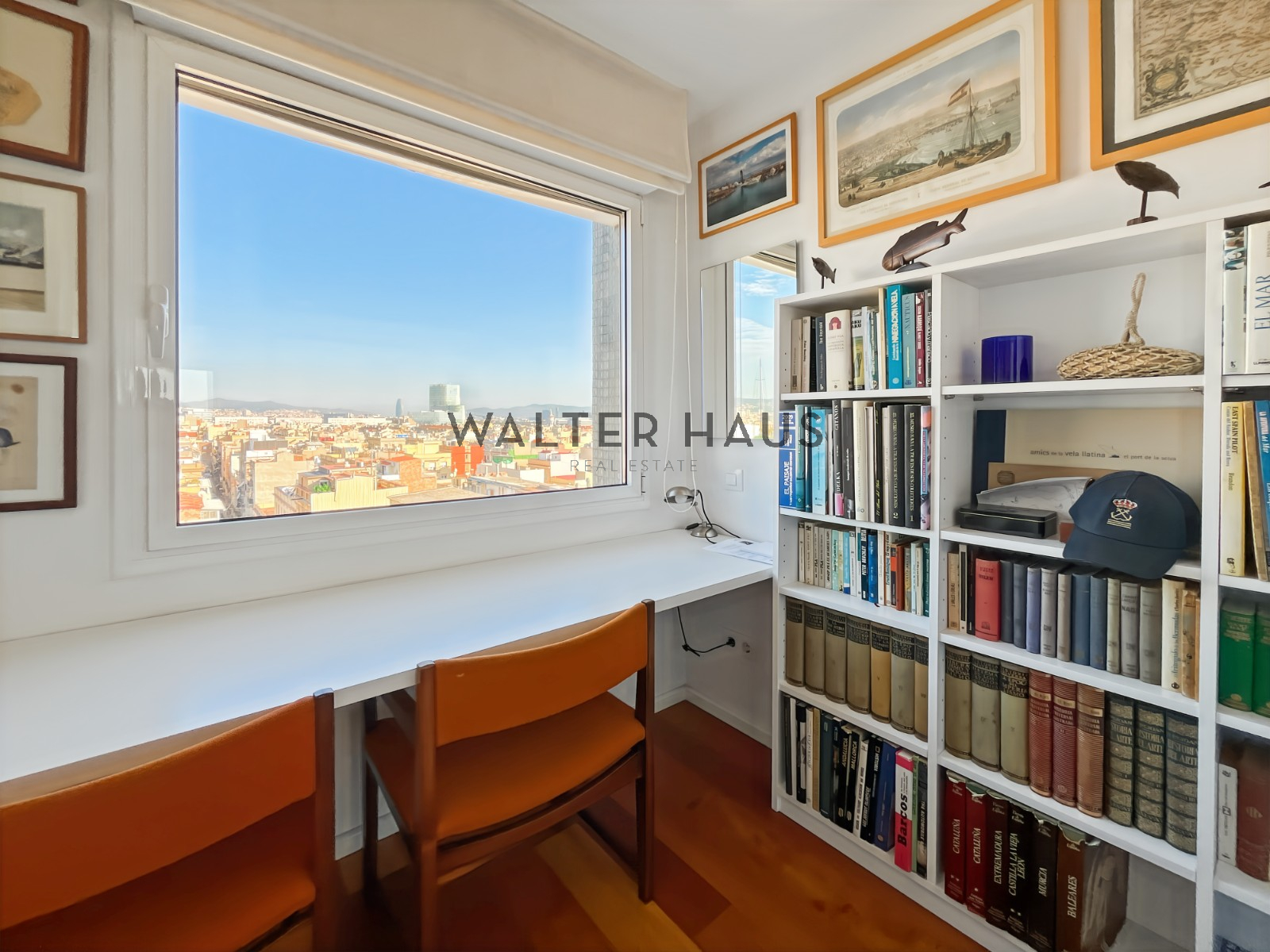 El inmueble se distribuye en un salón con salida a terraza en primera línea de mar; un comedor con cocina integrada, equipada con electrodomésticos de primera marca; una habitación doble con armario empotrado, con vistas al horizonte desde la cama; una segunda habitación configurada como despacho con vistas a la ciudad, donde se destacan la torre AGBAR y la Sagrada Familia; un baño completo y muy funcional y un lavadero.