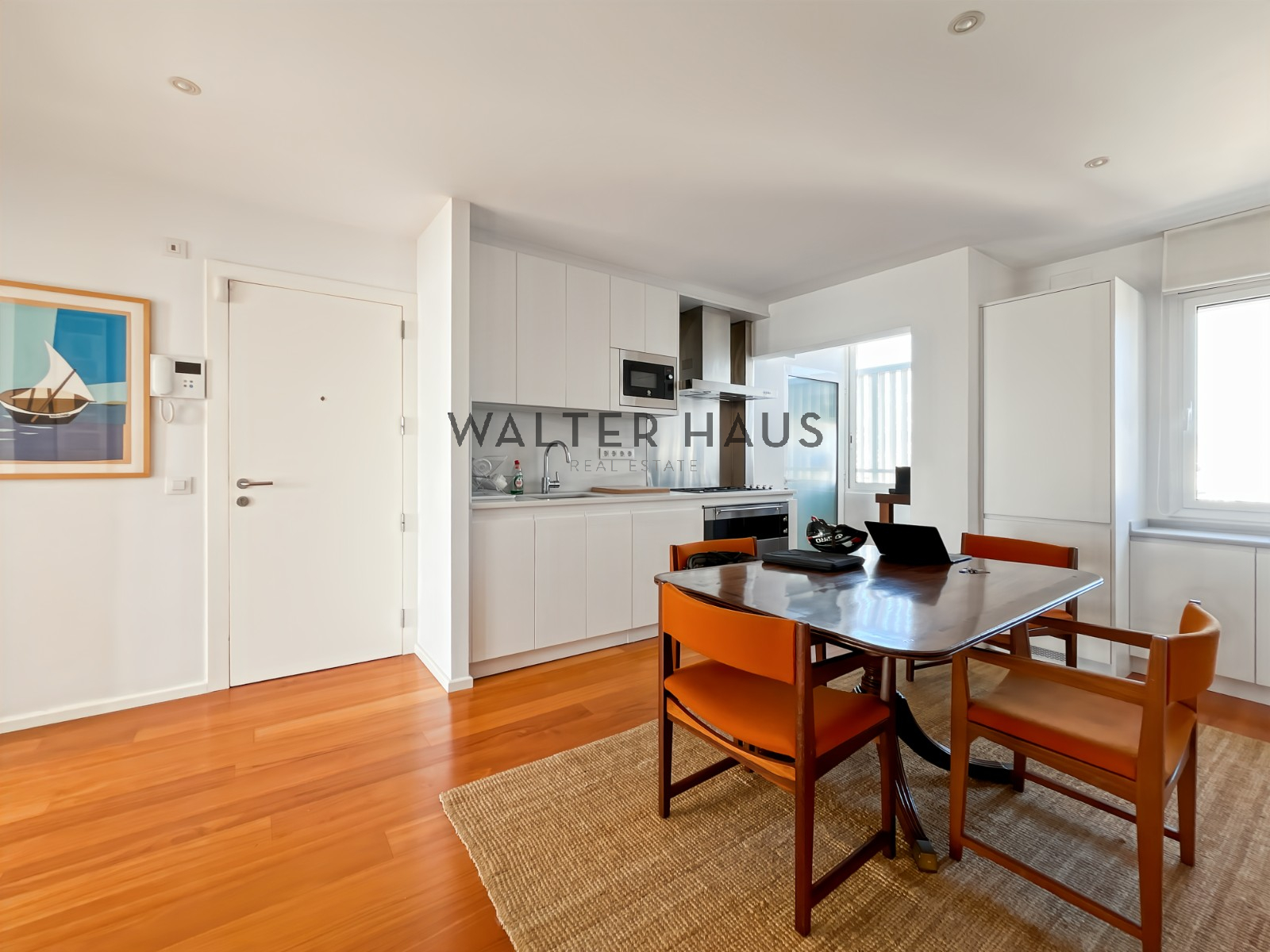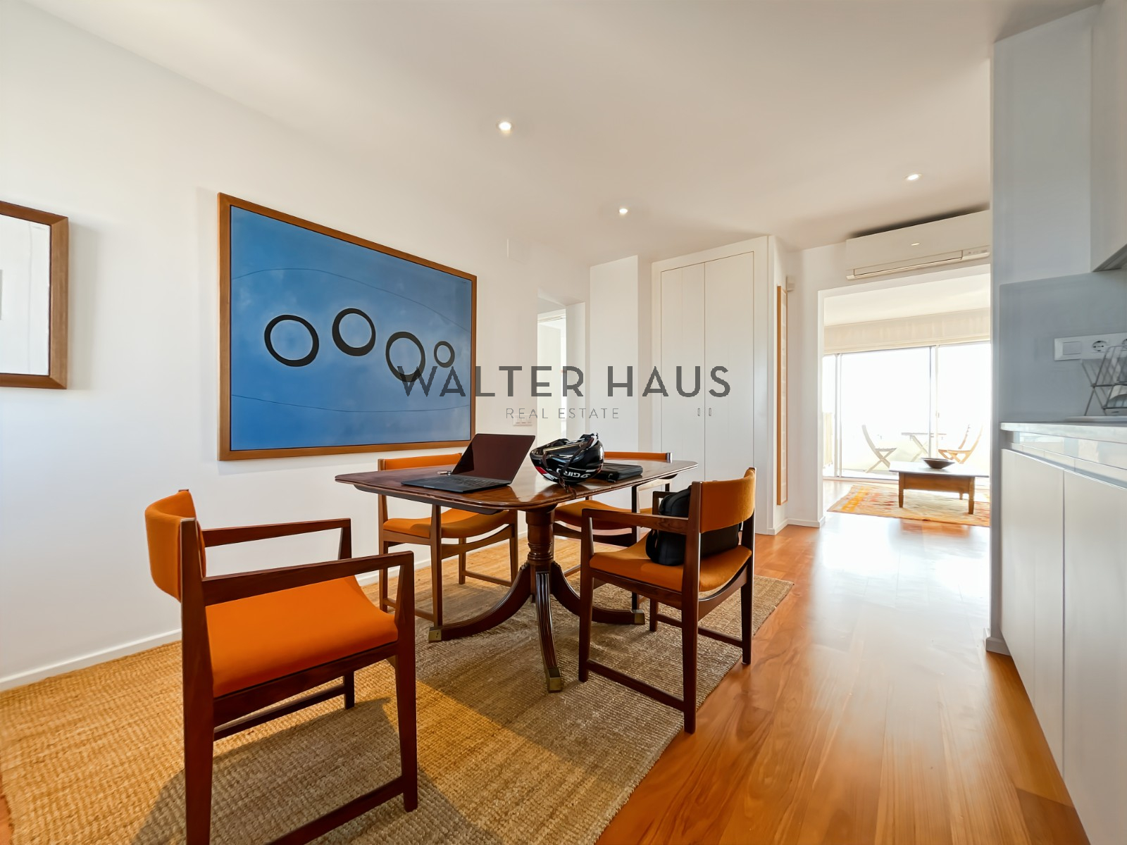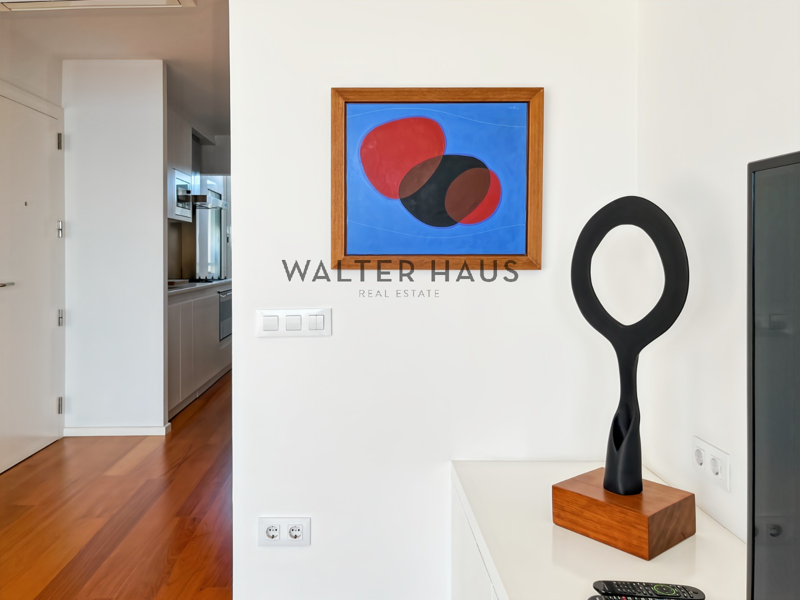 El inmueble se distribuye en un salón con salida a terraza en primera línea de mar; un comedor con cocina integrada, equipada con electrodomésticos de primera marca; una habitación doble con armario empotrado, con vistas al horizonte desde la cama; una segunda habitación configurada como despacho con vistas a la ciudad, donde se destacan la torre AGBAR y la Sagrada Familia; un baño completo y muy funcional y un lavadero.