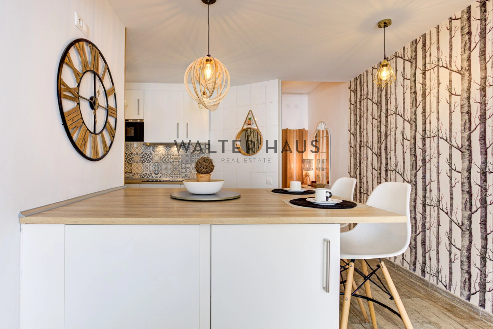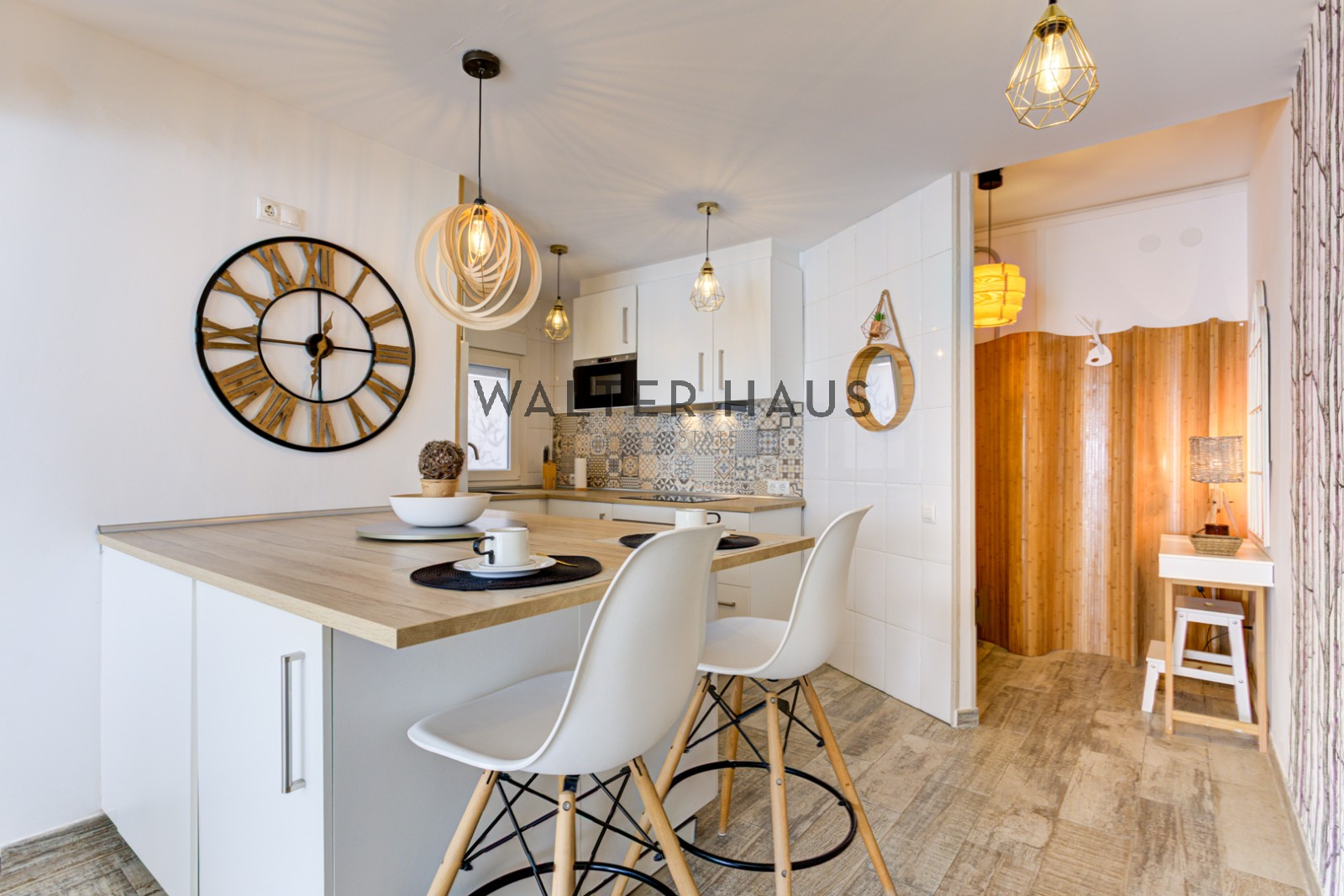 El área principal está compuesta por un salón-comedor con cocina abierta, perfectamente integrada y equipada con una gran isla central que se convierte en el punto de encuentro del hogar. La habitación doble, cuenta con baño completo en suite y acceso directo a una zona de lavado independiente, ofreciendo comodidad y privacidad en cada detalle.