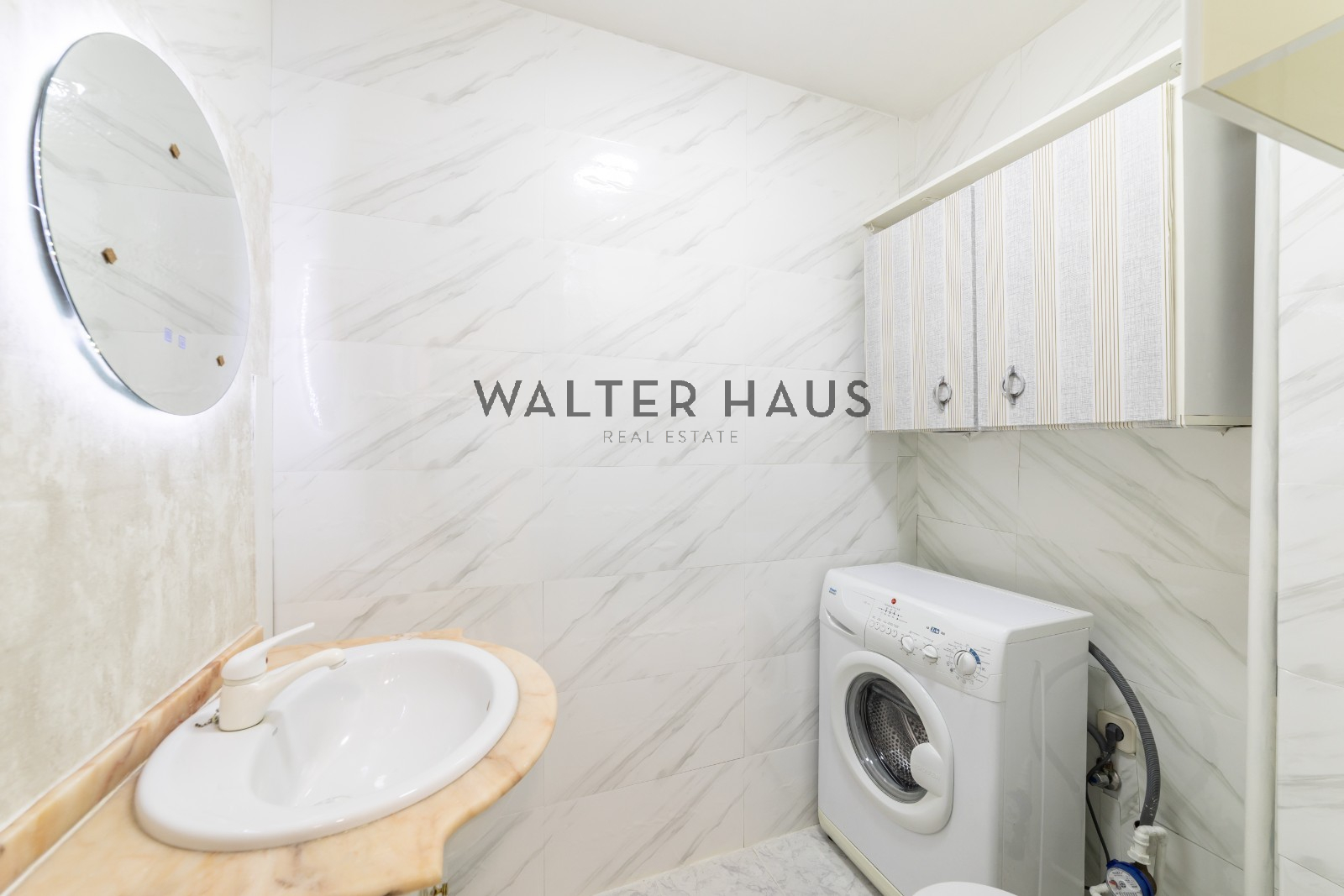 El interior de la vivienda ha sido diseñado con atención al detalle para el máximo aprovechamiento. El salón principal destaca por su gran luminosidad, creando una atmósfera acogedora para el descanso o las reuniones sociales. La cocina independiente se presenta completamente equipada con electrodomésticos modernos, y sus acabados en tonos blanco grisáceo aportan un toque de elegancia contemporánea. El dormitorio principal es un refugio privado, con una cómoda cama doble, amplios armarios empotrados y una decoración sobria y atemporal. Además, el cuarto de baño principal cuenta con una doble ducha, mientras que la propiedad dispone de un espacio adicional que puede funcionar como aseo o práctico lavadero.