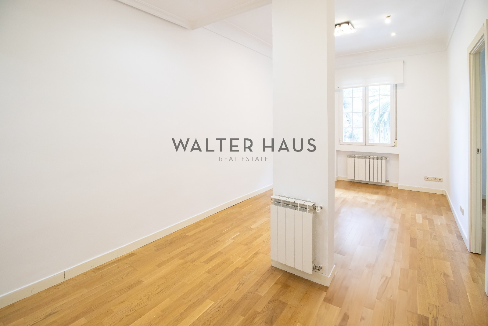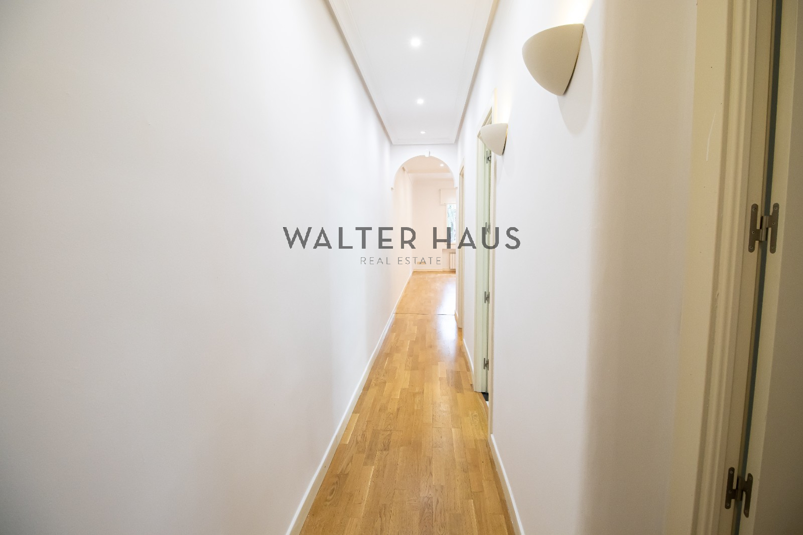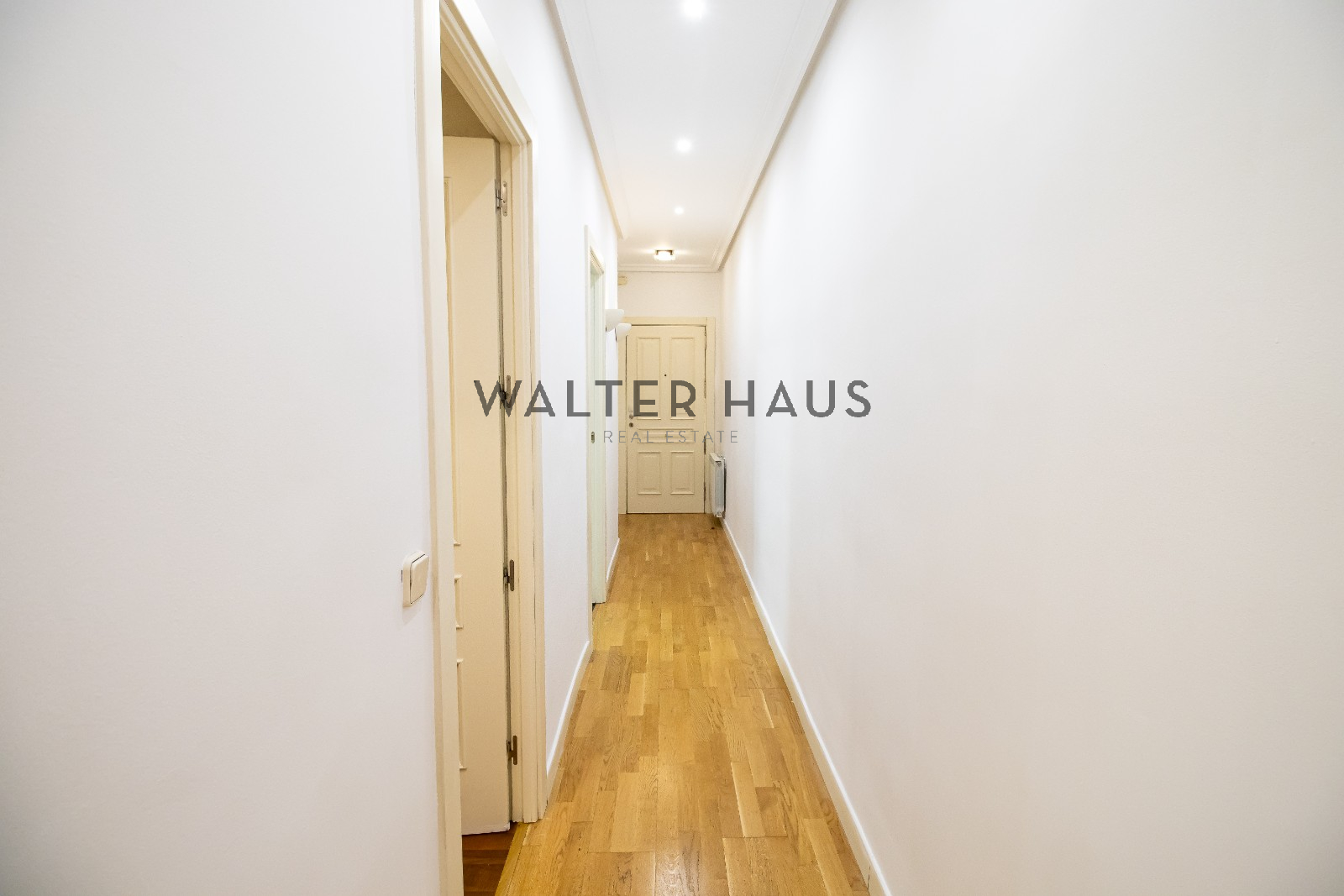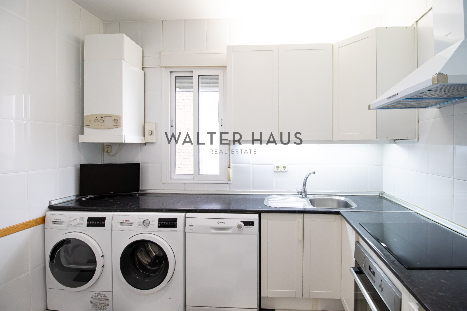 El interior del piso ha sido reformado para optimizar su funcionalidad. Consta de dos dormitorios dobles y uno individual, un salón-comedor exterior con dos ambientes separados, y una cocina independiente con ventana al patio, que ofrece espacio para una zona de comedor y cuenta con electrodomésticos de alta eficiencia. El baño tiene lavabo de mármol, ducha termostática y ventana al patio. La vivienda dispone de caldera individual de gas natural para agua caliente y calefacción por radiadores, además de aire acondicionado y bomba de calor de alta eficiencia (A++). Todas las ventanas tienen doble acristalamiento y la iluminación de todas las habitaciones es de bajo consumo. Incluye un práctico maletero.