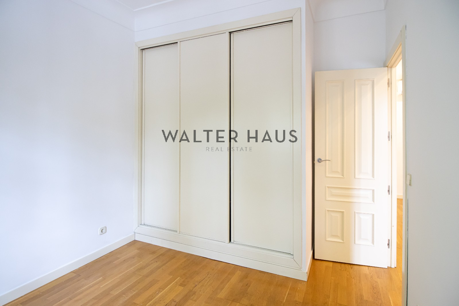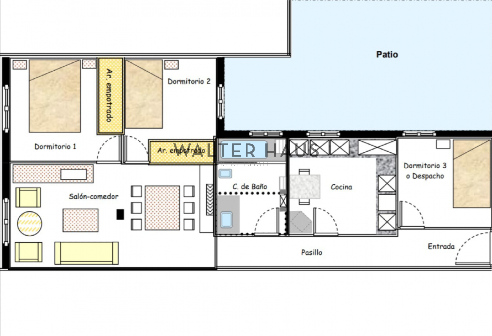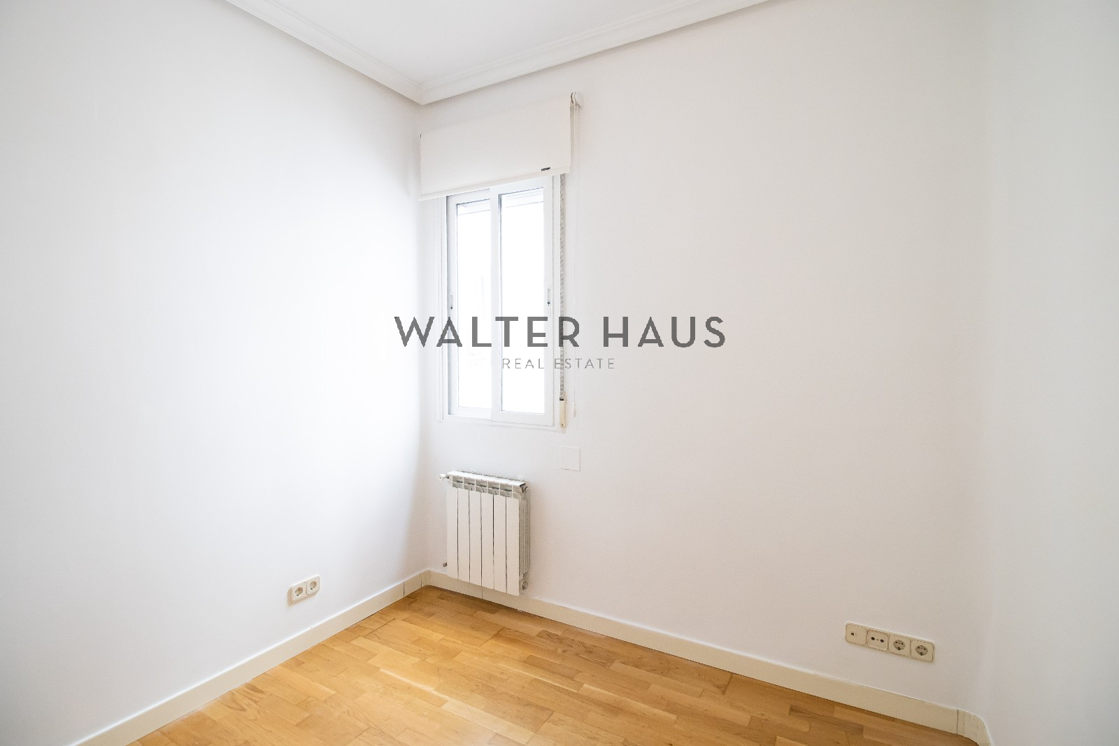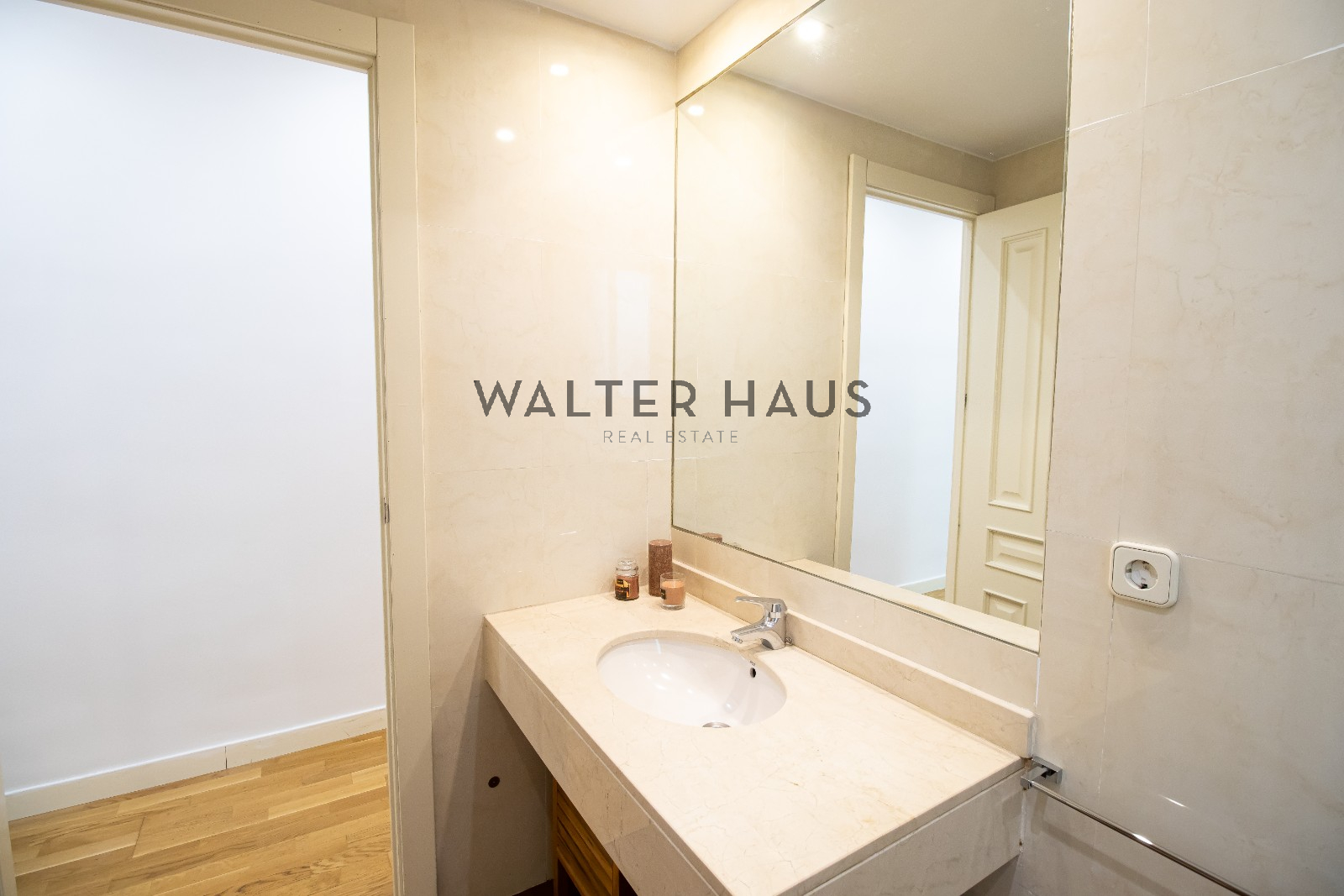 El interior del piso ha sido reformado para optimizar su funcionalidad. Consta de dos dormitorios dobles y uno individual, un salón-comedor exterior con dos ambientes separados, y una cocina independiente con ventana al patio, que ofrece espacio para una zona de comedor y cuenta con electrodomésticos de alta eficiencia. El baño tiene lavabo de mármol, ducha termostática y ventana al patio. La vivienda dispone de caldera individual de gas natural para agua caliente y calefacción por radiadores, además de aire acondicionado y bomba de calor de alta eficiencia (A++). Todas las ventanas tienen doble acristalamiento y la iluminación de todas las habitaciones es de bajo consumo. Incluye un práctico maletero.