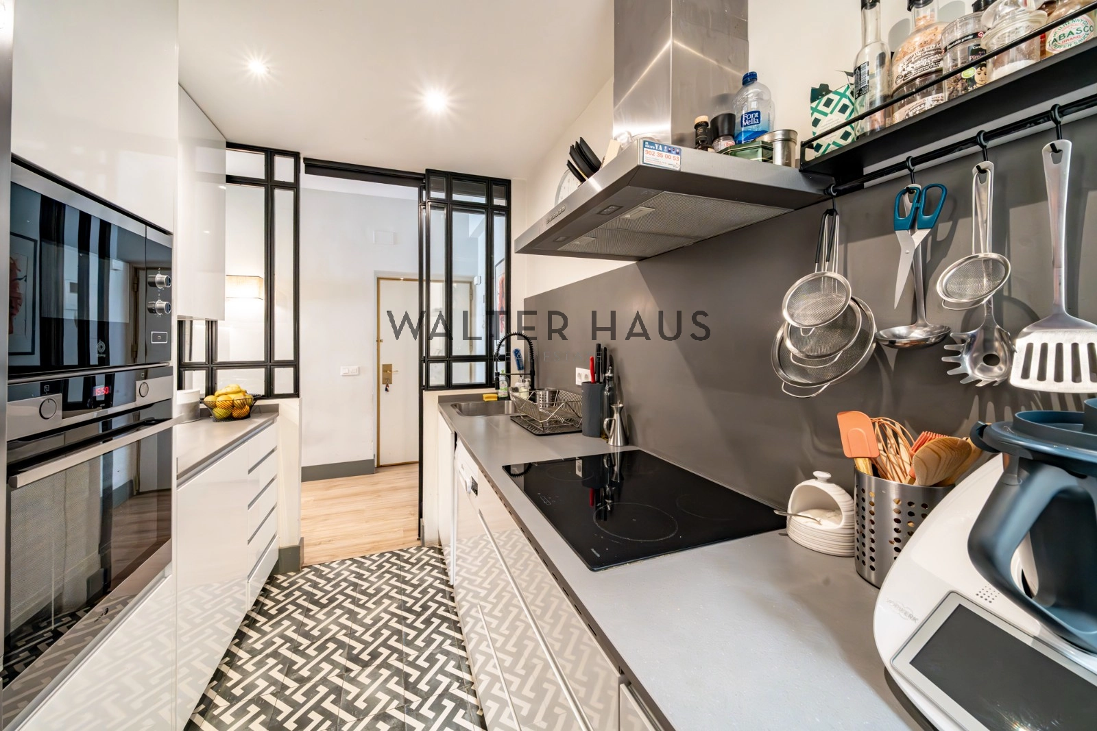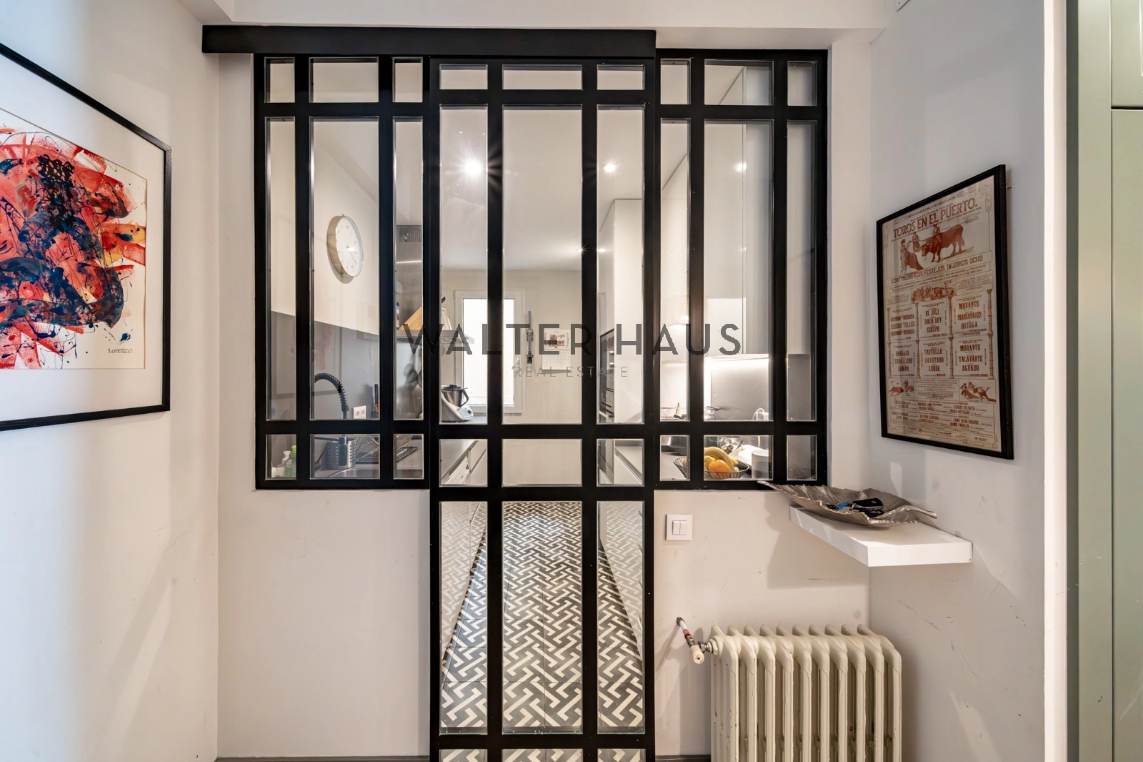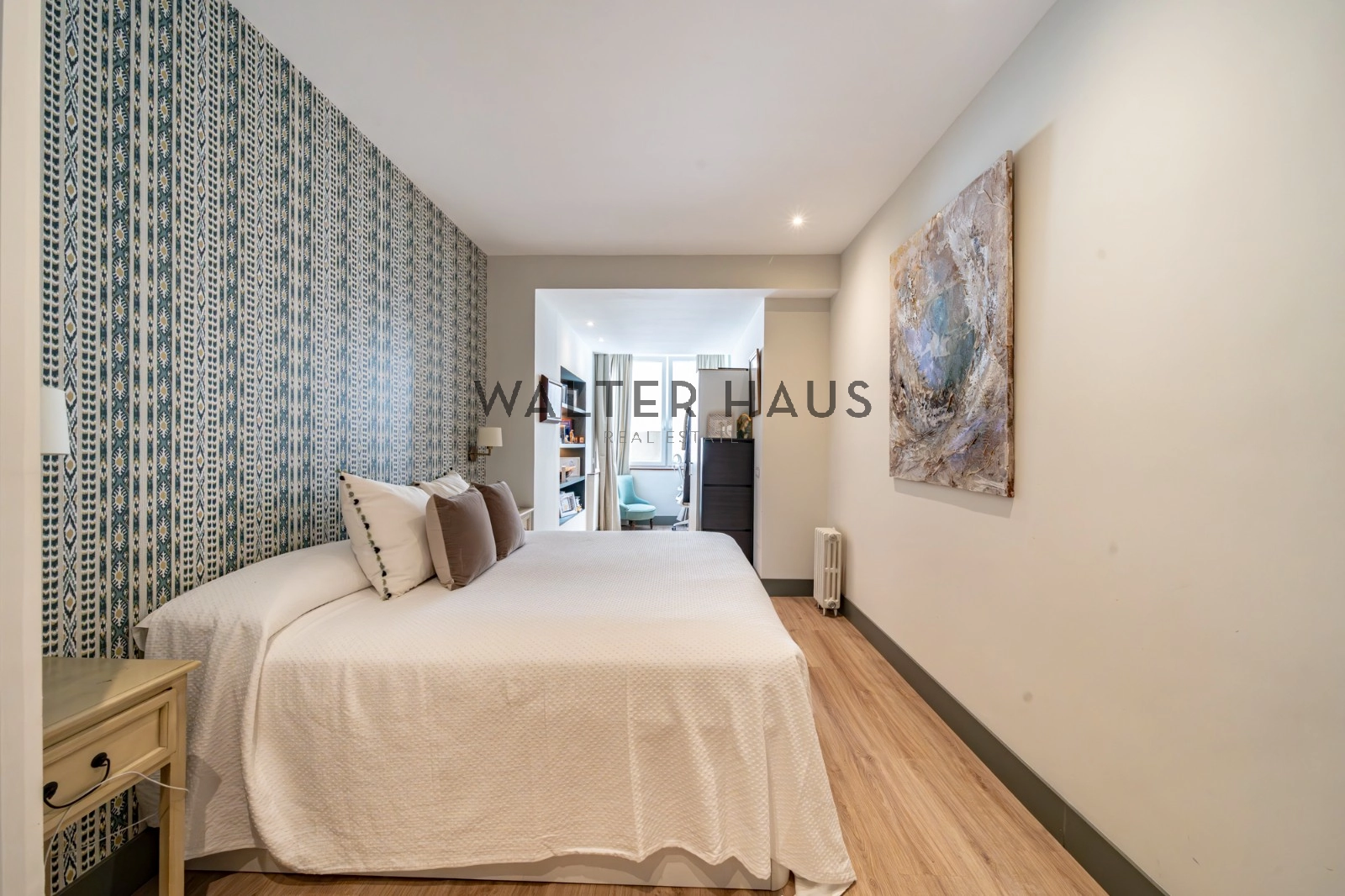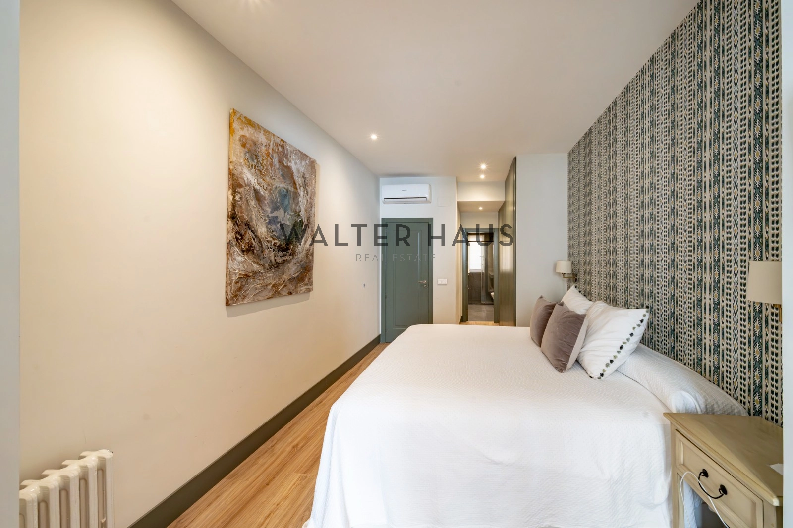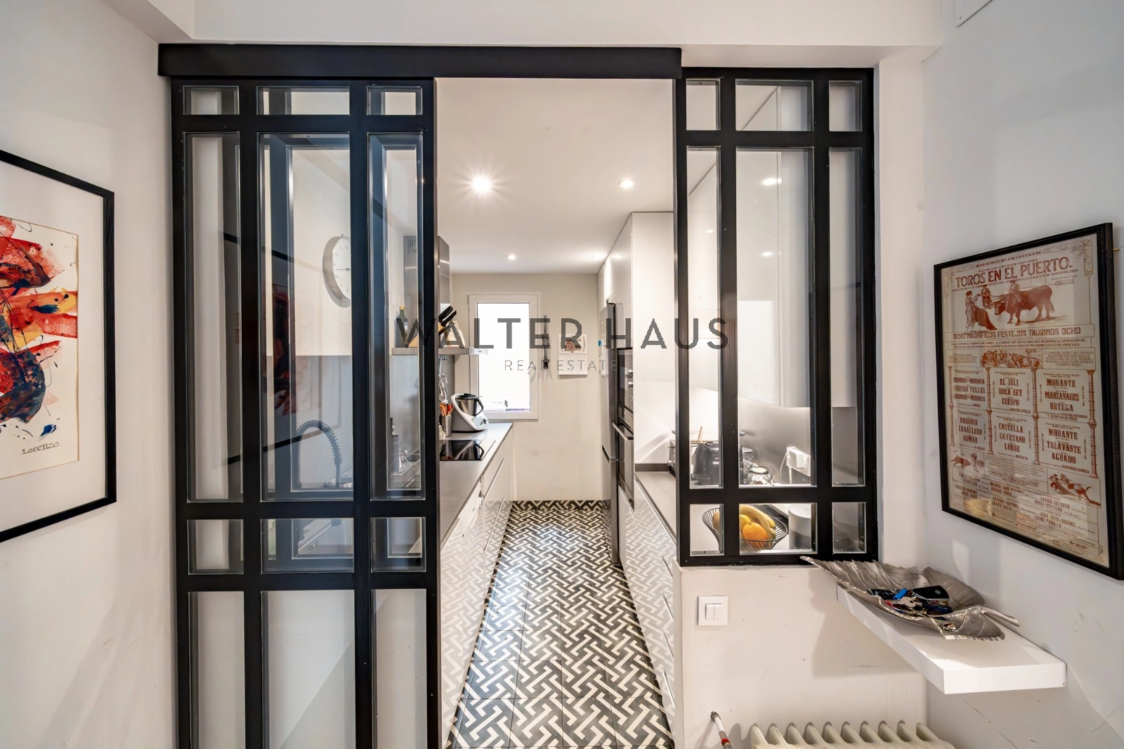 Al acceder a la vivienda, un práctico recibidor nos da paso a una cocina prácticamente a estrenar, equipada con electrodomésticos de primeras marcas, todos ellos en garantía. El pasillo conduce a una luminosa zona diáfana que integra el salón y el comedor, este último con un armario para vajilla y cristalería con capacidad para una mesa de hasta diez comensales. Desde el salón, una gran ventana de suelo a techo se abre a un amplio y silencioso patio de manzana, que inunda la estancia de luz natural. Además, todas las estancias y baños de la vivienda cuentan con su propia ventana. El dormitorio principal es un espacio multifuncional con baño en suite, una amplia zona de descanso con armarios empotrados y un área final de despacho con biblioteca de obra.