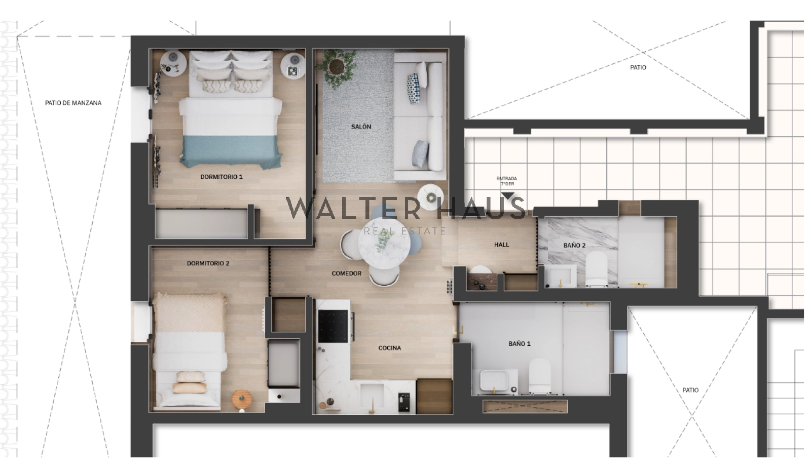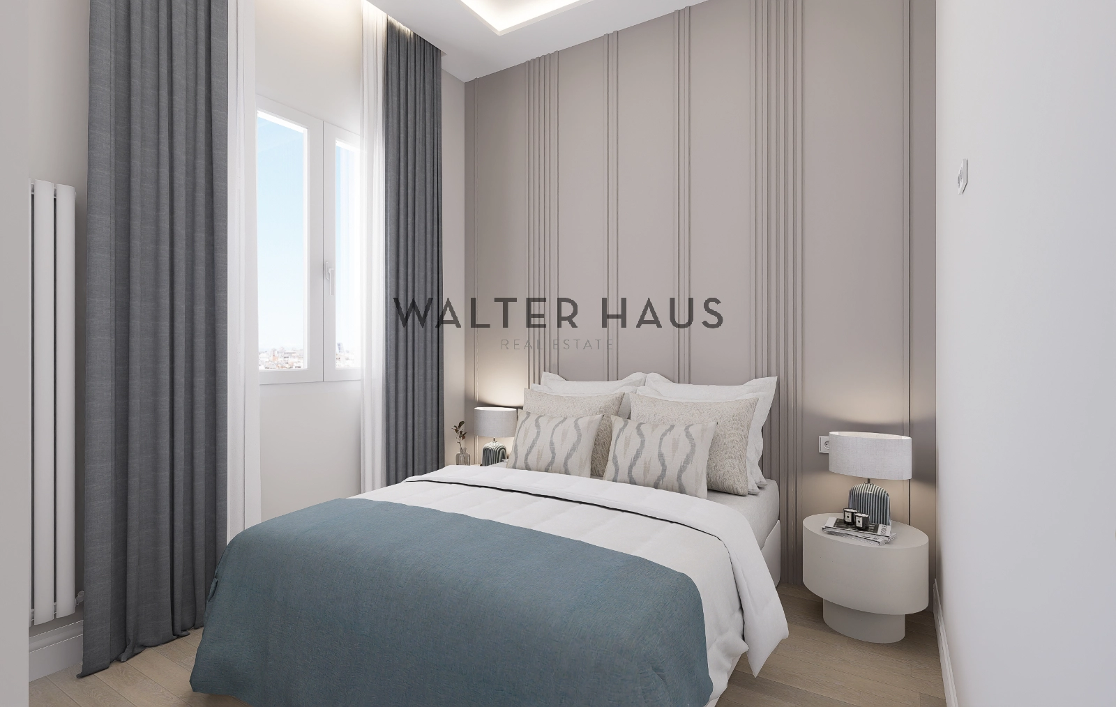 El diseño interior de este inmueble amueblado y listo para entrar a vivir destaca por su funcionalidad y atmósfera contemporánea. El espacio se organiza en un luminoso salón-comedor y una moderna cocina completamente equipada, creando un área social fluida y acogedora. La zona de descanso se compone de dos dormitorios bien proporcionados y dos cuartos de baño completos, ambos con acabados de alta calidad. Cada detalle ha sido cuidadosamente seleccionado para potenciar la luminosidad y generar una placentera sensación de amplitud y calma, ideal para un estilo de vida sofisticado y moderno en el centro de Madrid.
