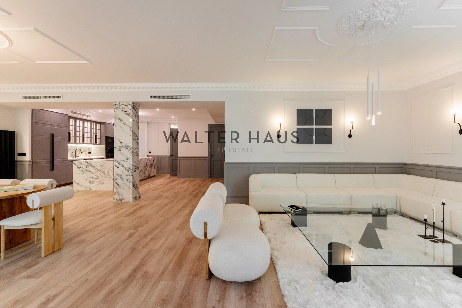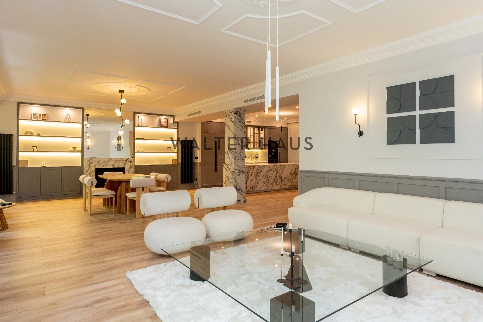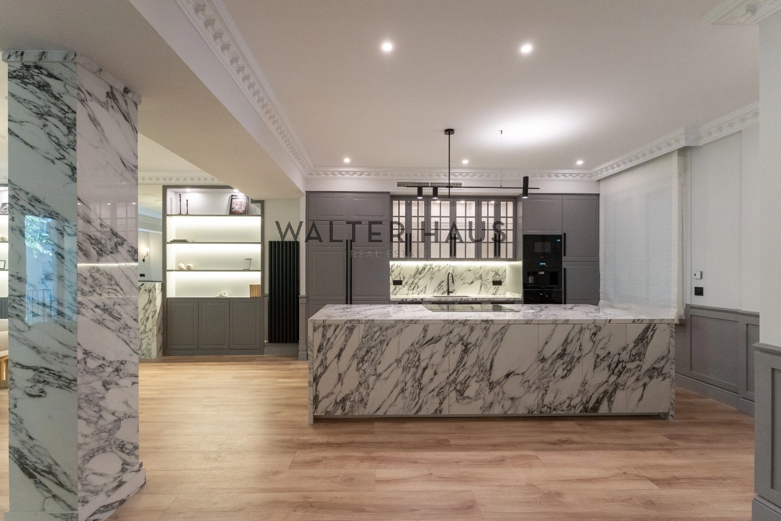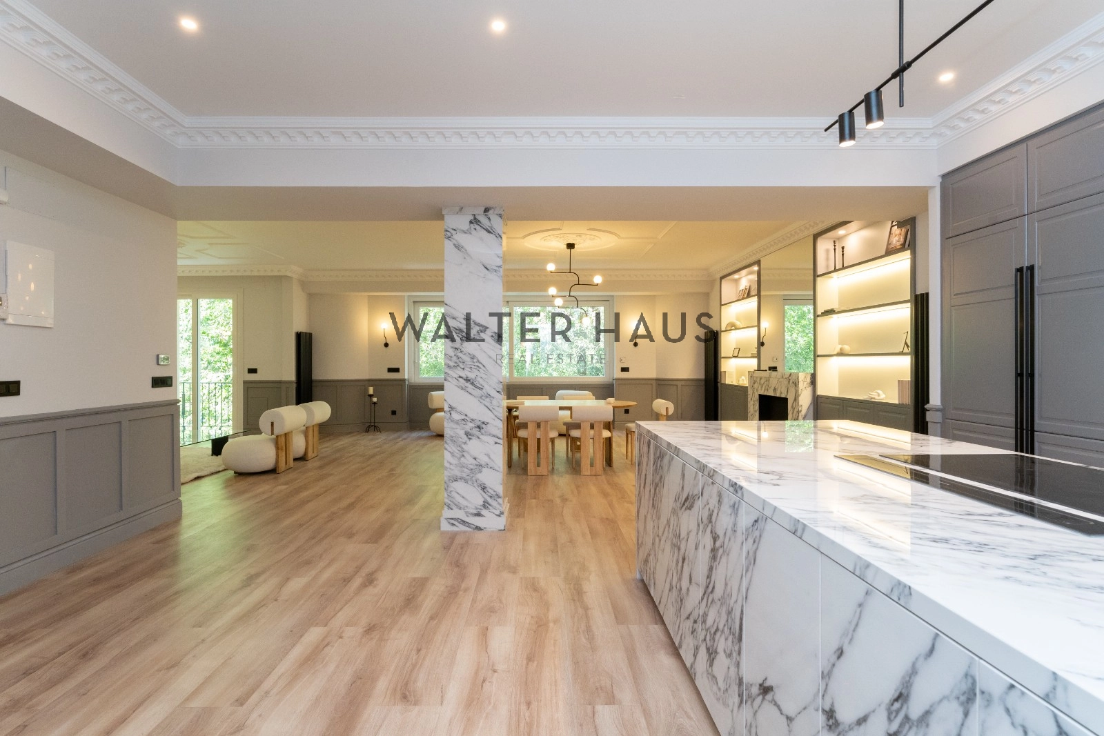El espacioso y luminoso salón se divide en dos ambientes, proporcionando un espacio perfecto para el entretenimiento y la relajación. La zona de estar cuenta con una acogedora terraza, ideal para disfrutar de una mesita y dos butacas. La cocina, integrada en el salón, está equipada con electrodomésticos de primera calidad y cuenta con una gran isla central que actúa como divisoria entre el comedor y la cocina, ofreciendo una amplia capacidad de almacenamiento y un espacio ideal para desayunos, cenas y como zona de trabajo culinario.