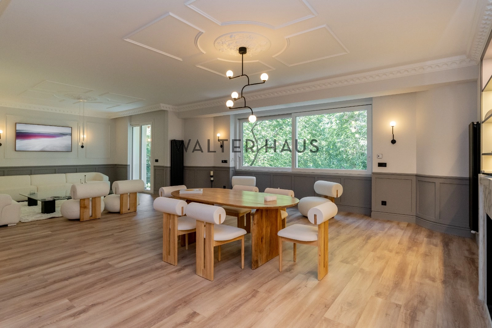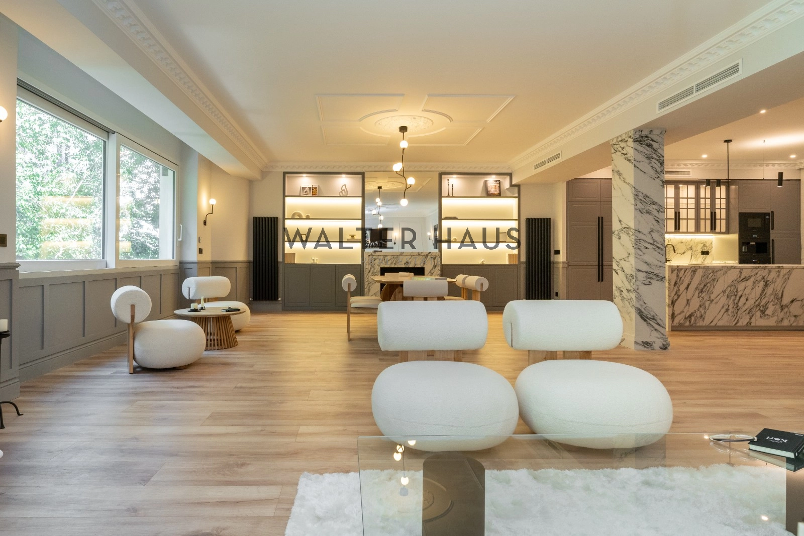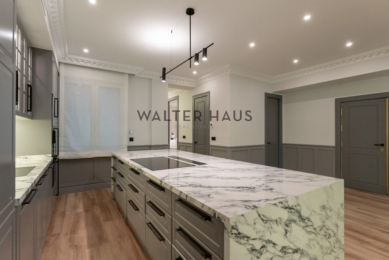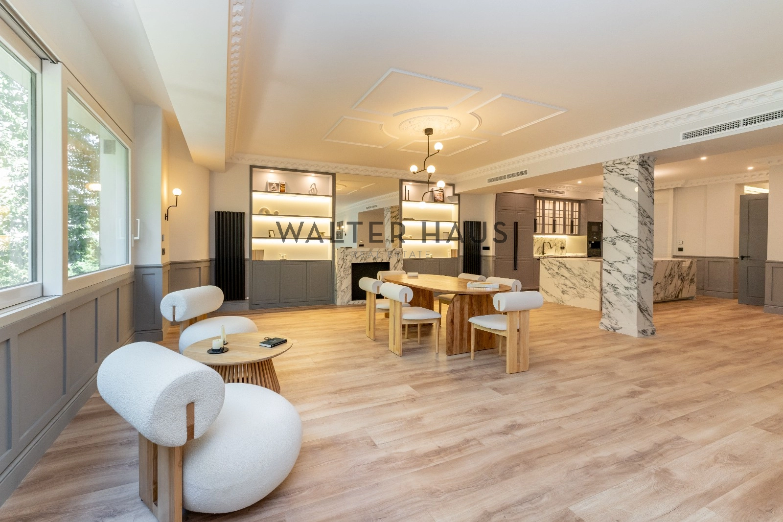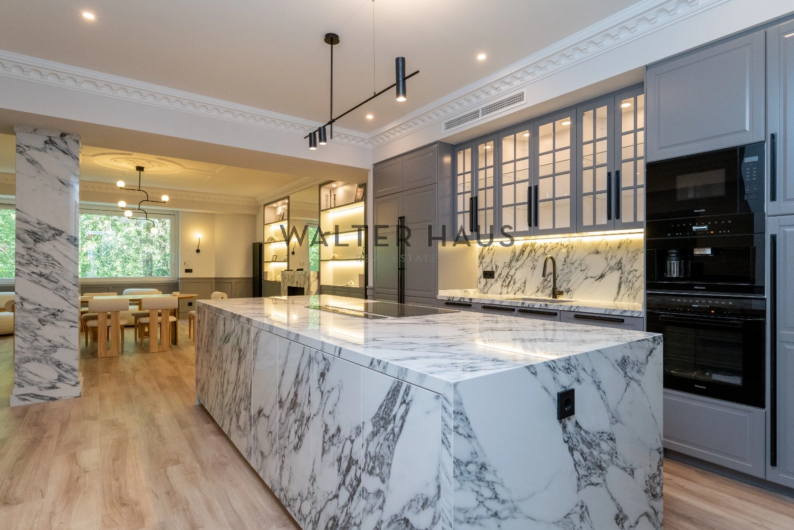 El espacioso y luminoso salón se divide en dos ambientes, proporcionando un espacio perfecto para el entretenimiento y la relajación. La zona de estar cuenta con una acogedora terraza, ideal para disfrutar de una mesita y dos butacas. La cocina, integrada en el salón, está equipada con electrodomésticos de primera calidad y cuenta con una gran isla central que actúa como divisoria entre el comedor y la cocina, ofreciendo una amplia capacidad de almacenamiento y un espacio ideal para desayunos, cenas y como zona de trabajo culinario.