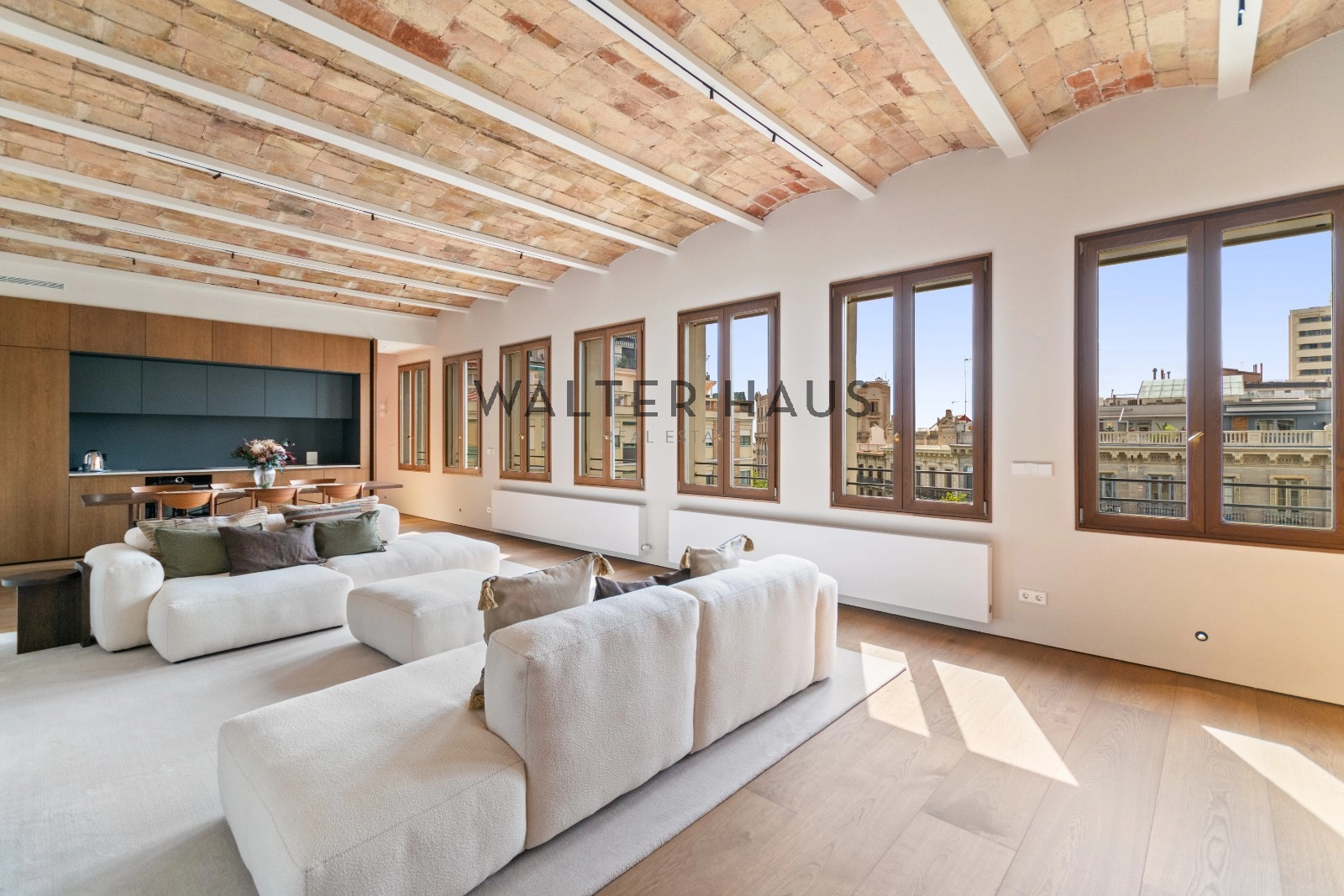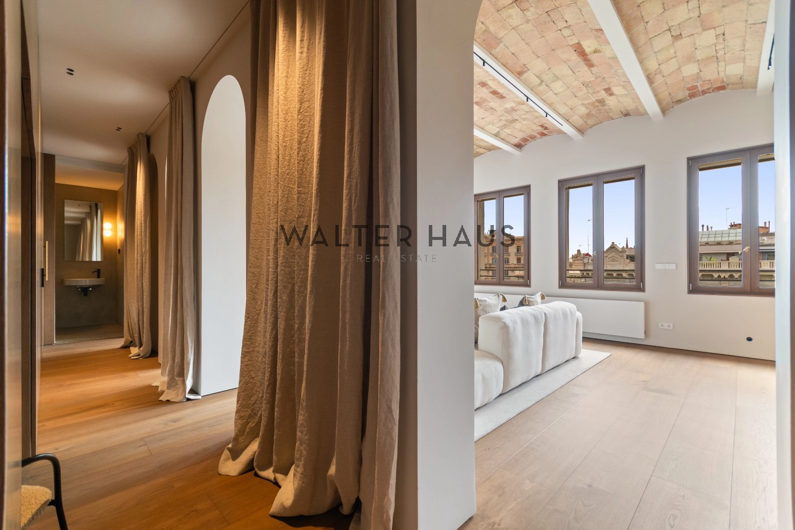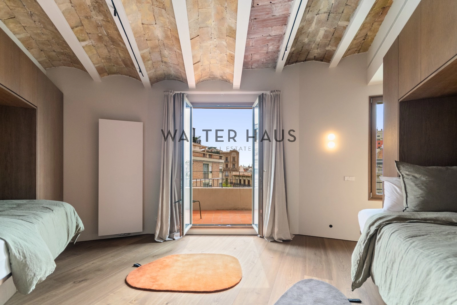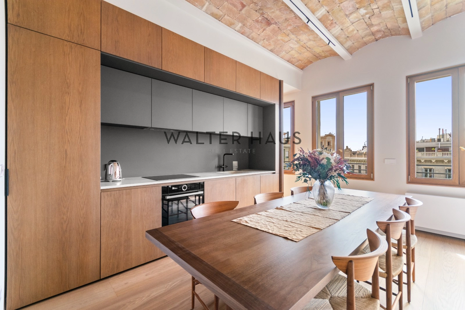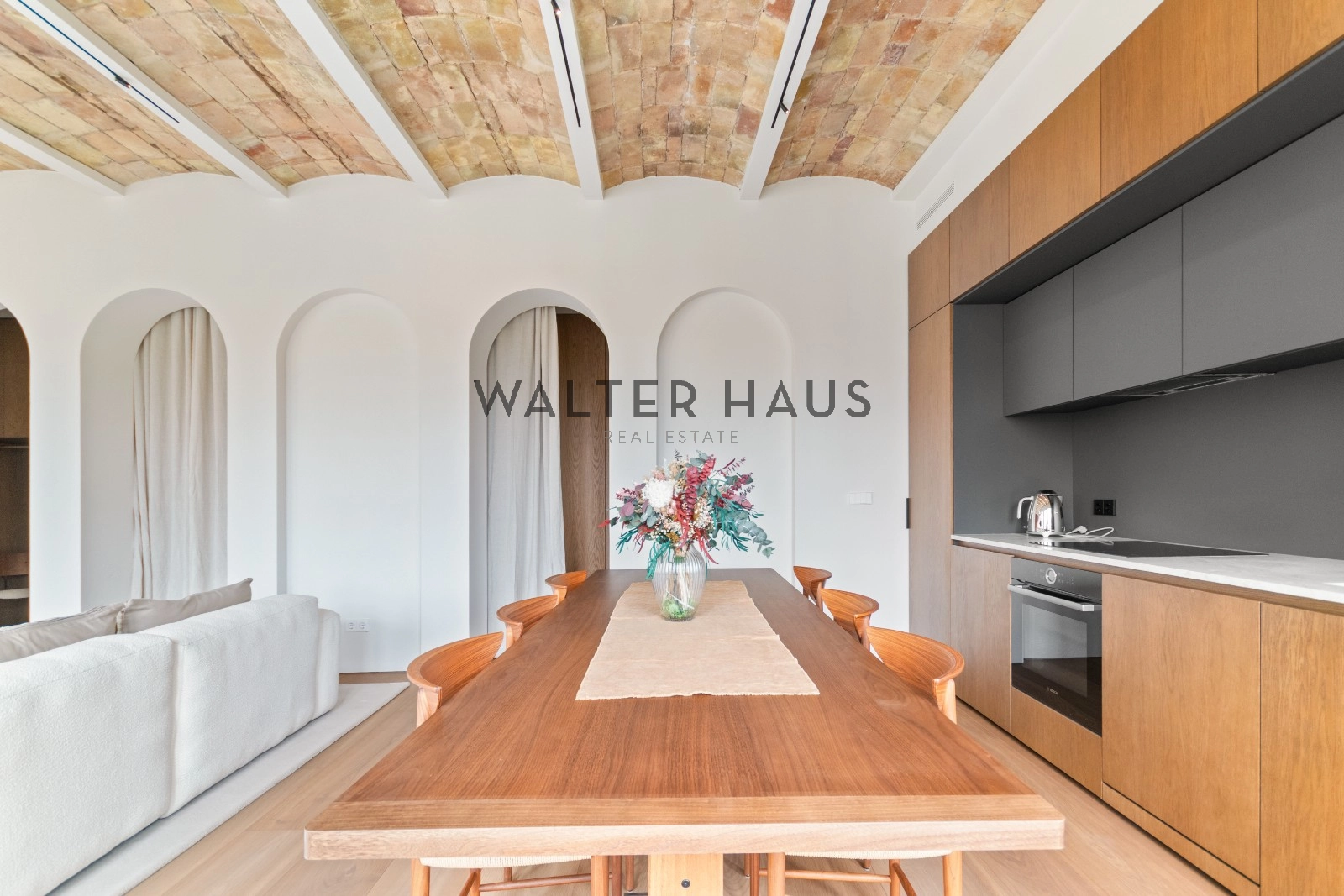 El interior de la vivienda ha sido renovado con materiales de alta gama y un diseño único en cada espacio. El salón-comedor se integra perfectamente con la cocina abierta, equipada con electrodomésticos de última generación, mobiliario en roble natural de la marca PORTET y encimera Neolith. Los suelos de madera AVAWOOD en roble báltico aportan calidez y distinción. Dispone de dos habitaciones dobles pensadas para el confort y la privacidad, una de ellas en tipo suite con un baño estilo spa y acceso a la terraza. Dos baños completos adicionales complementan la vivienda, los cuales incorporan revestimientos de cemento pulido, un material duradero y estéticamente cuidado, además de elementos de diseño de marcas como Geberit y JNF. La reforma mantiene los techos originales de vuelta catalana, sumando valor arquitectónico y autenticidad.
