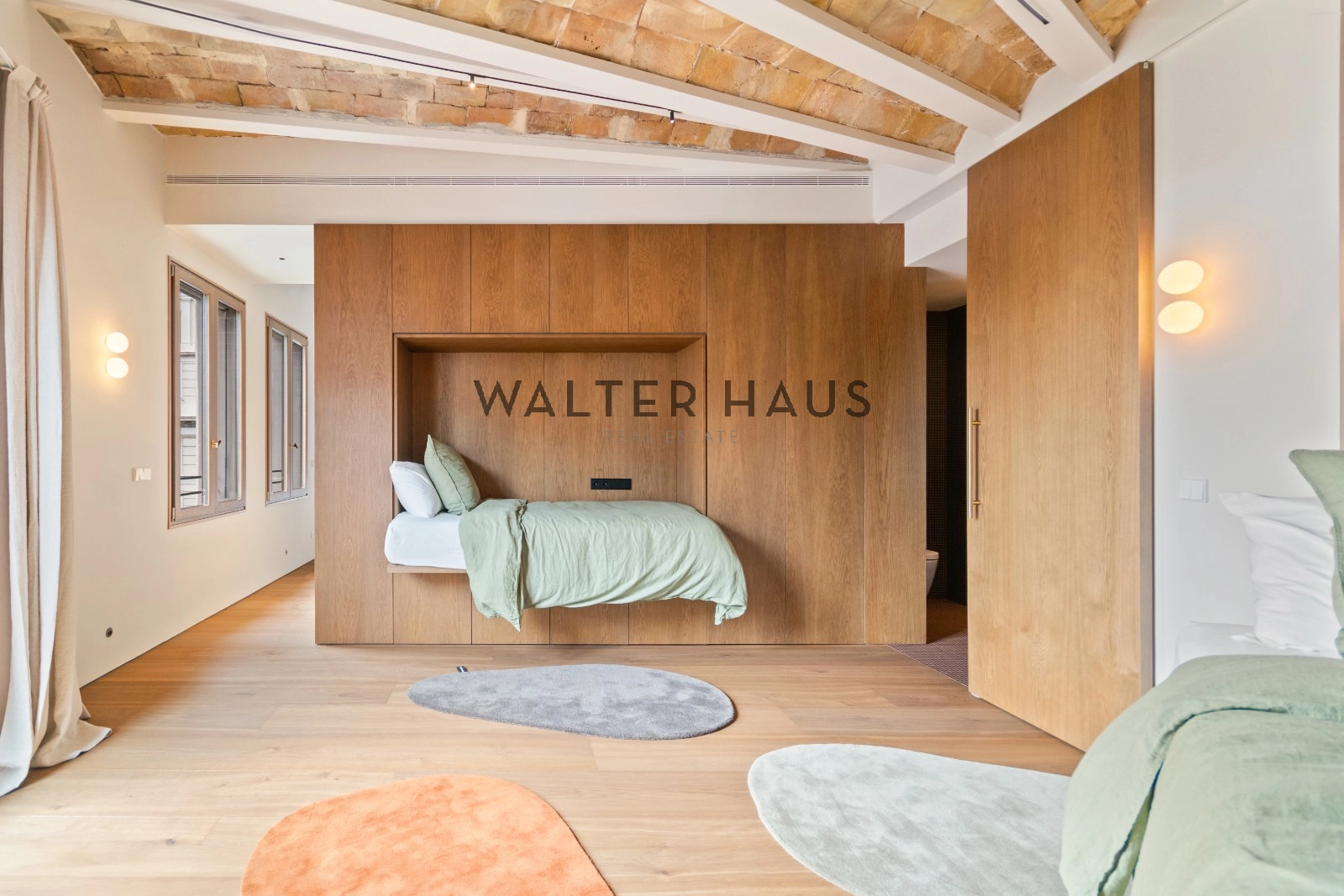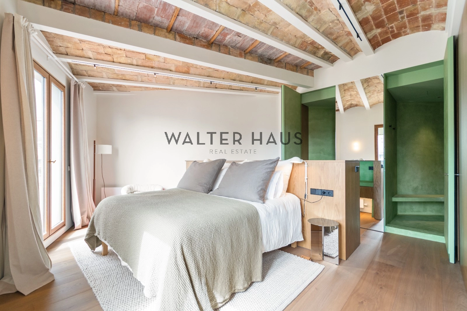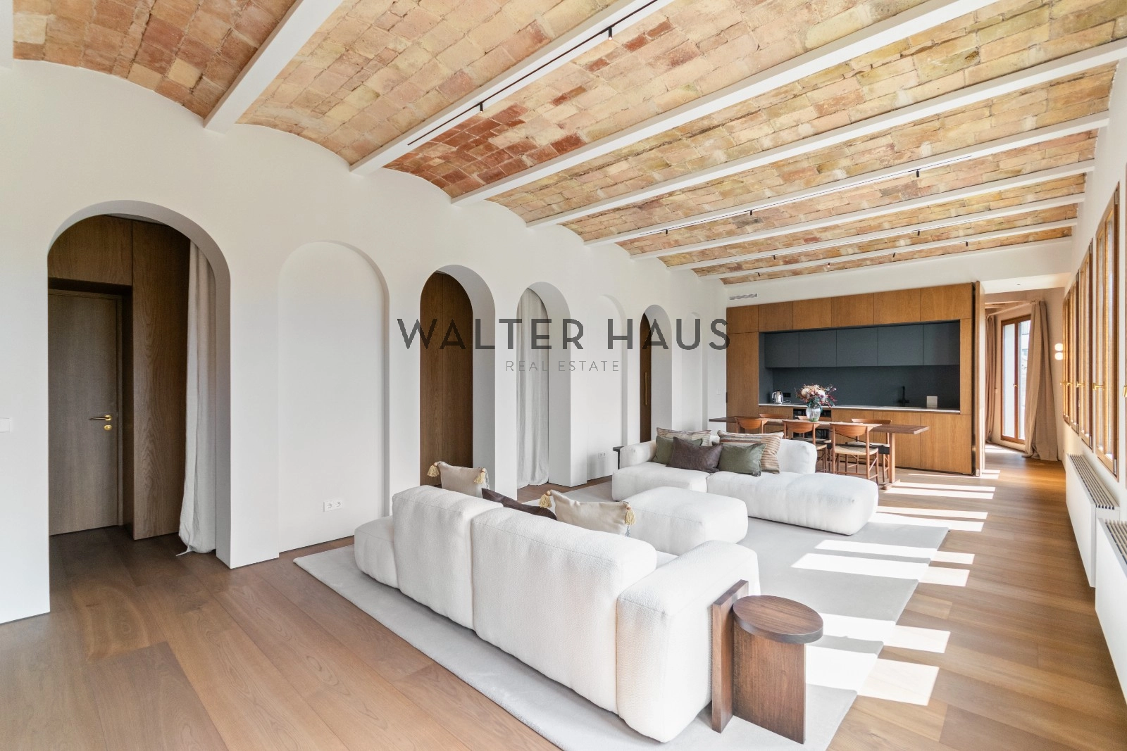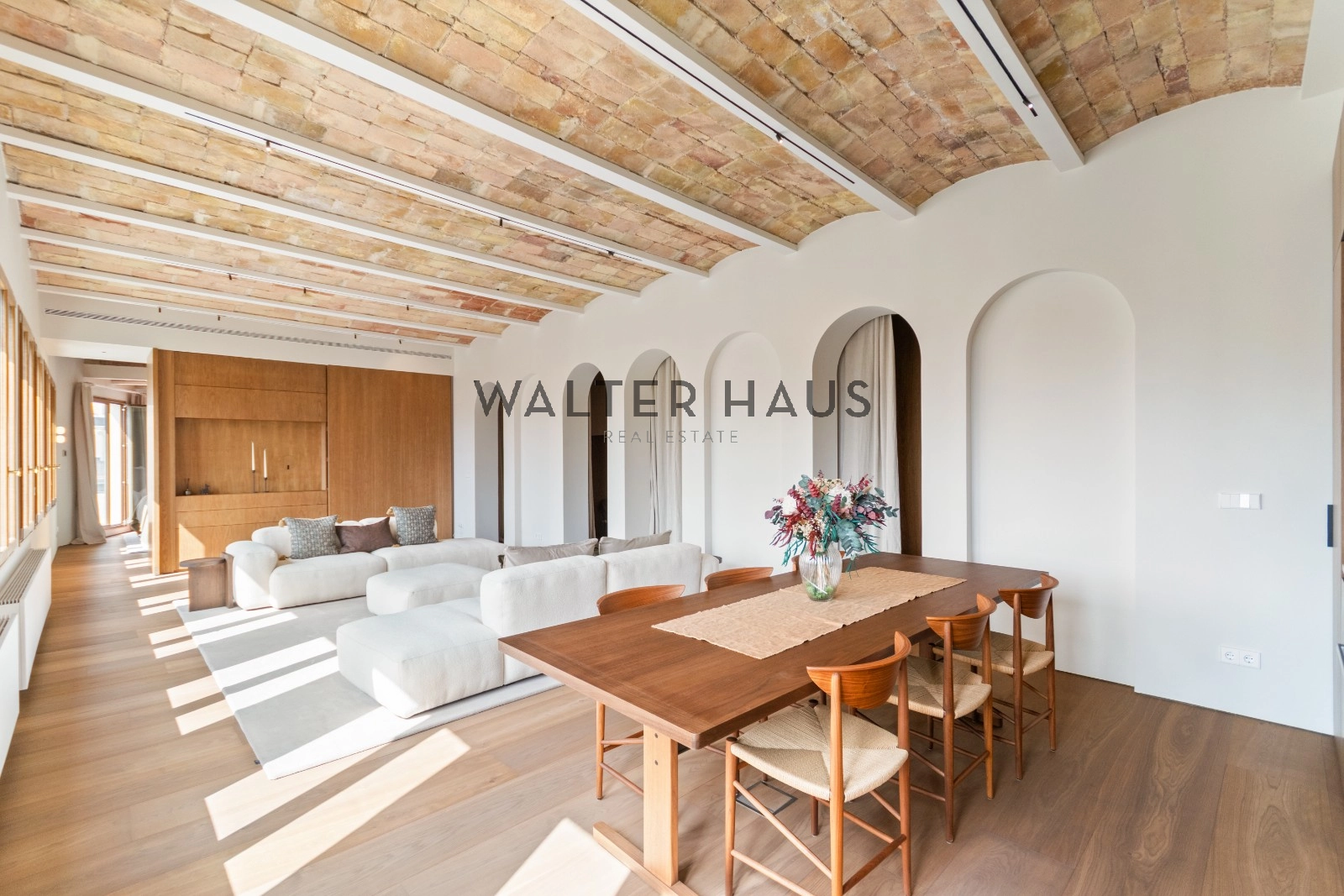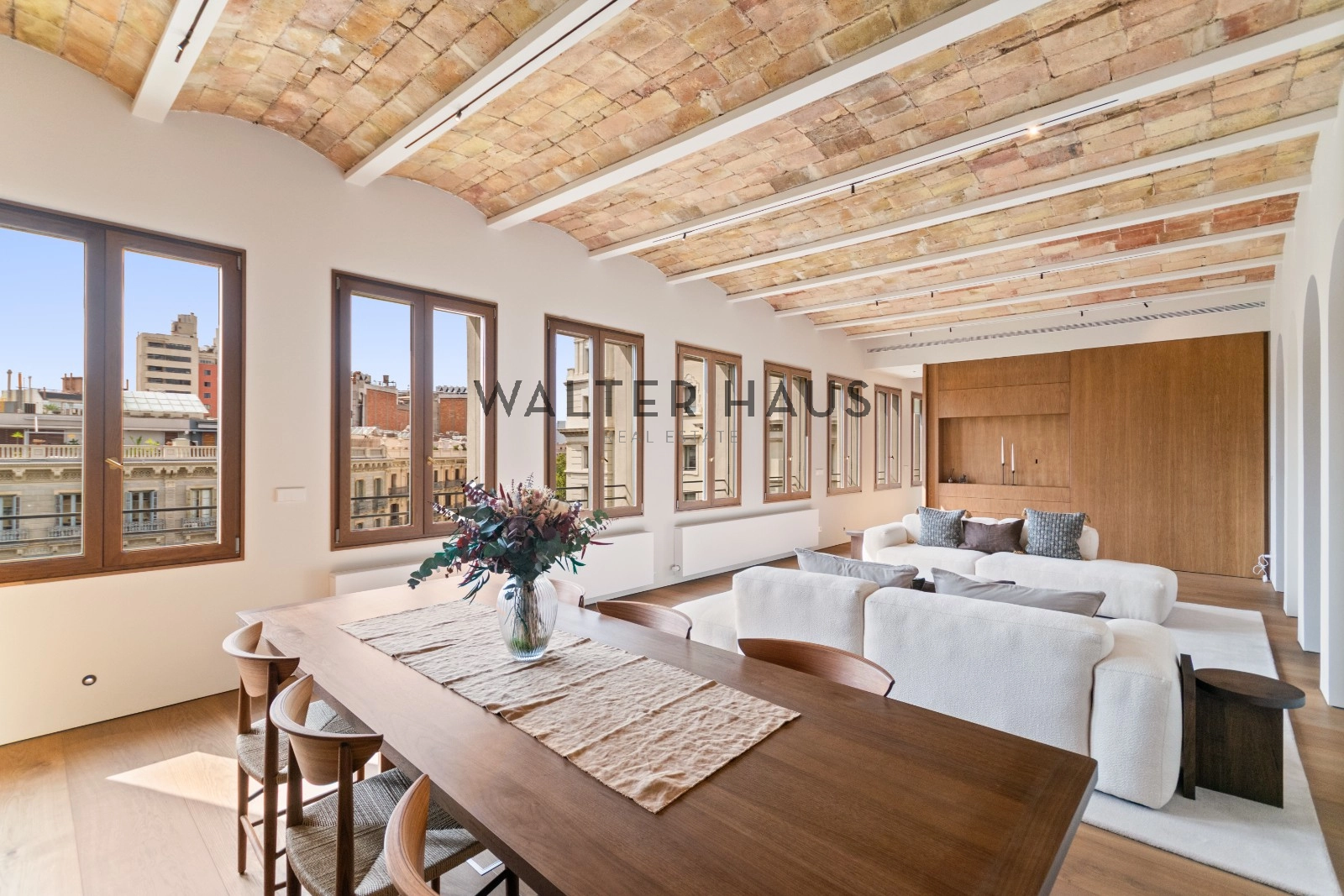 El interior de la vivienda ha sido renovado con materiales de alta gama y un diseño único en cada espacio. El salón-comedor se integra perfectamente con la cocina abierta, equipada con electrodomésticos de última generación, mobiliario en roble natural de la marca PORTET y encimera Neolith. Los suelos de madera AVAWOOD en roble báltico aportan calidez y distinción. Dispone de dos habitaciones dobles pensadas para el confort y la privacidad, una de ellas en tipo suite con un baño estilo spa y acceso a la terraza. Dos baños completos adicionales complementan la vivienda, los cuales incorporan revestimientos de cemento pulido, un material duradero y estéticamente cuidado, además de elementos de diseño de marcas como Geberit y JNF. La reforma mantiene los techos originales de vuelta catalana, sumando valor arquitectónico y autenticidad.