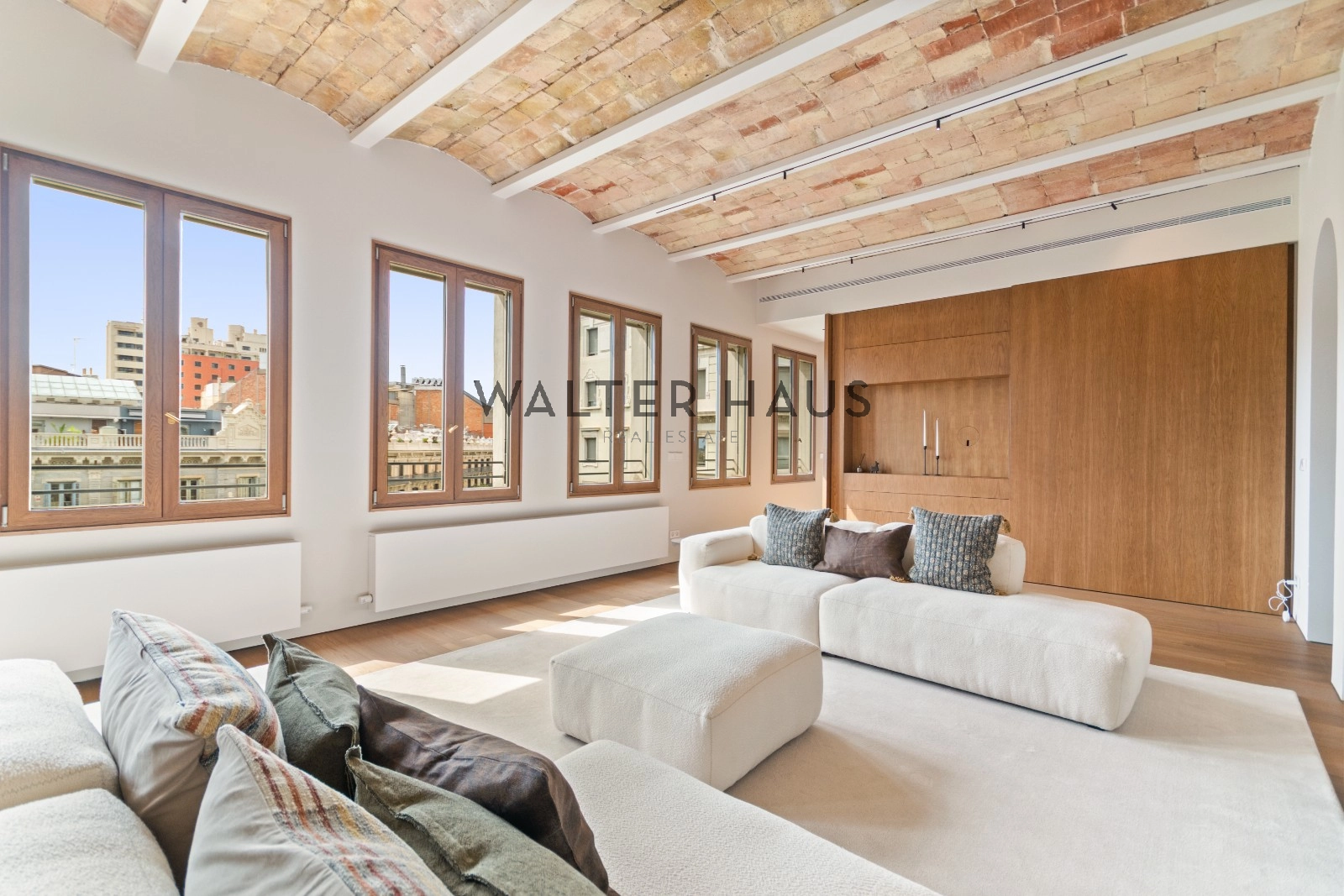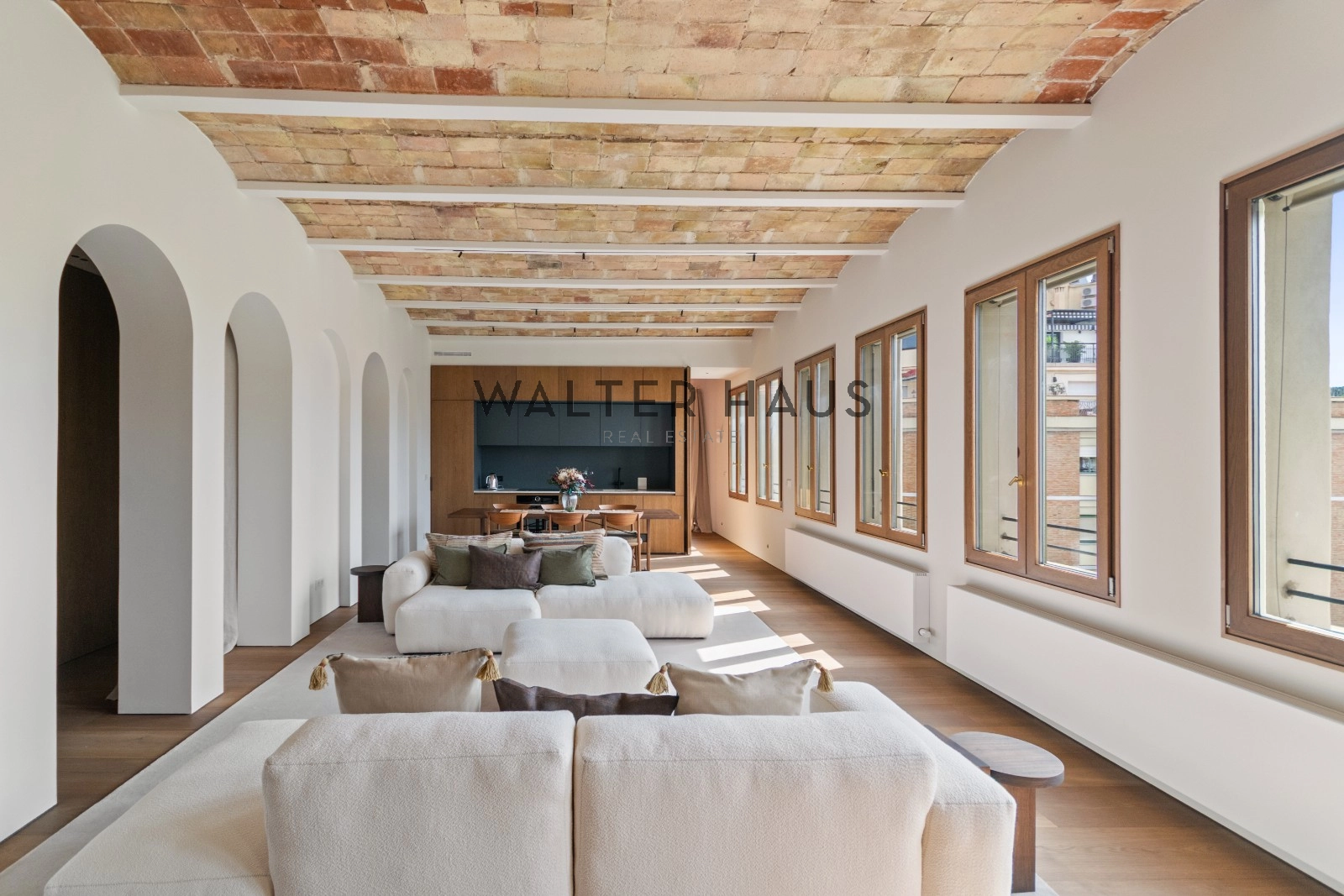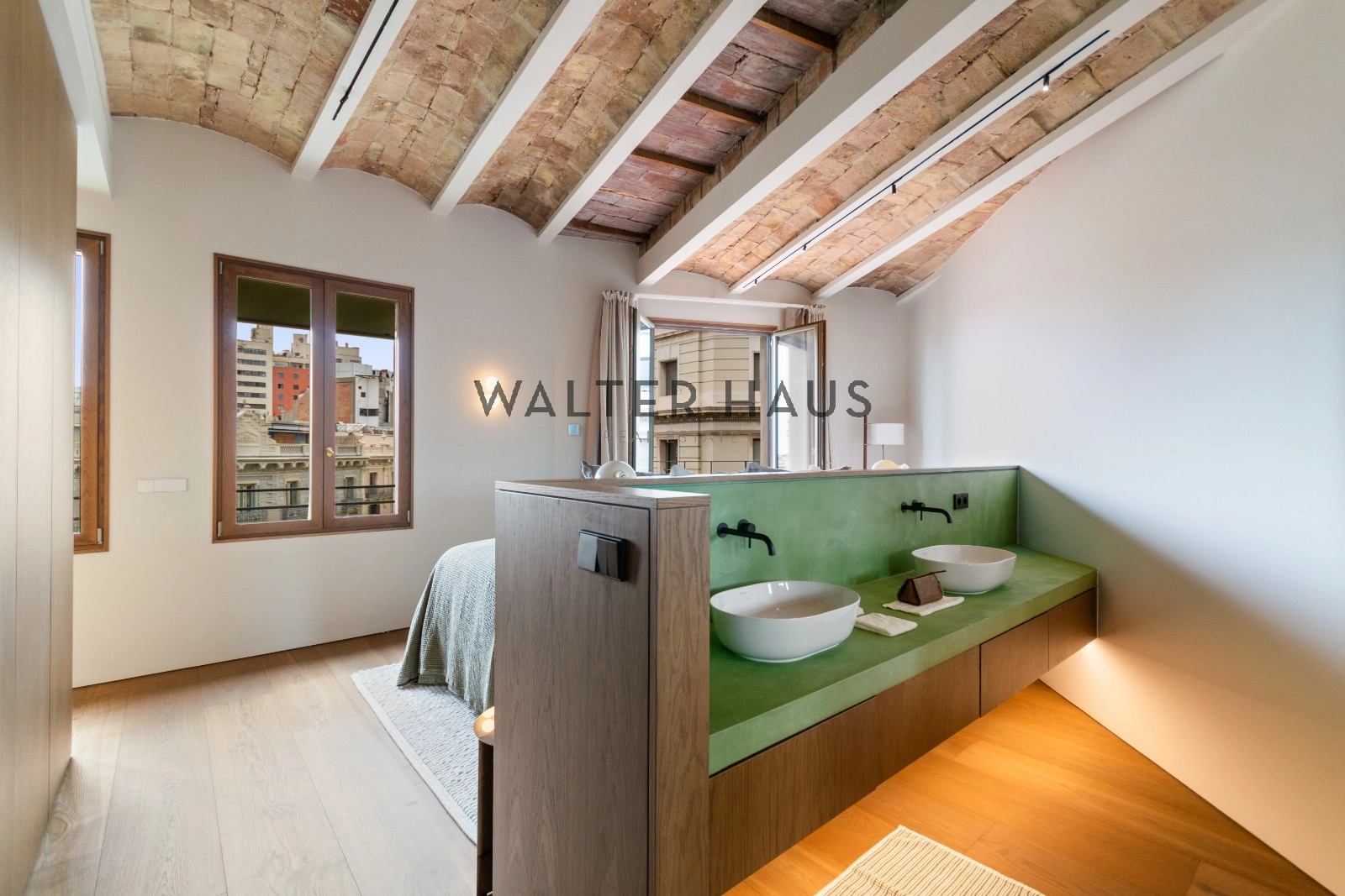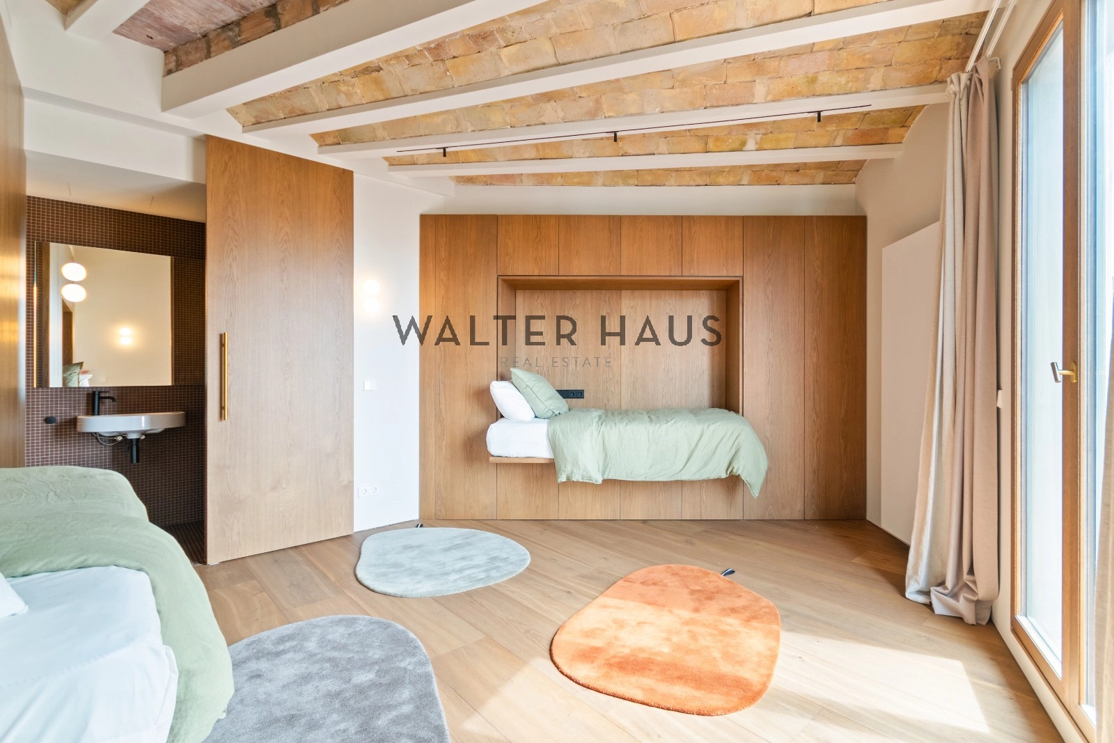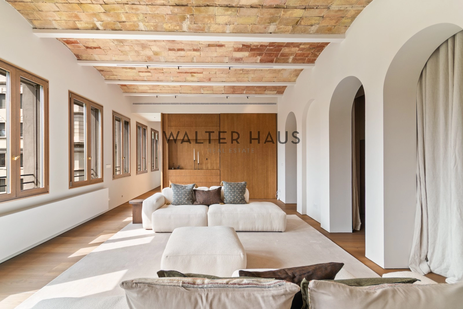 El interior de la vivienda ha sido renovado con materiales de alta gama y un diseño único en cada espacio. El salón-comedor se integra perfectamente con la cocina abierta, equipada con electrodomésticos de última generación, mobiliario en roble natural de la marca PORTET y encimera Neolith. Los suelos de madera AVAWOOD en roble báltico aportan calidez y distinción. Dispone de dos habitaciones dobles pensadas para el confort y la privacidad, una de ellas en tipo suite con un baño estilo spa y acceso a la terraza. Dos baños completos adicionales complementan la vivienda, los cuales incorporan revestimientos de cemento pulido, un material duradero y estéticamente cuidado, además de elementos de diseño de marcas como Geberit y JNF. La reforma mantiene los techos originales de vuelta catalana, sumando valor arquitectónico y autenticidad.