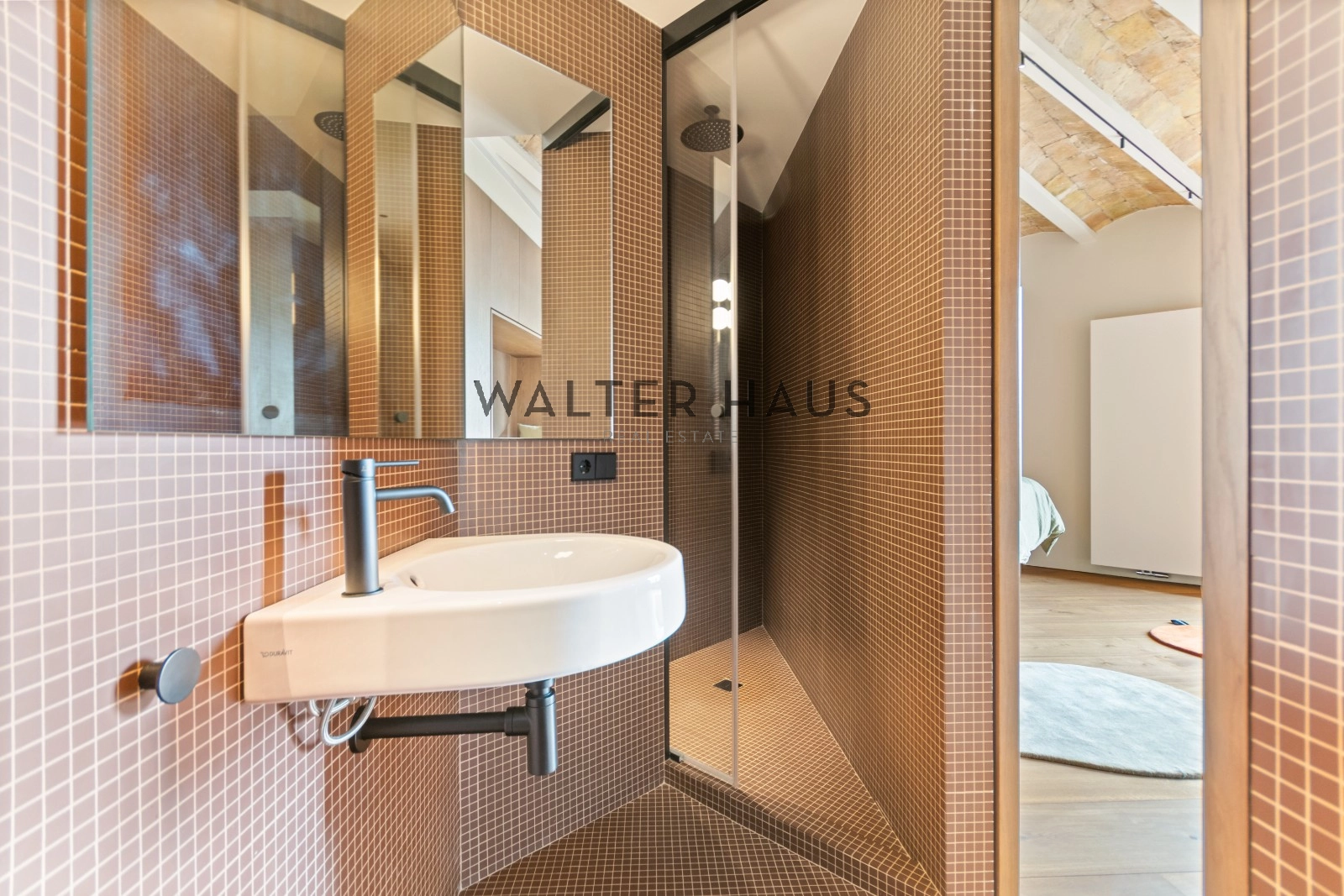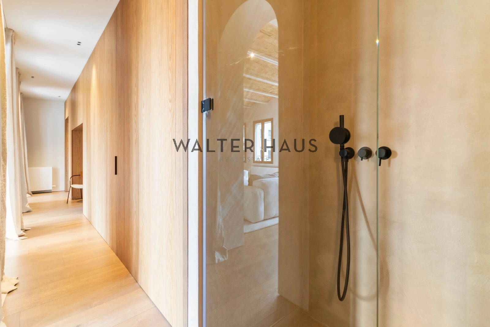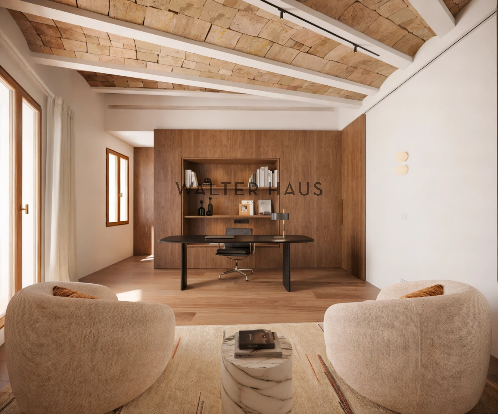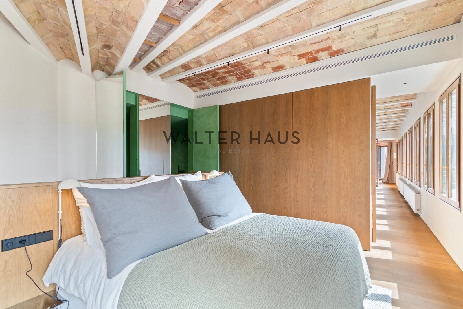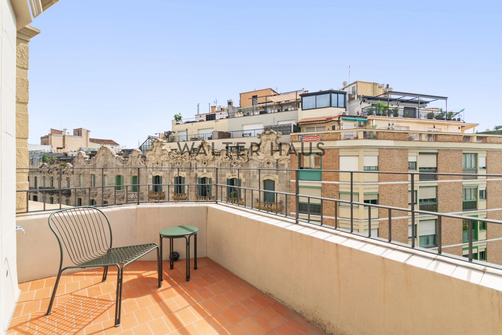 El interior de la vivienda ha sido renovado con materiales de alta gama y un diseño único en cada espacio. El salón-comedor se integra perfectamente con la cocina abierta, equipada con electrodomésticos de última generación, mobiliario en roble natural de la marca PORTET y encimera Neolith. Los suelos de madera AVAWOOD en roble báltico aportan calidez y distinción. Dispone de dos habitaciones dobles pensadas para el confort y la privacidad, una de ellas en tipo suite con un baño estilo spa y acceso a la terraza. Dos baños completos adicionales complementan la vivienda, los cuales incorporan revestimientos de cemento pulido, un material duradero y estéticamente cuidado, además de elementos de diseño de marcas como Geberit y JNF. La reforma mantiene los techos originales de vuelta catalana, sumando valor arquitectónico y autenticidad.