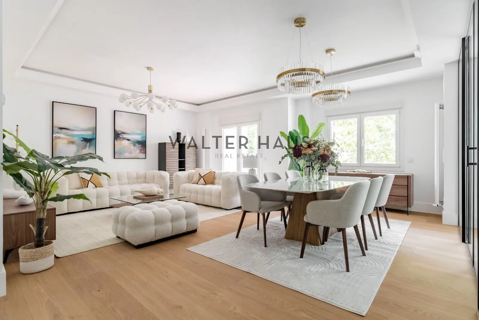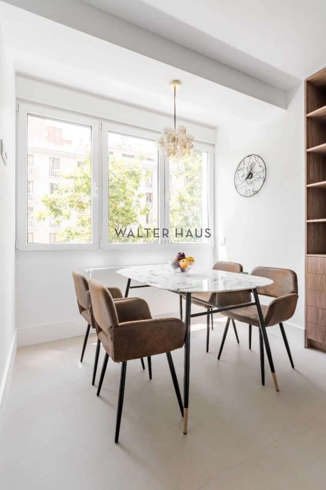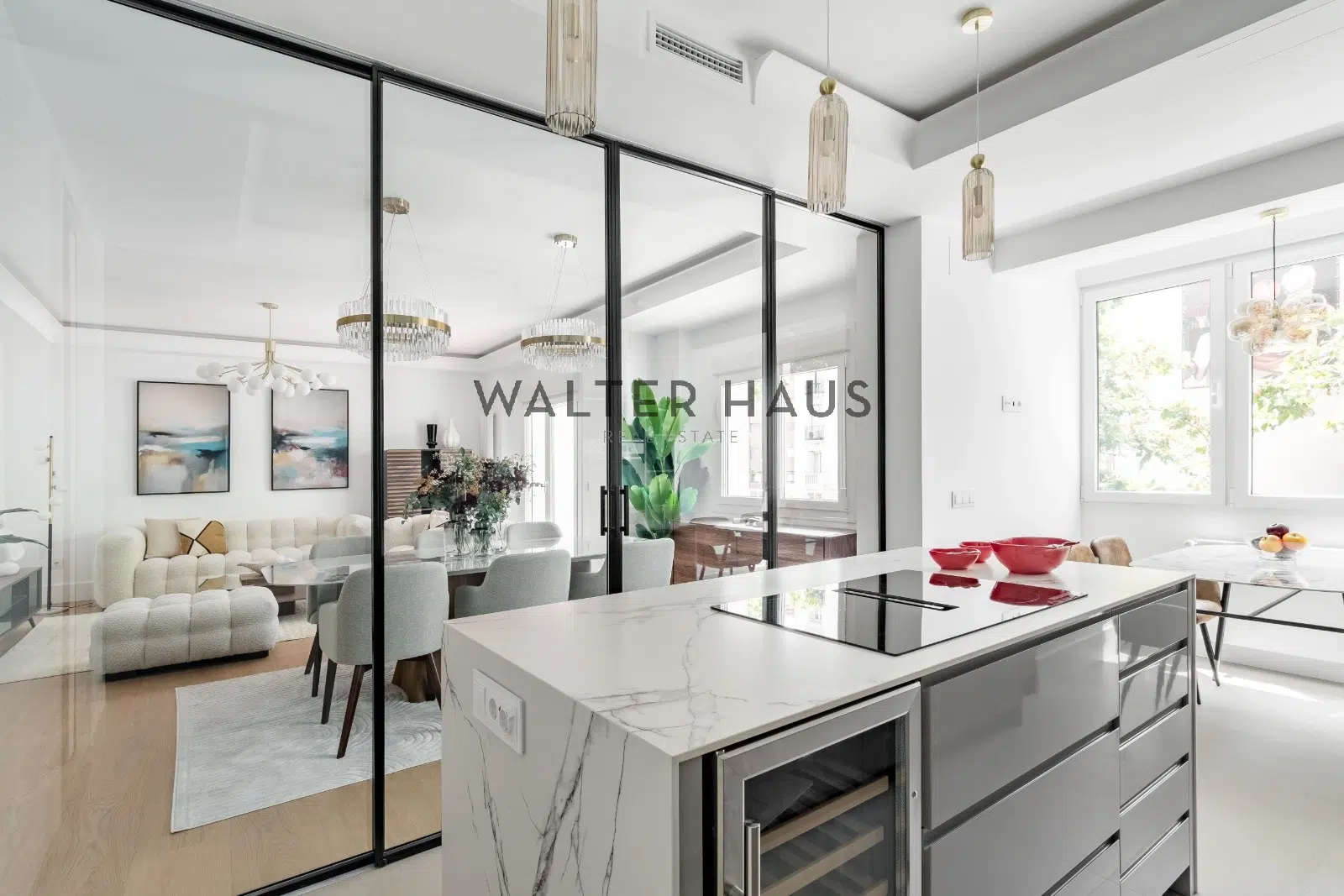 Un pequeño hall de entrada conduce directamente a un salón totalmente diáfano, donde se definen claramente tres ambientes: la confortable zona de estar con acceso a una agradable terraza, ideal para un café matutino o un momento de lectura; un amplio comedor con capacidad para hasta seis comensales; y la moderna cocina, semi integrada y con la posibilidad de quedar separada por unas preciosas puertas acristaladas, lo que aporta versatilidad y luz. La cocina, funcional y con excelente capacidad de almacenamiento, está equipada con electrodomésticos empotrados que se integran a la perfección con el diseño.