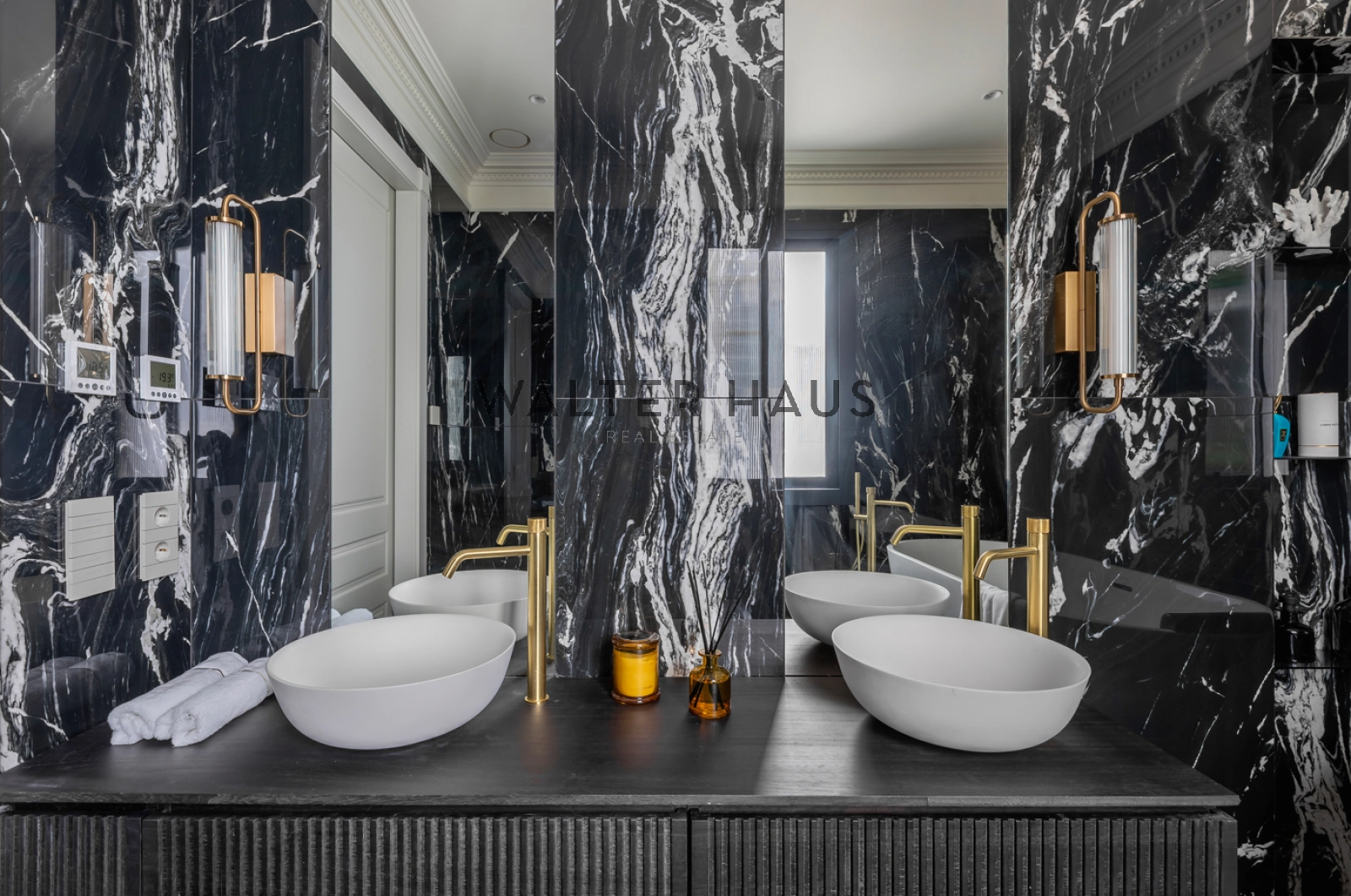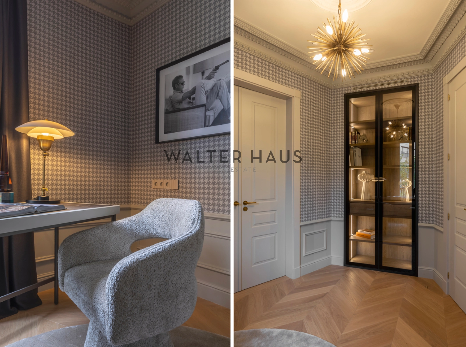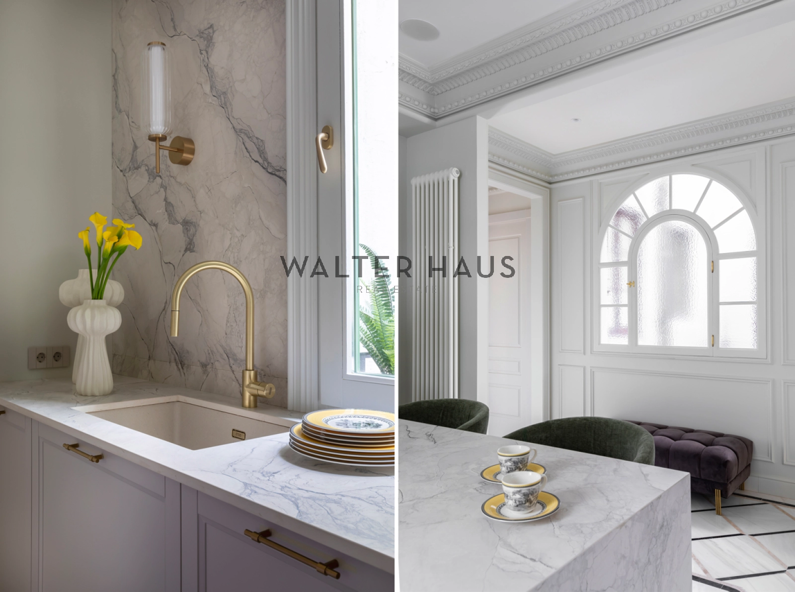 Cada rincón de la vivienda refleja una atención excepcional por los acabados. La cocina italiana Novacucina está completamente equipada con electrodomésticos Smeg, cuenta con una amplia isla y una bodega integrada. Los materiales destacan por su elegancia: suelos de roble en espiga francesa, mármol natural y cornisas de yeso trabajadas a mano. Los techos de tres metros de altura y la iluminación indirecta aportan una atmósfera cálida y sofisticada. Además, dispone de lavadero oculto, armarios empotrados con iluminación LED, altavoces integrados, chimenea de mármol con fuego de bioetanol y calefacción por suelo radiante en cocina, baños y recibidor.