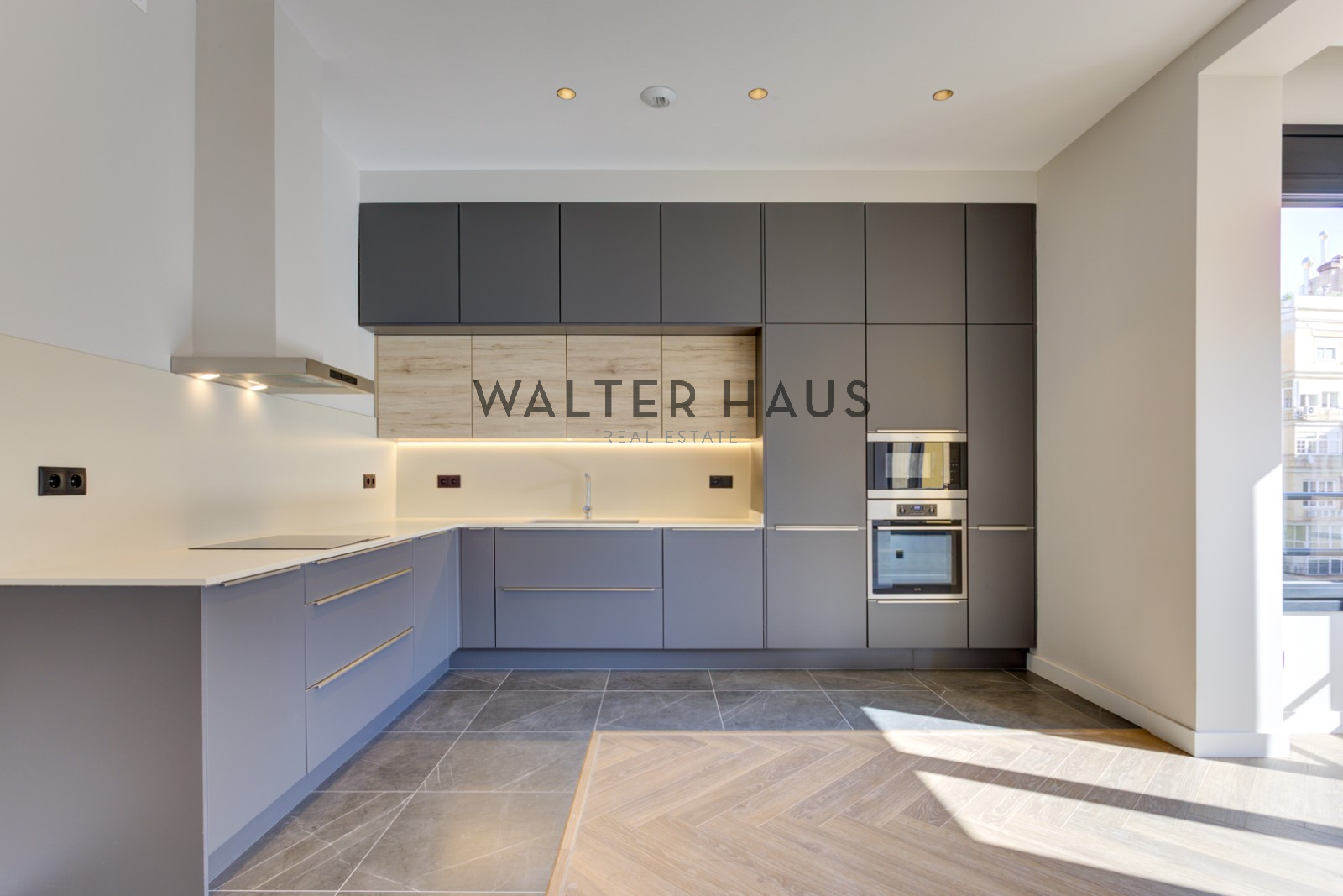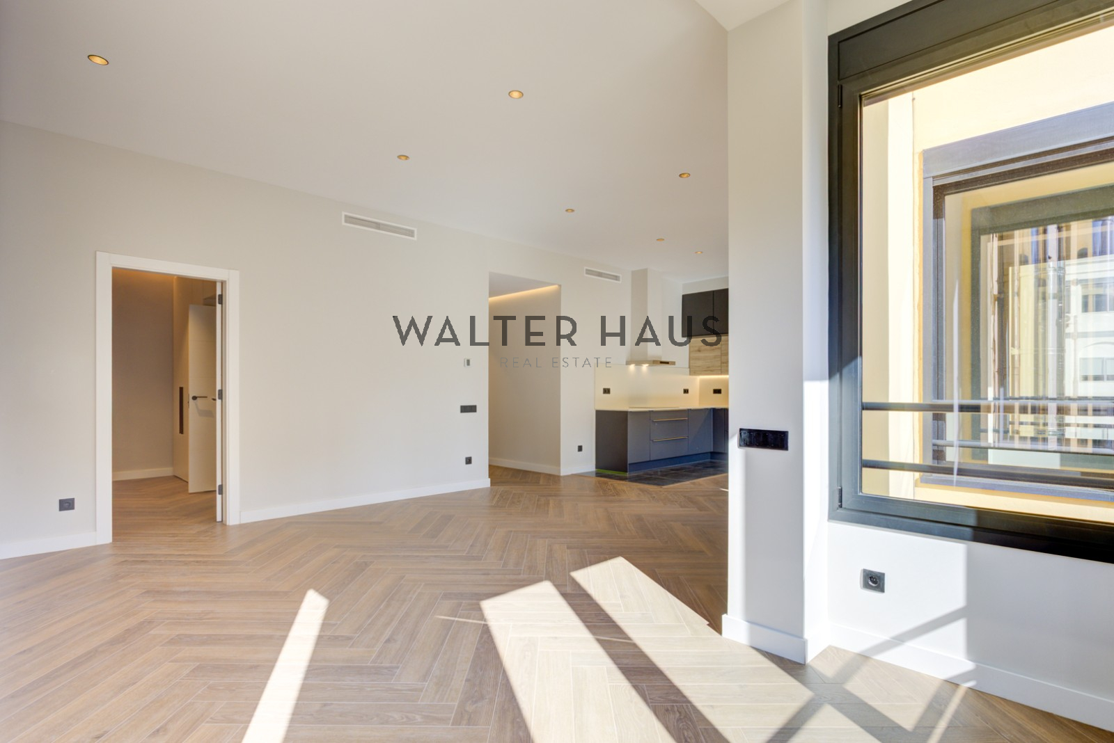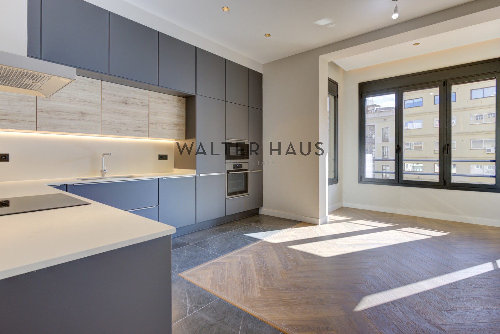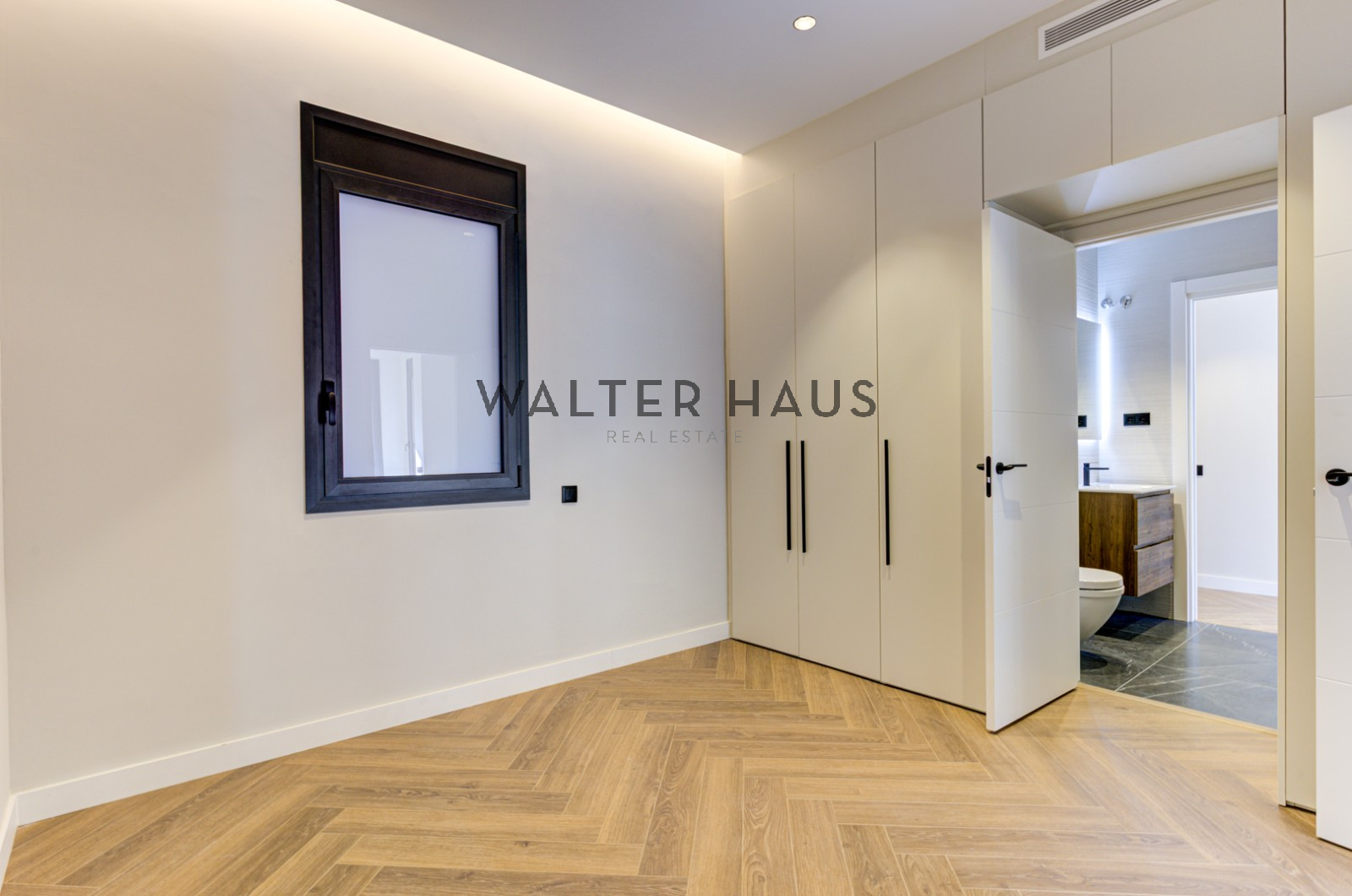 El piso cuenta con cuatro dormitorios cuidadosamente diseñados, uno de ellos con acceso a una terraza privada de 2,5 m² con suelos de exterior de alta calidad. El dormitorio principal de 14,6 m² y los dos adicionales de 13,2 m² disponen de armarios lacados a medida. La vivienda ofrece tres baños de diseño: un baño completo con encimeras de mármol y ducha de lluvia, un aseo de cortesía y un baño en suite con suelo radiante. En la zona principal se encuentra una amplia cocina abierta de 42,3 m² con salón y comedor, equipada con electrodomésticos de última generación, encimeras de cuarzo e iluminación inteligente.