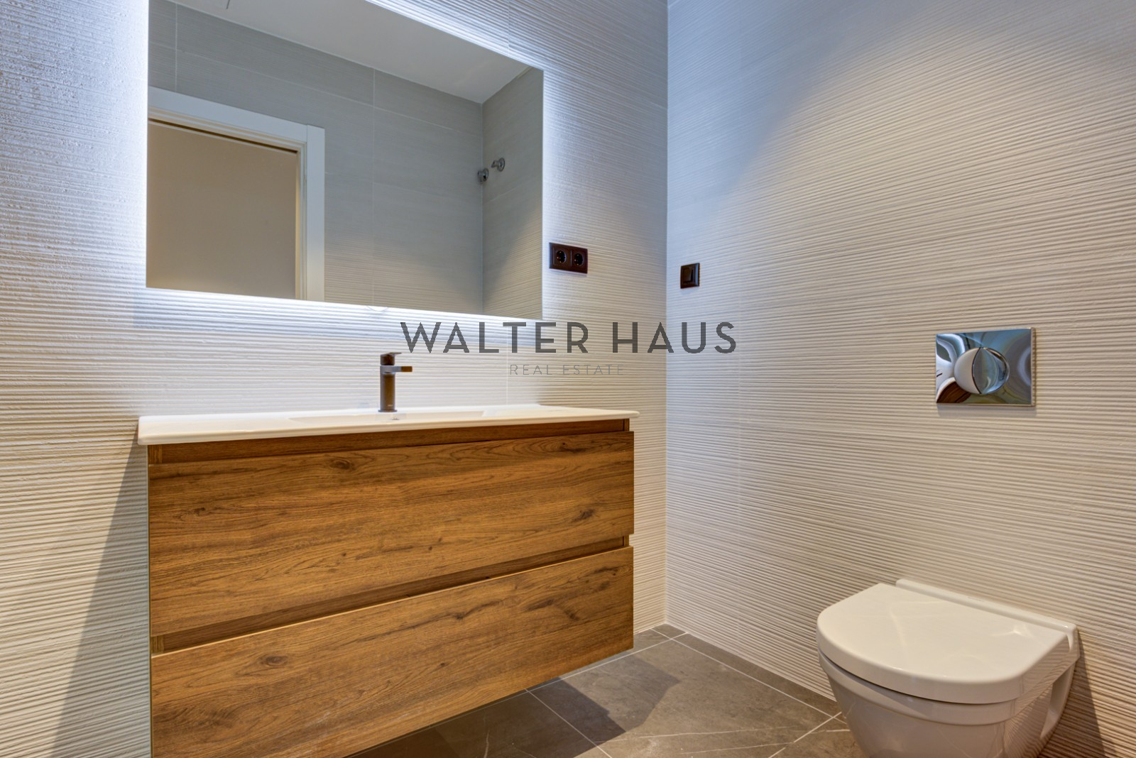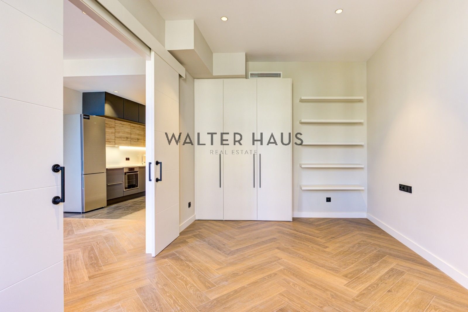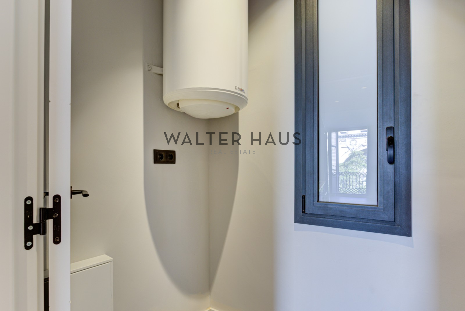 La vivienda cuenta con una sala de estar de planta abierta de unos 24 m² que integra la cocina, el comedor y el salón en un único espacio fluido. La cocina de diseño está equipada con electrodomésticos de alta gama y encimeras de materiales nobles. El dormitorio principal, de aproximadamente 16 m², dispone de un baño en suite de líneas modernas y elegantes, mientras que el segundo dormitorio, de unos 10 m², tiene acceso a un baño independiente. Además, el piso incluye un lavadero de 2 m² y dos balcones con vistas a las animadas calles del Eixample.