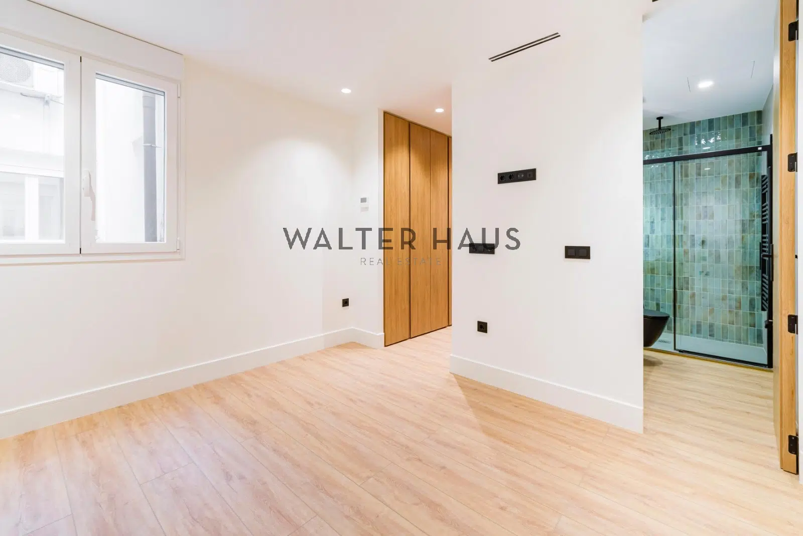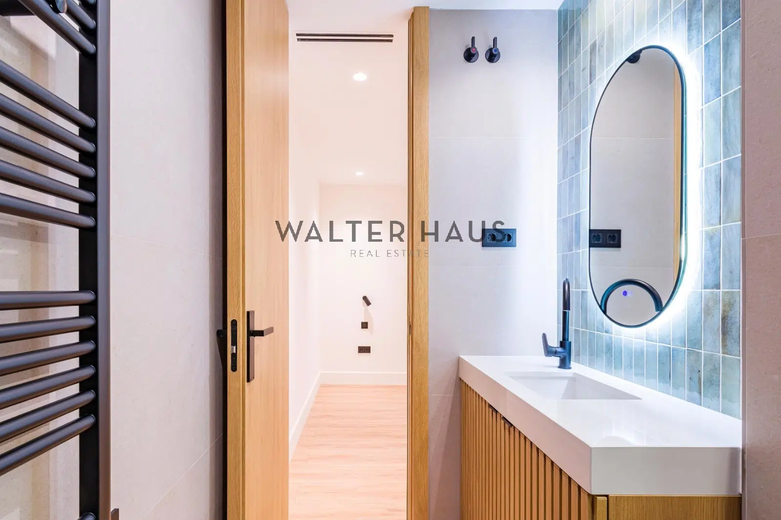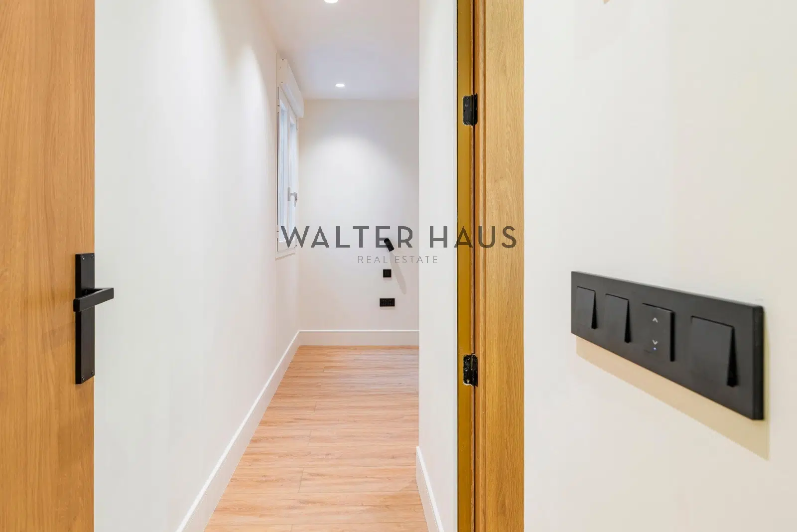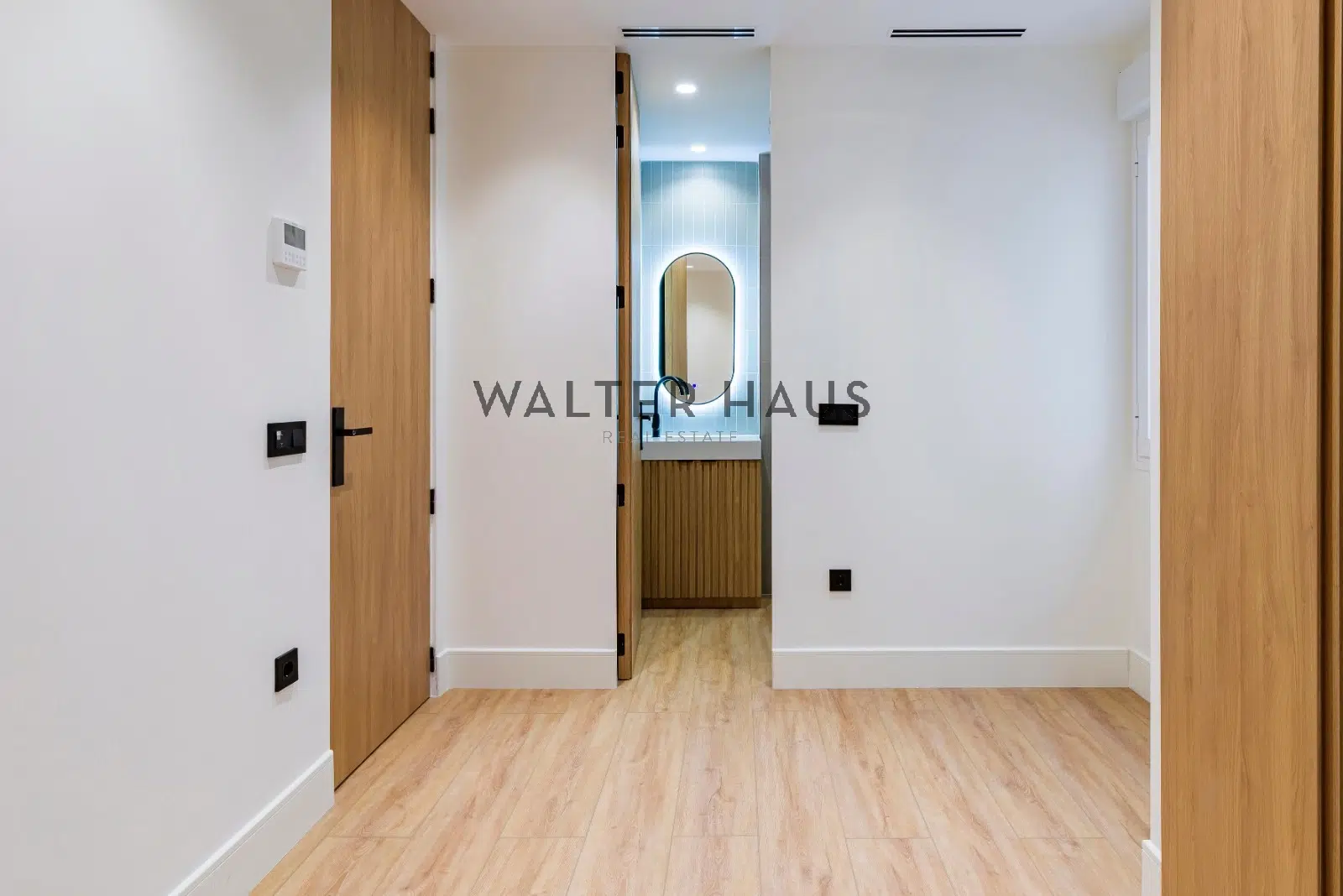 En cuanto a los detalles técnicos y constructivos, la reforma ha sido ejecutada con materiales de alta calidad. El piso dispone de tres amplias habitaciones, cada una de ellas configurada con baño en suite para asegurar la total privacidad de sus habitantes. La zona social se integra armoniosamente con una cocina de diseño moderno, completamente equipada con electrodomésticos de última generación. Los suelos de madera natural recorren toda la propiedad, aportando un carácter único y una calidez excepcional a cada estancia, mientras que el sistema de climatización por conducto garantiza una temperatura ideal en cualquier época del año.