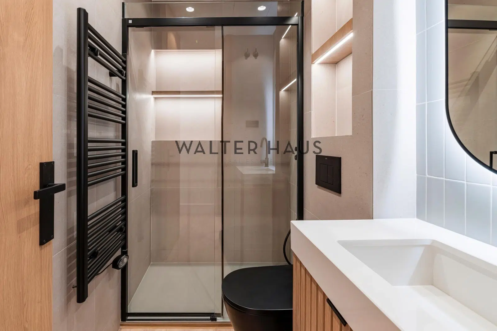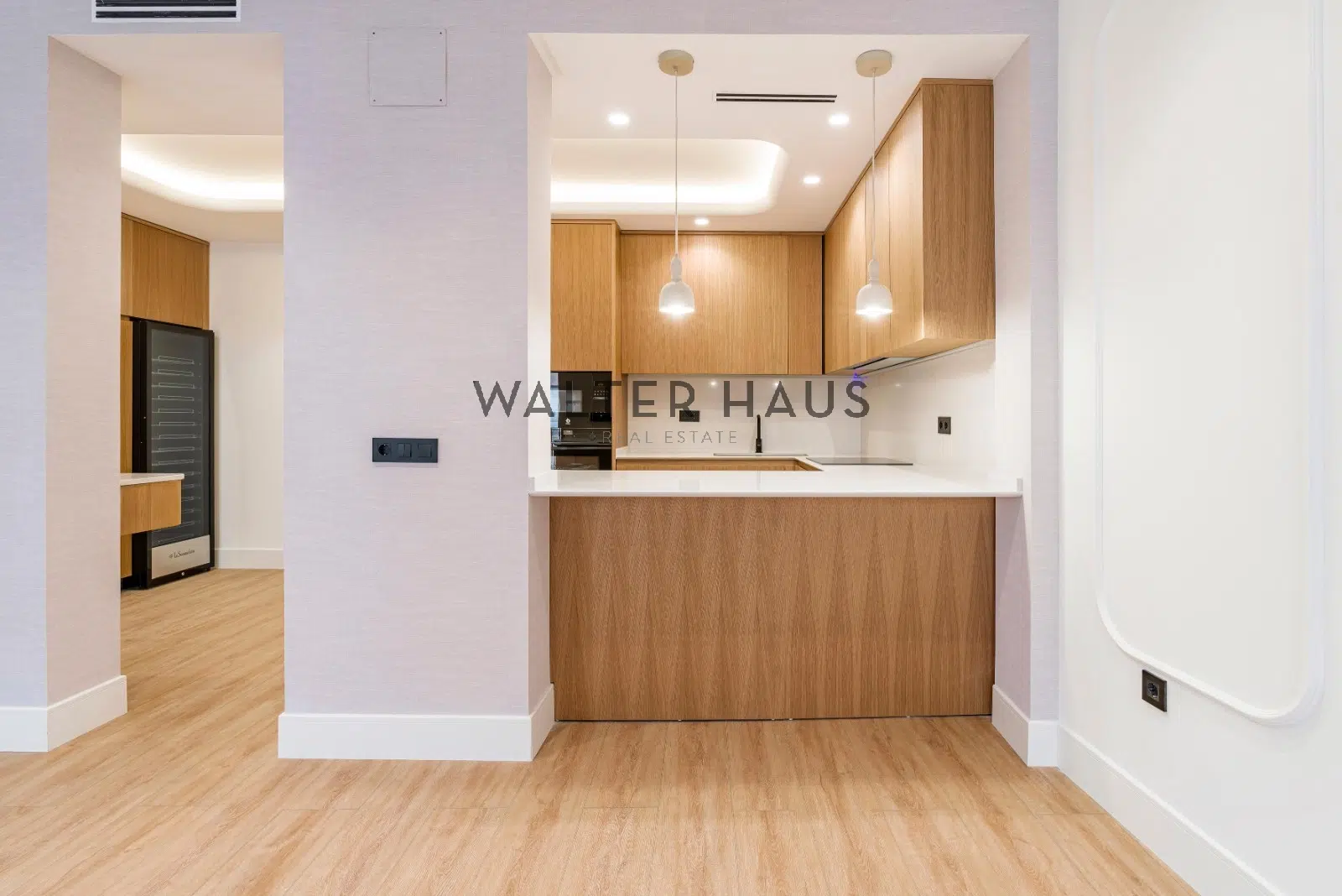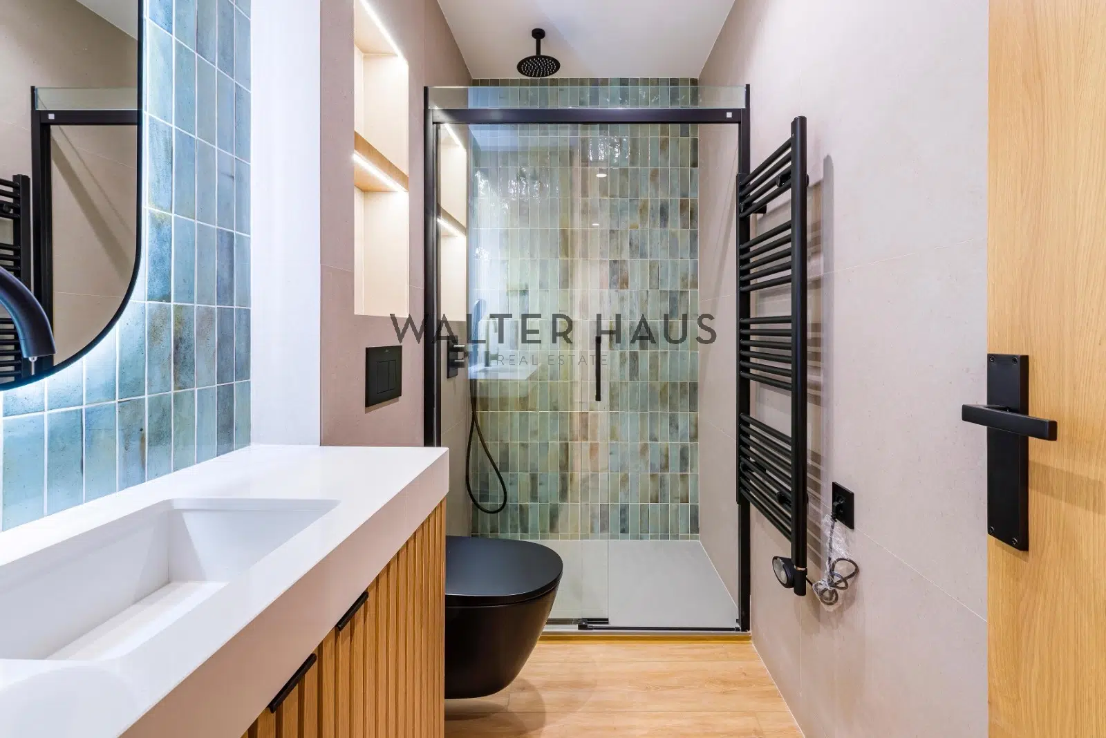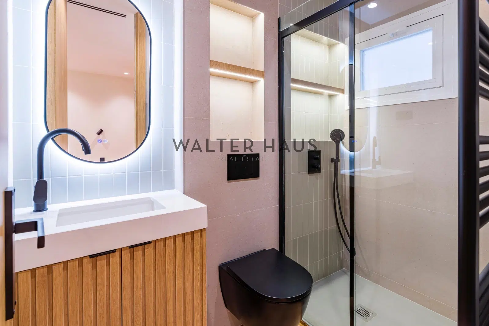 En cuanto a los detalles técnicos y constructivos, la reforma ha sido ejecutada con materiales de alta calidad. El piso dispone de tres amplias habitaciones, cada una de ellas configurada con baño en suite para asegurar la total privacidad de sus habitantes. La zona social se integra armoniosamente con una cocina de diseño moderno, completamente equipada con electrodomésticos de última generación. Los suelos de madera natural recorren toda la propiedad, aportando un carácter único y una calidez excepcional a cada estancia, mientras que el sistema de climatización por conducto garantiza una temperatura ideal en cualquier época del año.