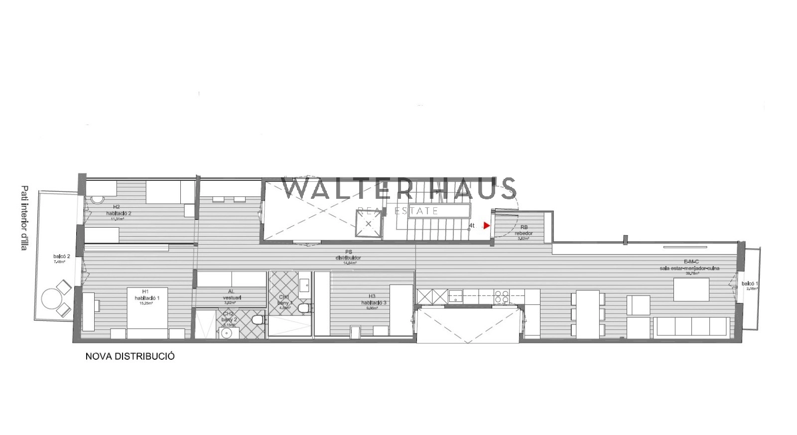 La propiedad cuenta con tres habitaciones, una de ellas tipo suite con baño privado y acceso a la terraza con vistas al interior, y dos habitaciones dobles – una de las cuales tiene acceso a la terraza que comparte con la habitación principal. Además, la vivienda cuenta con un baño completo. El gran salón-comedor ofrece vistas al exterior desde el balcón, inundando el espacio de luz natural. La cocina en tipo office equipada es ideal para aquellos que disfrutan de la gastronomía y la compañía, ya que se conecta perfectamente con los espacios.
