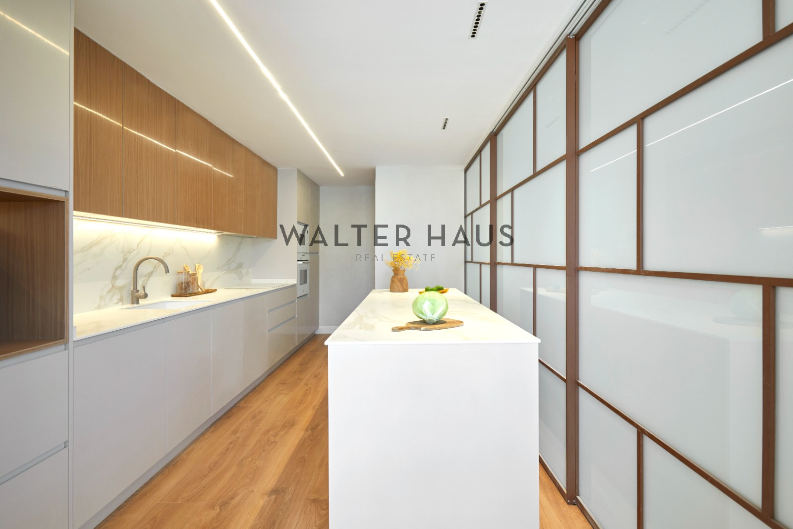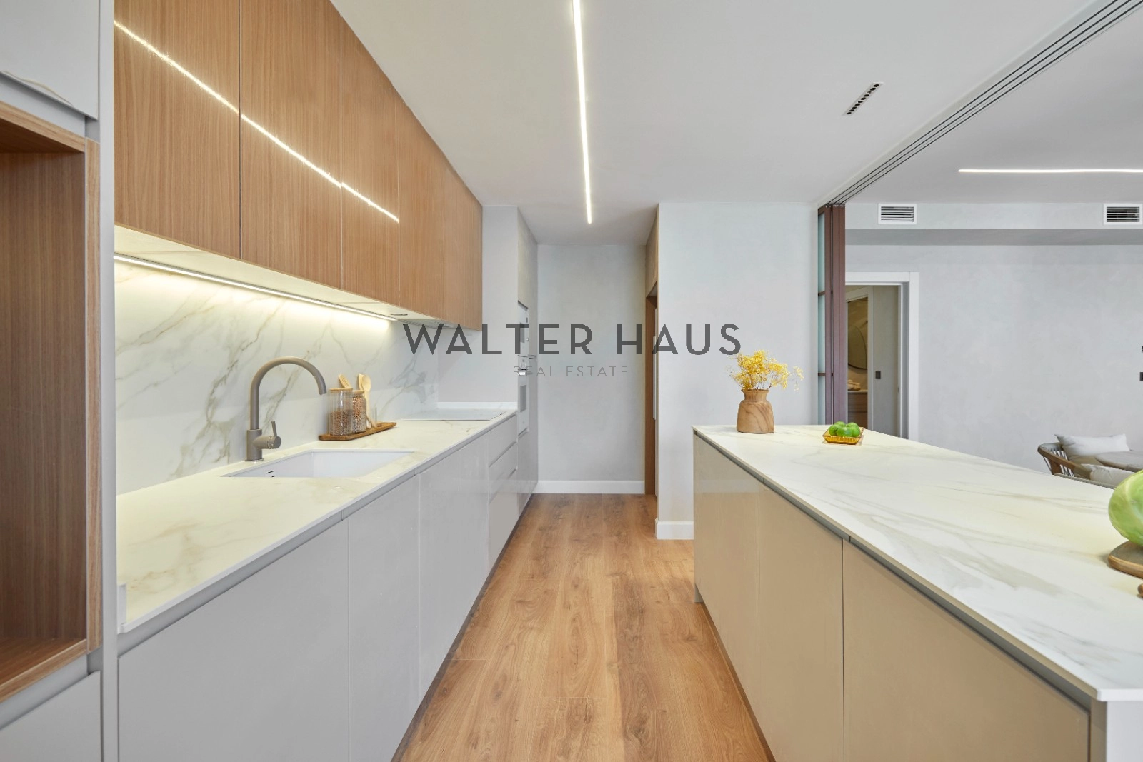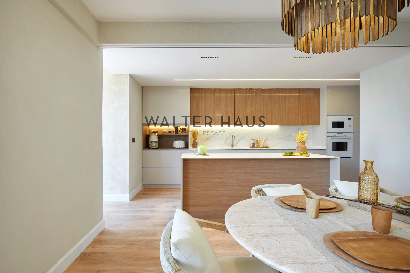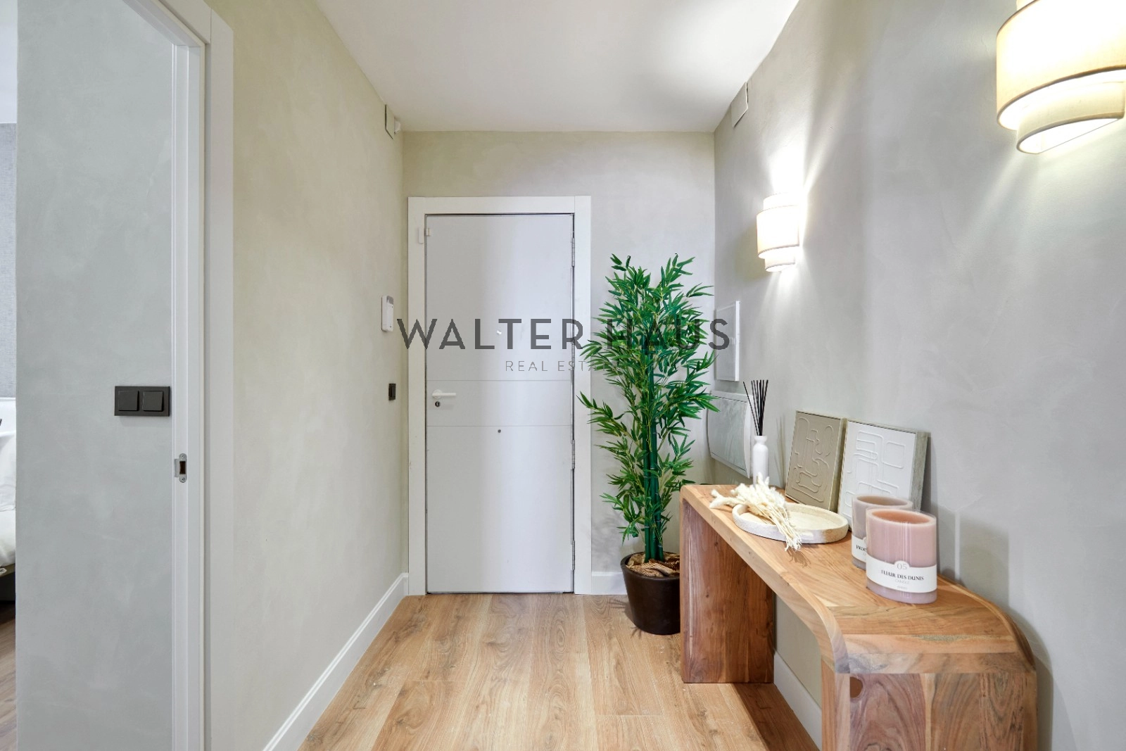 La vivienda dispone de un amplio salón con chimenea de hierro flotante y acceso directo a una terraza acristalada con cristales de doble cámara, los cuales pueden abrirse totalmente, creando un espacio exterior integrado al salón. La cocina es abierta, equipada con electrodomésticos de alta gama, ideal para quienes valoran la funcionalidad sin renunciar al estilo. La propiedad cuenta con tres habitaciones dobles, una de ellas tipo suite con vestidor y salida a galería, y otra versátil que puede utilizarse como estudio o segundo vestidor. Además, todo el piso está totalmente amueblado y equipado con un avanzado sistema de domótica.