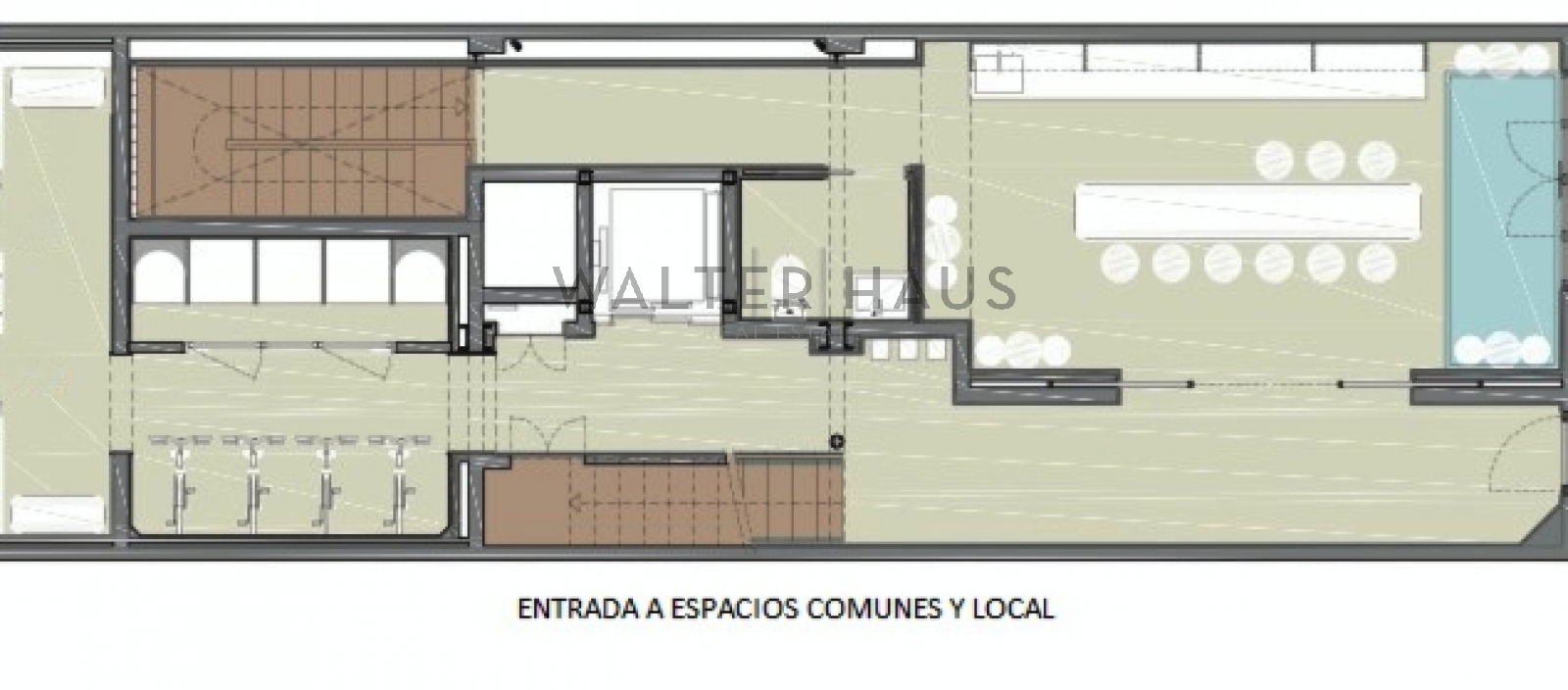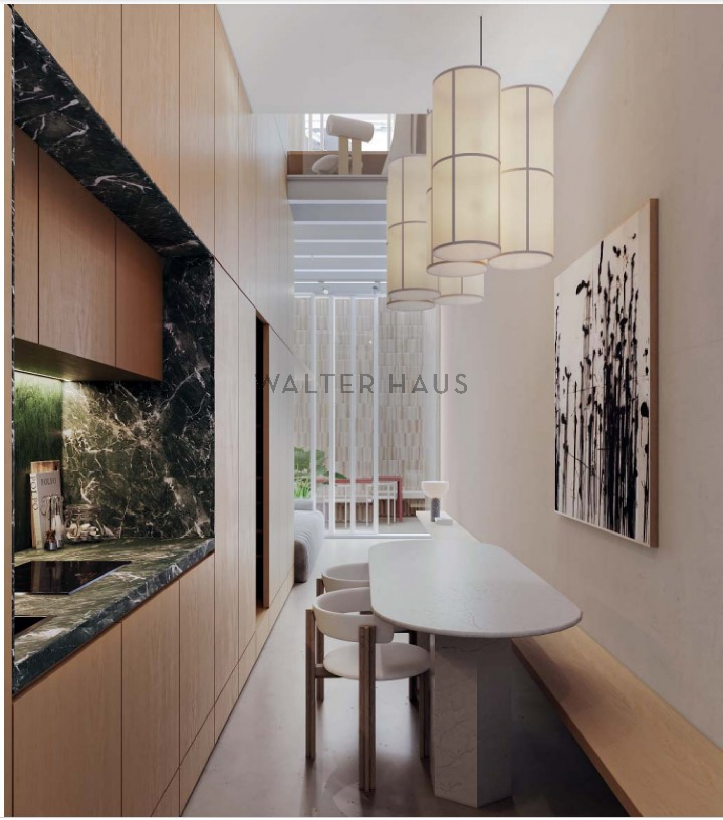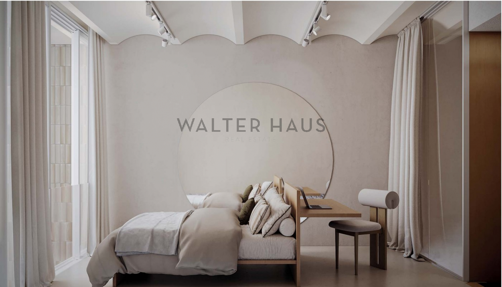 El núcleo central contiene la cocina y el baño. La cocina esta totalmente equipada con electrodoméstico integrados (lavavajillas, horno, horno-microondas, cafetera y frigorífico), griferia zucchetti y encimera marca porcelanosa. El baño esta dividido en tres piezas independientes con acceso doble desde cada dormitorio. Tiene pavimentos continuos, enmarcados de marmol, revestimiento cerámico artesanal, encimera porcelanosa, griferia empotrada, ducha efecto lluvia y armarios a medida. A estos 12 apartamentos se suman 2 loft duplex con altura de 6 metros y ventanales panorámicas a un patio privado. La cocina esta totalmente equipada con electrodoméstico integrados (lavavajillas, horno, horno-microondas, cafetera y frigorífico), griferia zucchetti y encimera marca porcelanosa. El baño tiene pavimentos continuos, revestimiento en cerámica artesanal, encimera porcelanosa, griferia empotrada, ducha efecto lluvia y armarios a medida.